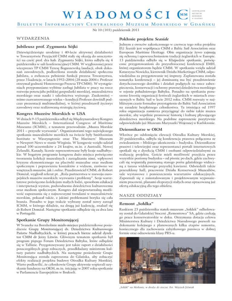 WIADOMOŚCI BIULETYN INFORMACYJNY CENTRALNEGO MUZEUM MORSKIEGO W GDAŃSKU Nr 10 (103) październik 2011 WY DARZENIA Jubileusz prof. Zygmunta Sójki Dziewięćdziesiąte urodziny i 40-lecie aktywnej działalności w Towarzystwie Przyjaciół CMM stały się okazją do uroczystości na cześć prof. dra hab. Zygmunta Sójki, która odbyła się 4 października w sali konferencyjnej CMM. W wygłoszonej przez wiceprezes TP CMM Teresę Boguszewską laudacji, obok dokonań zawodowych, podkreślona została działalność społeczna Jubilata, a zwłaszcza pełnienie funkcji prezesa Towarzystwa, przez 3 kadencje, w latach 1992–2004 (28 maja 2004 r. Profesor otrzymał godność Honorowego Prezesa TP CMM). W wystąpieniach przypomniano wybitne zasługi Jubilata w pracy na rzecz rozwoju potencjału polskiej gospodarki morskiej, muzealnictwa morskiego oraz nauki i szkolnictwa wyższego. Znakomitej – mimo zaawansowanego wieku – kondycji Profesor dowiódł podczas prezentacji multimedialnej, w której przedstawił życiorys zawodowy oraz realizowaną strategię życiową. Kongres Muzeów Morskich w USA W dniach 9-15 października odbył się Międzynarodowy Kongres Muzeów Morskich – International Congress of Maritime Museums (ICMM), z tematem przewodnim „Muzea Morskie 2011 – przyszłe wyzwania”. Organizatorami tego największego spotkania muzealników morskich na świecie były Smithsonian Institute w Waszyngtonie oraz The Mariners’ Museum w Newport News w stanie Wirginia. W kongresie wzięło udział ponad 100 uczestników z 24 krajów, m.in. z Australii, Nowej Zelandii, Kanady, licznie reprezentowane były kraje nadbałtyckie. W bogatym programie kongresu dużo miejsca poświęcono tworzeniu kolekcji muzealnych i zarządzaniu nimi, wpływowi kryzysu ekonomicznego na placówki muzealne oraz mediom społecznym i poprawieniu kontaktów z widzem, zarówno we wnętrzach muzeów, jak i online. Przedstawiciel CMM, dr Robert Domżał, wygłosił referat pt. „Rola partnerstwa w rozwoju europejskich muzeów morskich: wyzwania i problemy”. Sesje warsztatowe poświęcono kolekcjom małych łodzi, sposobom edukacji i interpretacji wystaw, podwodnemu dziedzictwu kulturowemu oraz mediom społecznym. Kongres dał niepowtarzalną możliwość zapoznania się z najnowszymi trendami w muzealnictwie morskim, pokazał także, z jakimi problemami boryka się cała branża. Ponadto w jego trakcie wybrany został nowy zarząd ICMM, w którego składzie, na drugą już kadencję, znalazł się dr Robert Domżał. Następne spotkanie odbędzie się za dwa lata w Portugalii. Spotkanie Grupy Monitorującej W Svaneke na Bornholmie miało miejsce październikowe posiedzenie Grupy Monitorującej ds. Dziedzictwa Kulturowego Państw Nadbałtyckich, w której pracach bierze udział dyrektor CMM dr Jerzy Litwin. Głównym tematem spotkania był program piątego Forum Dziedzictwa Bałtyku, które odbędzie się w Tallinie. Przygotowywany jest także raport z działalności poszczególnych grup roboczych, przedkładany ministrom kultury państw nadbałtyckich. Na następne posiedzenie Grupa Monitorująca została zaproszona do Gdańska, aby zobaczyć efekty realizacji projektu budowy Ośrodka Kultury Morskiej. Warto podkreślić, że członkowie Grupy aktywnie wspierali uzyskanie funduszy na OKM, m.in. inicjując w 2007 roku spotkanie w Parlamencie Europejskim w Brukseli. Pokłosie projektu Seaside Jednym z owoców zakończonego w czerwcu tego roku projektu EU Seaside jest współpraca CMM z Baltic Sail Association oraz European Maritime Heritage. Obie organizacje żywo zajmują się ochroną i upowszechnianiem tradycji żeglarskich w Europie. 13 października odbyło się w Kłajpedzie spotkanie, poświęcone przygotowaniom do przyszłorocznej konferencji EMH, której organizatorem będzie CMM. W spotkaniu wzięła udział Katarzyna Nowicka, kierownik Działu Marketingu CMM, odpowiedzialna za przygotowanie tej imprezy. Zaplanowana została tematyka konferencji – jej dominantą ma być przedstawienie dotychczasowego dorobku i działań podjętych na rzecz zabezpieczenia, konserwacji i ochrony prawnej dziedzictwa morskiego w rejonie południowego Bałtyku. Ponadto na spotkaniu poruszono kwestię organizacji festiwali żeglarskich w miastach zrzeszonych w Baltic Sail w lecie 2012 roku. CMM rozważy w najbliższym czasie formalne przystąpienie do Baltic Sail Association na zasadzie bezpłatnego członkostwa. Ta istniejąca od 1997 roku organizacja zamierza przyciągnąć do siebie także muzea morskie, aby wspólnie promować historię i kulturę pływającego dziedzictwa morskiego. Na podobne zaproszenie pozytywnie odpowiedziało już Muzeum Marynarki Wojennej w Karlskronie. Dziennikarze w OKM Wkrótce po odsłonięciu elewacji Ośrodka Kultury Morskiej, 20 października, odbyła się konferencja prasowa połączona ze zwiedzaniem – bliskiego ukończenia – budynku. Dziennikarze prasowi i telewizyjni oraz reprezentanci portali internetowych spotkali się z dyrekcją CMM i osobami odpowiedzialnymi za realizację projektu. Goście mieli możliwość przejścia przez wszystkie poziomy budynku – od piwnic po dach, gdzie zachwycali się wspaniałą panoramą starego portu gdańskiego widoczną z tarasu widokowego przyszłej kawiarni. Odwiedzili także przeszklony hall, pracownie Działu Konserwacji Muzealiów, sale wystawowe i pomieszczenia warsztatów edukacyjnych. Zapoznali się z zainstalowanym i projektowanym wyposażeniem pracowni, planami ekspozycji stałych oraz opracowaną już ofertą edukacyjną dla tego obiektu. N A S Z E O D D Z I A ŁY Remont „Sołdka” Rankiem 25 października statek-muzeum „Sołdek” odholowany został do Gdańskiej Stoczni „Remontowa” SA, gdzie czekają go prace konserwatorskie w doku. Otrzymana dotacja celowa Ministerstwa Kultury i Dziedzictwa Narodowego pozwoli na dokonanie kolejnego z planowanych kilku etapów remontu, koniecznego dla zachowania zabytkowego parowca w d