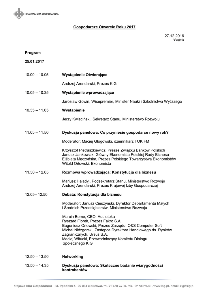 Gospodarcze Otwarcie Roku 2017 27.12.2016 *Projekt Program 25.01.2017 10.00 – 10.05 Wystąpienie Otwierające Andrzej Arendarski, Prezes KIG 10.05 – 10.35 Wystąpienie wprowadzające Jarosław Gowin, Wicepremier, Minister Nauki i Szkolnictwa Wyższego 10.35 – 11.05 Wystąpienie Jerzy Kwieciński, Sekretarz Stanu, Ministerstwo Rozwoju 11.05 – 11.50 Dyskusja panelowa: Co przyniesie gospodarce nowy rok? Moderator: Maciej Głogowski, dziennikarz TOK FM Krzysztof Pietraszkiewicz, Prezes Związku Banków Polskich Janusz Jankowiak, Główny Ekonomista Polskiej Rady Biznesu Elżbieta Mączyńska, Prezes Polskiego Towarzystwa Ekonomistów Witold Orłowski, Ekonomista 11.50 – 12.05 Rozmowa wprowadzająca: Konstytucja dla biznesu Mariusz Haładyj, Podsekretarz Stanu, Ministerstwo Rozwoju Andrzej Arendarski, Prezes Krajowej Izby Gospodarczej 12.05– 12.50 Debata: Konstytucja dla biznesu Moderator: Janusz Cieszyński, Dyrektor Departamentu Małych i Średnich Przedsiębiorstw, Ministerstwo Rozwoju Marcin Beme, CEO, Audioteka Ryszard Florek, Prezes Fakro S.A. Eugeniusz Orłowski, Prezes Zarządu, O&S Computer Soft Michał Nidzgorski, Zastępca Dyrektora Handlowego ds. Rynków Zagranicznych, Ursus S.A. Maciej Witucki, Przewodniczący Komitetu Dialogu Społecznego KIG 12.50 – 13.50 Networking 13.50 – 14.35 Dyskusja panelowa: Skuteczne badanie wiarygodności kontrahentów Moderator: Monika Zakrzewska, Prezes Fundacji Rozwoju Rynku Finansowego Piotr Badura, Dyrektor Genralny CRIF Services sp. z o.o. Sławomir Grzelczak, Wiceprezes Zarządu Biura Informacji Kredytowej S.A. Marcin Żuchowski, Dyrektor ds. Ryzyka Kredytowego, Członek Zarządu Provident Polska* Agnieszka Nosal, Członek Zarządu innogy Stoen Operator* Piotr Mazur, Wiceprezes Zarządu PKO Banku Polskiego nadzorujący Obszar Zarządzania Ryzykiem 14.35 – 15.20 Debata: Druga ustawa o innowacyjności Moderator: Jacek Czech, Dyrektor ds. Rozwoju, KIG Maciej Chorowski, Dyrektor Narodowe Centrum Badań i Rozwoju* Paweł Borys, Prezes Zarządu, Polski Fundusz Rozwoju Stanisław Wincenciak, Prorektor ds. Rozwoju, Politechnika Warszawska Aleksander Szalecki, Partner Zarządzający, Stratego 15.20 – 15.35 Rozmowa podsumowująca: Druga ustawa o innowacyjności Piotr Dardziński, Podsekretarz Stanu, Ministerstwo Nauki i Szkolnictwa Wyższego Zygmunt Grajkowski, Przewodniczący Komitetu ds. innowacyjności KIG 15.35 – 15.40 Wręczenie nagród III edycji konkursu „Polska Cyfrowa 2020+” 15.40 – 16.25 Dyskusja panelowa: Instrumenty finansowe dla MSP Moderator: Arkadiusz Lewicki, Dyrektor Krajowego Punktu Kontaktowego ds. Instrumentów Finansowych Programów UE Andrzej Krzemiński, Prezes Zarządu Raiffeisen-Leasing Polska S.A. Witold Słowik, Podsekretarz Stanu w Ministerstwie Rozwoju* Artur Zabielski, Dyrektor Departamentu Rozwoju Produktu i Segmentów Klienta w Provident Polska Adrian Kurowski, Dyrektor Visa Europe w Polsce 16.25 Zakończenie konferencji *Obecność gości wymaga potwierdzenia