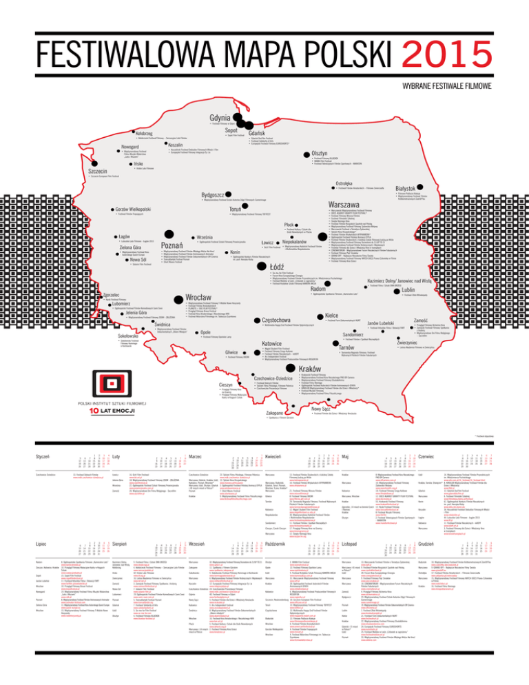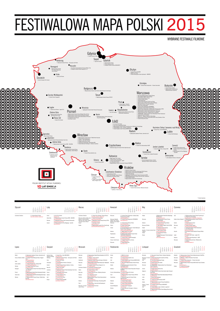 FESTIWALOWA MAPA POLSKI 2015 WYBRANE FESTIWALE FILMOWE Gdynia • Festiwal Filmowy w Gdyni Sopot Kołobrzeg • Sopot Film Festival • Kołobrzeski Festiwal Filmowy – Sensacyjne Lato Filmów Koszalin Nowogard Gdańsk • Gdańsk DocFilm Festival • Festiwal Solidarity of Arts • Europejski Festiwal Filmowy EUROSHORTS* • Koszaliński Festiwal Debiutów Filmowych Młodzi i Film • Europejski Festiwal Filmowy Integracja Ty i Ja • Międzynarodowy Festiwal Filmu-Muzyki-Malarstwa „Lato z Muzami” Olsztyn • Festiwal Filmowy BLUEBOX • WAMA Film Festival • Festiwal Telewizyjnych Filmów Sportowych - MARATON Ińsko • Ińskie Lato Filmowe Szczecin • Szczecin European Film Festival Ostrołęka Białystok • Festiwal Filmów Amatorskich – Filmowe Zwierciadła Bydgoszcz • Międzynarodowy Festiwal Sztuki Autorów Zdjęć Filmowych Camerimage Warszawa Toruń Gorzów Wielkopolski • Festiwal Filmów Frapujących • Warszawski Międzynarodowy Festiwal Filmowy • DOCS AGAINST GRAVITY FILM FESTIVAL* • Festiwal Filmowy Wiosna Filmów • Festiwal Filmoteki Szkolnej • Święto Niemego Kina • Festiwal Filmów Rosyjskich Sputnik nad Polską • Międzynarodowy Festiwal Filmowy Żydowskie Motywy • Warszawski Festiwal o Tematyce Żydowskiej • Tydzień Kina Hiszpańskiego* • Festiwal Filmów Afrykańskich AFRYKAMERA* • Ogólnopolski Festiwal Polskiej Animacji O!PLA • Festiwal Filmów Studenckich z Łódzkiej Szkoły Filmowej Łodzią po Wiśle • Międzynarodowy Festiwal Filmowy Dozwolone do 21/UP TO 21 • Międzynarodowy Festiwal Filmów Historycznych i Wojskowych • Festiwal Filmowy dla Dzieci i Młodzieży Kino w trampkach • CINEMAFORUM - Międzynarodowe Forum Niezależnych Filmów Fabularnych • Festiwal Filmowy Pięć Smaków • GRAND OFF - Najlepsze Niezależne Filmy Świata • Międzynarodowy Festiwal Filmowy WATCH DOCS Prawa Człowieka w Filmie • Festiwal Filmowy Kino Dzieci • Międzynarodowy Festiwal Filmowy TOFIFEST Płock • Festiwal Kultury i Sztuki dla Osób Niewidomych w Płocku Łagów • Lubuskie Lato Filmowe - Łagów 2015 Zielona Góra • Międzynarodowy Festiwal Kina Autorskiego Quest Europe Nowa Sól • Solanin Film Festiwal Września Poznań • Ogólnopolski Festiwal Sztuki Filmowej Prowincjonalia • Międzynarodowy Festiwal Filmów Młodego Widza Ale Kino! • Międzynarodowy Festiwal Filmów Animowanych Animator • Międzynarodowy Festiwal Filmów Dokumentalnych Off Cinema • Transatlantyk Festival Poznań • Short Waves Festival Konin Łowicz Niepokalanów • Och! Film Festiwal • Międzynarodowy Katolicki Festiwal Filmów i Multimediów Niepokalanów • Ogólnopolski Konkurs Filmów Niezależnych im. prof. Henryka Kluby Łódź • Se-ma-for Film Festival • Forum Kina Europejskiego Cinergia • Międzynarodowy Festiwal Filmów Przyrodniczych im. Włodzimierza Puchalskiego • Festiwal Mediów w Łodzi „Człowiek w zagrożeniu” • Festiwal Krytyków Sztuki Filmowej KAMERA AKCJA Zgorzelec Lubomierz • Ogólnopolski Festiwal Filmów Komediowych Sami Swoi Jelenia Góra • Międzynarodowy Festiwal Filmowy ZOOM - ZBLIŻENIA • Festiwal Filmu i Sztuki DWA BRZEGI • Ogólnopolskie Spotkania Filmowe „Kameralne Lato” • Międzynarodowy Festiwal Filmowy T-Mobile Nowe Horyzonty • Festiwal Filmów Amerykańskich • PLANETE+ DOC FILM FESTIVAL* • Przegląd Filmowy Brave Festival • Festiwal Kina Amatorskiego i Niezależnego KAN • Festiwal Aktorstwa Filmowego im. Tadeusza Szymkowa • Festiwal Form Dokumentalnych NURT • Multimedia Happy End Festiwal Filmów Optymistycznych • Międzynarodowy Festiwal Filmów Dokumentalnych „Okiem Młodych” Opole • Festiwal Złote Mrówkojady • Festiwal Artystów Filmu i Telewizji FART • Festiwal Filmów i Spotkań Niezwykłych Katowice • Węgiel Student Film Festiwal • Festiwal Filmowy Cropp Kultowe • Festiwal Filmów Niezależnych – killOFF • Ars Independent Festival • Międzynarodowy Festiwal Producentów Filmowych REGIOFUN Gliwice • Festiwal Filmowy DRZWI Zamość Janów Lubelski Sandomierz • Festiwal Filmowy Opolskie Lamy • Sokołowsko Festiwal Filmowy Hommage à Kieślowski Lublin Kielce Częstochowa Świdnica Sokołowsko Kazimierz Dolny/ Janowiec nad Wisłą Radom Wrocław • Nyski Festiwal Filmowy • Filmowe Podlasie Atakuje • Międzynarodowy Festiwal Filmów Krótkometrażowych ŻubrOFFka Tarnów • Przegląd Filmowy Alchemia Kina • Zamojski Festiwal Filmowy Spotkania z historią • Międzynarodowe Dni Filmu Religijnego – Sacrofilm Zwierzyniec • Letnia Akademia Filmowa w Zwierzyńcu • Tarnowska Nagroda Filmowa. Festiwal Wybranych Polskich Filmów Fabularnych Kraków Czechowice-Dziedzice Cieszyn • Przegląd Filmowy Kino na Granicy • Przegląd Filmowy Wakacyjne Kadry w Kręgach Sztuki • Festiwal Dobrych Filmów • Tydzień Filmu Polskiego, Filmowe Polonica • Czechowickie Prezentacje Filmowe • Krakowski Festiwal Filmowy • Międzynarodowy Festiwal Kina Niezależnego PKO Off Camera • Międzynarodowy Festiwal Filmowy Etiuda&Anima • Festiwal Filmu Niemego • Ogólnopolski Festiwal Autorskich Filmów Animowanych OFAFA • KINOLUB Międzynarodowy Festiwal Filmów dla Dzieci i Młodzieży* • Festiwal Muzyki Filmowej • Międzynarodowy Festiwal Filmu Filozoficznego Nowy Sącz Zakopane • Festiwal Filmów dla Dzieci i Młodzieży KinoJazda • Spotkania z Filmem Górskim * Festiwal objazdowy Styczeń Czechowice-Dziedzice 1 2 3 4 5 6 7 8 9 10 11 12 13 14 15 16 17 18 19 20 21 22 23 24 25 26 27 28 29 30 31 13. Festiwal Dobrych Filmów www.mdk.czechowice-dziedzice.pl Luty Łowicz Jelenia Góra Września Zamość Lipiec Radom 1 2 6 7 8 9 13 14 15 16 20 21 22 23 27 28 29 30 3 4 5 10 11 12 17 18 19 24 25 26 31 8. Ogólnopolskie Spotkania Filmowe „Kameralne Lato” www.kameralnelato.pl Cieszyn, Katowice, Kraków 10. Przegląd Filmowy Wakacyjne Kadry w Kręgach Sztuki www.wakacyjnekadry.pl Sopot 15. Sopot Film Festival www.