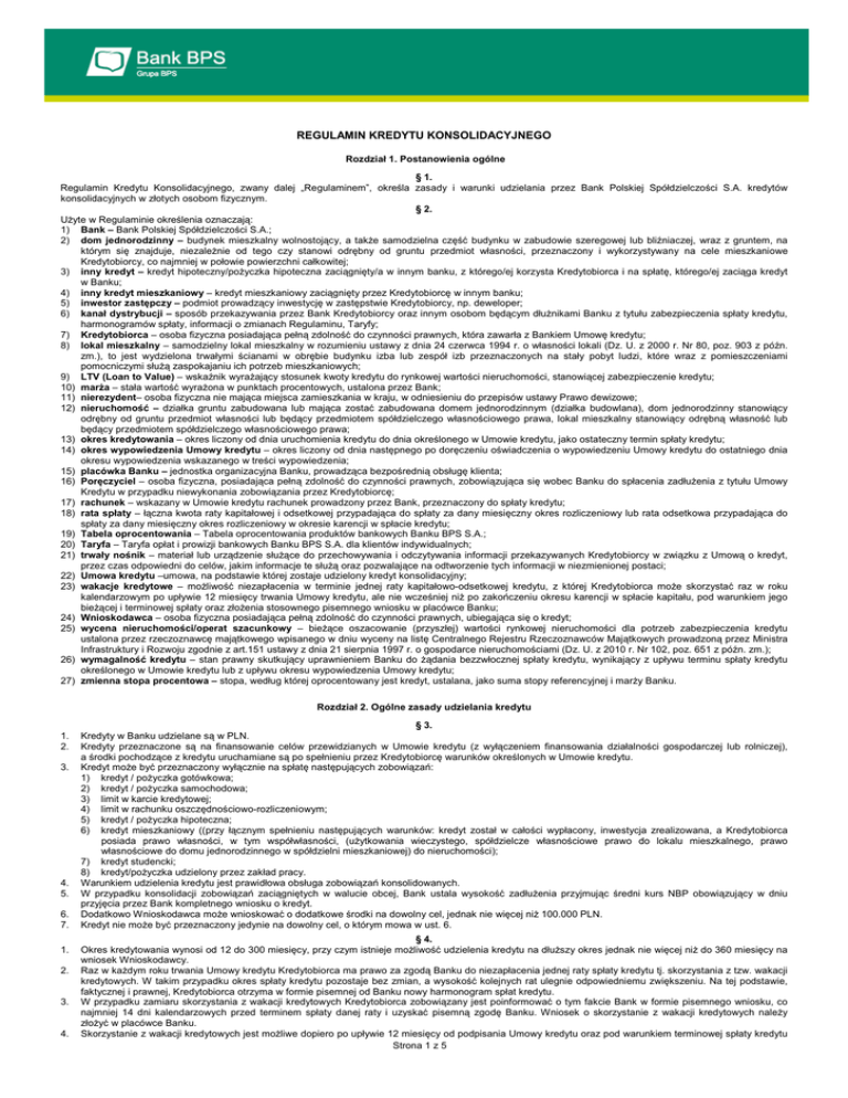 REGULAMIN KREDYTU KONSOLIDACYJNEGO Rozdział 1. Postanowienia ogólne § 1. Regulamin Kredytu Konsolidacyjnego, zwany dalej „Regulaminem”, określa zasady i warunki udzielania przez Bank Polskiej Spółdzielczości S.A. kredytów konsolidacyjnych w złotych osobom fizycznym. § 2. Użyte w Regulaminie określenia oznaczają: 1) Bank – Bank Polskiej Spółdzielczości S.A.; 2) dom jednorodzinny – budynek mieszkalny wolnostojący, a także samodzielna część budynku w zabudowie szeregowej lub bliźniaczej, wraz z gruntem, na którym się znajduje, niezależnie od tego czy stanowi odrębny od gruntu przedmiot własności, przeznaczony i wykorzystywany na cele mieszkaniowe Kredytobiorcy, co najmniej w połowie powierzchni całkowitej; 3) inny kredyt – kredyt hipoteczny/pożyczka hipoteczna zaciągnięty/a w innym banku, z którego/ej korzysta Kredytobiorca i na spłatę, którego/ej zaciąga kredyt w Banku; 4) inny kredyt mieszkaniowy – kredyt mieszkaniowy zaciągnięty przez Kredytobiorcę w innym banku; 5) inwestor zastępczy – podmiot prowadzący inwestycję w zastępstwie Kredytobiorcy, np. deweloper; 6) kanał dystrybucji – sposób przekazywania przez Bank Kredytobiorcy oraz innym osobom będącym dłużnikami Banku z tytułu zabezpieczenia spłaty kredytu, harmonogramów spłaty, informacji o zmianach Regulaminu, Taryfy; 7) Kredytobiorca – osoba fizyczna posiadająca pełną zdolność do czynności prawnych, która zawarła z Bankiem Umowę kredytu; 8) lokal mieszkalny – samodzielny lokal mieszkalny w rozumieniu ustawy z dnia 24 czerwca 1994 r. o własności lokali (Dz. U. z 2000 r. Nr 80, poz. 903 z późn. zm.), to jest wydzielona trwałymi ścianami w obrębie budynku izba lub zespół izb przeznaczonych na stały pobyt ludzi, które wraz z pomieszczeniami pomocniczymi służą zaspokajaniu ich potrzeb mieszkaniowych; 9) LTV (Loan to Value) – wskaźnik wyrażający stosunek kwoty kredytu do rynkowej wartości nieruchomości, stanowiącej zabezpieczenie kredytu; 10) marża – stała wartość wyrażona w punktach procentowych, ustalona przez Bank; 11) nierezydent– osoba fizyczna nie mająca miejsca zamieszkania w kraju, w odniesieniu do przepisów ustawy Prawo dewizowe; 12) nieruchomość – działka gruntu zabudowana lub mająca zostać zabudowana domem jednorodzinnym (działka budowlana), dom jednorodzinny stanowiący odrębny od gruntu przedmiot własności lub będący przedmiotem spółdzielczego własnościowego prawa, lokal mieszkalny stanowiący odrębną własność lub będący przedmiotem spółdzielczego własnościowego prawa; 13) okres kredytowania – okres liczony od dnia uruchomienia kredytu do dnia określonego w Umowie kredytu, jako ostateczny termin spłaty kredytu; 14) okres wypowiedzenia Umowy kredytu – okres liczony od dnia następnego po doręczeniu oświadczenia o wypowiedzeniu Umowy kredytu do ostatniego dnia okresu wypowiedzenia wskazanego w treści wypowiedzenia; 15) placówka Banku – jednostka organizacyjna Banku, prowadząca bezpośrednią obsługę klienta; 16) Poręczyciel – osoba fizyczna, posiadająca pełną zdolność do czynności prawnych, zobowiązująca się wobec Banku do spłacenia zadłużenia z tytułu Umowy Kredytu w przypadku niewykonania zobowiązania przez Kredytobiorcę; 17) rachunek – wskazany w Umowie kredytu rachunek prowadzony przez Bank, przeznaczony do spłaty kredytu; 18) rata spłaty – łączna kwota raty kapitałowej i odsetkowej przypadająca do spłaty za dany miesięczny okres rozliczeniowy lub rata odsetkowa przypadająca do spłaty za dany miesięczny okres rozliczeniowy w okresie karencji w spłacie kredytu; 19) Tabela oprocentowania – Tabela oprocentowania produktów bankowych Banku BPS S.A.; 20) Taryfa – Taryfa opłat i prowizji bankowych Banku BPS S.A. dla klientów indywidualnych; 21) trwały nośnik – materiał lub urządzenie służące do przechowywania i odczytywania informacji przekazywanych Kredytobiorcy w związku z Umową o kredyt, przez czas odpowiedni do celów, jakim informacje te służą oraz pozwalające na odtworzenie tych informacji w niezmienionej postaci; 22) Umowa kredytu –umowa, na podstawie której zostaje udzielony kredyt konsolidacyjny; 23) wakacje kredytowe – możliwość niezapłacenia w terminie jednej raty kapitałowo-odsetkowej kredytu, z której Kredytobiorca może skorzystać raz w roku kalendarzowym po upływie 12 miesięcy trwania Umowy kredytu, ale nie wcześniej niż po zakończeniu okresu karencji w spłacie kapitału, pod warunkiem jego bieżącej i terminowej spłaty oraz złożenia stosownego pisemnego wniosku w placówce Banku; 24) Wnioskodawca – osoba fizyczna posiadająca pełną zdolność do czynności prawnych, ubiegająca się o kredyt; 25) wycena nieruchomości/operat szacunkowy – bieżące oszacowanie (przyszłej) wartości rynkowej nieruchomości dla potrzeb zabezpieczenia kredytu ustalona przez rzeczoznawcę majątkowego wpisanego w dniu wyceny na listę Centralnego Rejestru Rzeczoznawców Majątkowych prowadzoną przez Ministra Infrastruktury i Rozwoju zgodnie z art.151 ustawy z dnia 21 sierpnia 1997 r. o gospodarce nieruchomościami (Dz. U. z 2010 r. Nr 102, poz. 651 z późn. zm.); 26) wymagalność kredytu – stan prawny skutkujący uprawnieniem Banku do żądania bezzwłocznej spłaty kredytu, wynikający z upływu terminu spłaty kredytu określonego w Umowie kredytu lub z upływu okresu wypowiedzenia Umowy kredytu; 27) zmienna stopa procentowa – stopa, według której oprocentowany jest kredyt, ustalana, jako suma stopy referencyjnej i marży Banku. Rozdział 2. Ogólne zasady udzielania kredytu 1. 2. 3. 4. 5. 6. 7. 1. 2. 3. 4. § 3. Kredyty w Banku udzielane są w PLN. Kredyty przeznaczone są na finansowanie celów przewidzianych w Umowie kredytu (z wyłączeniem finansowania działalności gospodarczej lub rolniczej), a środki pochodzące z kredytu uruchamiane są po spełnieniu przez Kredytobiorcę war