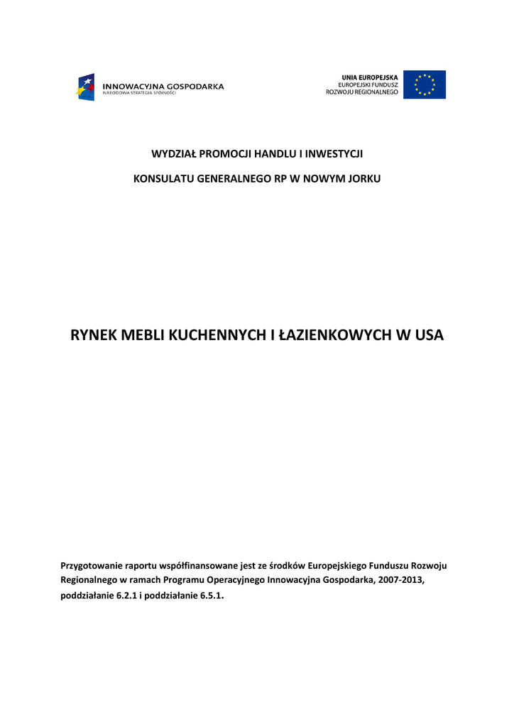 WYDZIAŁ PROMOCJI HANDLU I INWESTYCJI KONSULATU GENERALNEGO RP W NOWYM JORKU RYNEK MEBLI KUCHENNYCH I ŁAZIENKOWYCH W USA Przygotowanie raportu współfinansowane jest ze środków Europejskiego Funduszu Rozwoju Regionalnego w ramach Programu Operacyjnego Innowacyjna Gospodarka, 2007-2013, poddziałanie 6.2.1 i poddziałanie 6.5.1. WYDZIAŁ PROMOCJI HANDLU I INWESTYCJI KONSULATU GENERALNEGO RP W NOWYM JORKU Rynek mebli kuchennych I łazienkowych Producenci skupiają się na produkcji mebli kuchennych i łazienkowych oraz blatów kuchennych i łazienkowych na wyposażenie domów prywatnych. Głównym surowcem używanym przy produkcji mebli jest drzewo i okleina drzewna. Produkty: Meble łazienkowe Szafki kuchenne Szafki na leki (apteczki domowe) Blaty (kuchenne i łazienkowe) Ociekacze do zlewozmywaka Główne Ośrodki Sprzedaży w USA: 1. Południowy Wschód – 2,717 ośrodków – 29% 2. Zachód – 1,660 - ośrodków --------------- 18% 3. Kraina Wielkich Jezior – 1,307 ośrodków 4. Środkowy Atlantyk – 1,156 ośrodków 5. Wielkie Równiny USA - 945 ośrodków 6. Południowy- Zachód – 739 ośrodków 7. Góry Skaliste (Rocky Mountains) – 528 ośrodków 8. Nowa Anglia – 421 ośrodków. IBIS szacuje, iż głowni producenci są dpowiedzialni za 30% całej produkcji. Sprzedaż mebli kuchennych i łazienkowych oraz blatów dla domów prywatnych stanowi w USA mniej niż 25% na rynku mebli domowych. Kryzys mieszkaniowy i recesja w USA drastycznie wpłynęły na popyt i podaż, obniżając zyski ze sprzedaży o ok. 9% w skali roku. IBIS World przewiduje spadek dochodów do 2010 r. o kolejne 2.3%, co będzie równało się $12.6 2 Rynek mebli kuchennych i łazienkowych w USA (listopad 2010) WYDZIAŁ PROMOCJI HANDLU I INWESTYCJI KONSULATU GENERALNEGO RP W NOWYM JORKU mld. Dochody czerpane z sektora sprzedaży skierowanych dla domów prywatnych w 2010 r. były kształtowane przez skoki i trendy na rynku mieszkaniowym (kupno, sprzedaż, remonty). Obniżająca się liczba właścicieli mieszkań, zaniżone dochody, niska liczba przeprowadzanych remontów i modernizacji oraz niski poziom lojalności klienta negatywnie wpłynęły na popyt. Według IBIS World liczba kontraktorów (firm instalujących meble u klienta) zmaleje do 6,900 (5.5% w skali roku), a liczba przedsiębiorstw pomniejszy się o 5.9% w skali roku. Jak wynika z okresowo przeprowadzanych statystyk liczba właścicieli mieszkań prywatnych była dotychczas najwyższa w 2005 r. – osiągając 69.2%, natomiast w 2009 na skutek słabej sytuacji ekonomicznej liczba właścicieli mieszkań spadła do 67%. PKB USA zmalał o ok. 0.4% w 2008r., pomniejszając wskaźnik poziomu zaufania konsumenta do stanu gospodarki o ok. 25%. Zmiany we wskaźnikach ekonomicznych oznaczają zmiany dotyczące preferencji wydatków na skutek pogorszenia się stanu gospodarki państwa. Wraz ze stopniowym wychodzeniem USA z recesji i rosnącym PKB (0.6% w 2010 r.) przewiduje się poprawę i zwiększenie wydatków przeznaczonych na remonty i zakupy nowych towarów. Narodowe Zrzeszenie Firm Budowlanych informuje także o stabilzującym się trendzie warunków gospodarczych. Przewiduje się wzrost sprzedaży domów o 7.6% w 2011, który będzie trwał do 2015 r. Wzrośnie także liczba firm do ok 8,200 jednostek, gdyż nowe będą nieustannie wchodziły na rynek, podczas gdy dotychczasowi główni gracze będą przejmować mniejszych i słabszych producentów. Aktualnie, czterech głównych liderów rynku stanowi o 30% sprzedaży i przewiduje się, iż procent ten wzrośnie na skutek kolejnych fuzji i przejęć mniejszych przedsiębiorstw. KONKURENCYJNOŚĆ PRODUKTU; CZYNNIKI Liczba nowowybudowanych mieszkań prywatnych Tempo w jakim wzrasta popyt zależy od ilości pozwoleń na budowę nowych mieszkań i apartamentów wydanych przez władze lokalne i stanowe. Ilość inwestycji przeznaczonych na budowę mieszkań prywatnych 3 Rynek mebli kuchennych i łazienkowych w USA (listopad 2010) WYDZIAŁ PROMOCJI HANDLU I INWESTYCJI KONSULATU GENERALNEGO RP W NOWYM JORKU Wzrast ze wzrostem rozwoju tego sektora wzrasta zapotrzebowanie na meble kuchenne i łazienkowe. Liczba centrów handlowych sprzedaży detalicznej (narzędzia, meble, etc.) Wzrost zapotrzebowania na sklepy zajmujące się sprzedażą artykułów gospodarstwa domowego będzie pozytywnie wpływać na zwiększenie produkcji mebli. Dochód brutto na członka rodziny- PKB Wzraz ze wzrostem dochodów wzrasta popyt nameble kuchenne i łazienkowe, a także wzrasta liczba remontów i modernizacji przeprowadzanych w domach prywatnych, etc. Wskaźnik lojalności konsumenta Niski poziom bezpieczeństwa na rynku finansowym odczuwany przez konsumentów, sprawia, iż są oni mniej skłonni do zamawiania nowych mebli łazienkowych i kuchennych, odwlekając decyzję zakupu, co w efekcie prowadzi do spadku popytu. Rynek: Bogata oferta rozwiązań w zakresie projektu jak i wykończenia modeli mebli kuchennych i łazienkowych jest bezwzględnym wymogiem dla firm chcących utrzymać się na rynku. Po wcześniejszym spadku sprzedaży w wysokości $12.6 mld. w 2010 r., przewiduje się, iż przemysł doświadczy powolnej odbudowy i zastrzyku w postaci dochodów na przestrzeni kolejnych pięciu lat (2010 –2015). Import: Poziom importu w USA znacznie przewyższa poziom eksportu. Według prognoz IBIS World przewiduje się spadek poziomu importu w 2010 r. o ok. 9.1%. Jak podaje ITC na skutek osłabionego dolara import zmalał o ok. 29.1% w 2009 r. Chiny są największym eksporterem mebli do USA- 45%, Kanada plasuje się na drugim miejscu – 39%, Włochy - 9%, Niemcy – 5%, Wielka Brytania – 2%. Jak przewiduje IBIS World na swoim wykresie przez następne pięć lat, do 2015 poziom importu jak i eksportu powinien utrzymywać się mniej więcej na tym samym poziomie, z ciągłą tendencją wzrostową. 4 Rynek mebli kuchennych i łazienkowych w USA (listopad 2010) WYDZIAŁ PROMOCJI HANDLU I INWESTYCJI KONSULATU GENERALNE