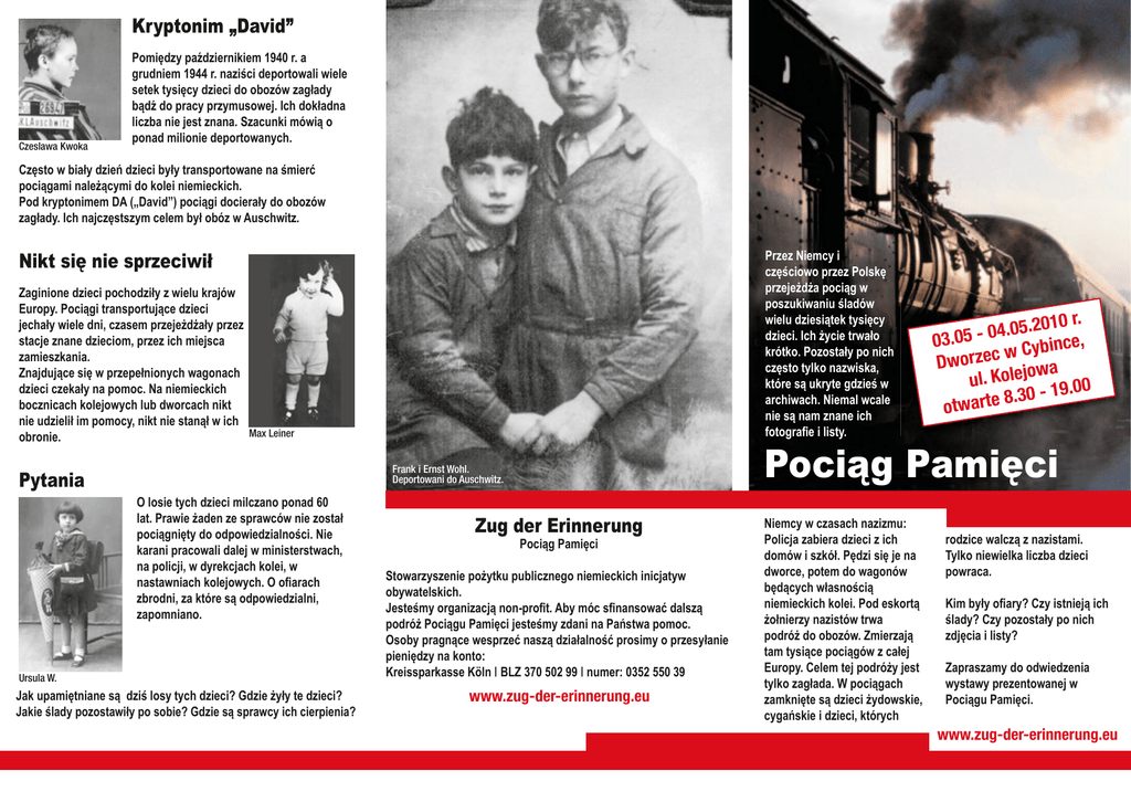 Kryptonim „David” Czeslawa Kwoka Pomiędzy październikiem 1940 r. a grudniem 1944 r. naziści deportowali wiele setek tysięcy dzieci do obozów zagłady bądź do pracy przymusowej. Ich dokładna liczba nie jest znana. Szacunki mówią o ponad milionie deportowanych. Często w biały dzień dzieci były transportowane na śmierć pociągami należącymi do kolei niemieckich. Pod kryptonimem DA („David”) pociągi docierały do obozów zagłady. Ich najczęstszym celem był obóz w Auschwitz. Nikt się nie sprzeciwił Zaginione dzieci pochodziły z wielu krajów Europy. Pociągi transportujące dzieci jechały wiele dni, czasem przejeżdżały przez stacje znane dzieciom, przez ich miejsca zamieszkania. Znajdujące się w przepełnionych wagonach dzieci czekały na pomoc. Na niemieckich bocznicach kolejowych lub dworcach nikt nie udzielił im pomocy, nikt nie stanął w ich obronie. Przez Niemcy i częściowo przez Polskę przejeżdża pociąg w poszukiwaniu śladów wielu dziesiątek tysięcy dzieci. Ich życie trwało krótko. Pozostały po nich często tylko nazwiska, które są ukryte gdzieś w archiwach. Niemal wcale nie są nam znane ich fotografie i listy. Max Leiner Pociąg Pamięci Frank i Ernst Wohl. Deportowani do Auschwitz. Pytania O losie tych dzieci milczano ponad 60 lat. Prawie żaden ze sprawców nie został pociągnięty do odpowiedzialności. Nie karani pracowali dalej w ministerstwach, na policji, w dyrekcjach kolei, w nastawniach kolejowych. O ofiarach zbrodni, za które są odpowiedzialni, zapomniano. Ursula W. Jak upamiętniane są dziś losy tych dzieci? Gdzie żyły te dzieci? Jakie ślady pozostawiły po sobie? Gdzie są sprawcy ich cierpienia? .2010 r. 5 0 . 4 0 03.05 bince, y C w c e Dworz wa ul. Kolejo 9.00 8.30 - 1 otwarte Zug der Erinnerung Pociąg Pamięci Stowarzyszenie pożytku publicznego niemieckich inicjatyw obywatelskich. Jesteśmy organizacją non-profit. Aby móc sfinansować dalszą podróż Pociągu Pamięci jesteśmy zdani na Państwa pomoc. Osoby pragnące wesprzeć naszą działalność prosimy o przesyłanie pieniędzy na konto: Kreissparkasse Köln | BLZ 370 502 99 | numer: 0352 550 39 www.zug-der-erinnerung.eu Niemcy w czasach nazizmu: Policja zabiera dzieci z ich domów i szkół. Pędzi się je na dworce, potem do wagonów będących własnością niemieckich kolei. Pod eskortą żołnierzy nazistów trwa podróż do obozów. Zmierzają tam tysiące pociągów z całej Europy. Celem tej podróży jest tylko zagłada. W pociągach zamknięte są dzieci żydowskie, cygańskie i dzieci, których rodzice walczą z nazistami. Tylko niewielka liczba dzieci powraca. Kim były ofiary? Czy istnieją ich ślady? Czy pozostały po nich zdjęcia i listy? Zapraszamy do odwiedzenia wystawy prezentowanej w Pociągu Pamięci. www.zug-der-erinnerung.eu Pamięć Upamiętnianie dzieci deportowanych przez nazistów podczas II wojny światowej jest bardzo ważne. Mord na dzieciach należy do najokrutniejszych wydarzeń w historii ludzkości. Nie możemy zmienić biegu historii, możemy jednak upamiętniać losy tych dzieci, pamiętać ich imiona i twarze. To ostatni moment, by zwrócić się do świadków tamtych wydarzeń. Być może żyją jeszcze krewni i znajomi deportowanych dzieci, którzy mogliby opowiedzieć o ich losie. Pamięć o ofiarach nazistów to nasz obowiązek. Poszukiwanie śladów Niemieckie Stowarzyszenie „Zug der Erinnerung” („Pociąg Pamięci”) zorganizowało wystawę, która upamiętnia losy deportowanych dzieci. Pociąg Pamięci zatrzymuje się na stacjach, przez które przejeżdżały dzieci podczas swojej ostatniej podróży. Wystawa prezentowana w jego wagonach informuje o tamtych wydarzeniach i ma na celu zachęcenie współczesnych do refleksji nad przeszłością. Zapraszamy Państwa do obejrzenia na wystawie w Pociągu Pamięci dokumentów i zdjęć, które pozostały po zaginionych: fotografii uśmiechniętych dzieci w szkole z rodzicami i przyjaciółmi oraz do przyjrzenia się dokumentacji ich ostatniej podróży w życiu. Na temat losu wielu europejskich dzieci brak jest jednak jakichkolwiek dokumentów. Dlatego zapraszamy Państwa do włączenia się w poszukiwanie śladów tych osób – w miejscowych archiwach bądź poprzez kontakt ze świadkami historii, którzy żyli w tamtych czasach i są jeszcze wśród nas. Nie zmarnujmy tej szansy! Pociąg Pamięci Wizyta w Pociągu Pamięci Serdecznie zapraszamy dzieci, młodzież i dorosłych do odwiedzenia wystawy znajdującej się w Pociągu Pamięci. Skorzystajmy z okazji, że Pociąg Pamięci zatrzyma się niedaleko naszego miejsca zamieszkania, obejrzyjmy znajdującą się w nim wystawę! Zapraszamy do refleksji nad losem dzieci z wielu krajów Europy: Polski, Niemiec, Austrii, Grecji, Rumunii, Norwegii, Finlandii, Słowacji, Czech oraz krajów byłego Związku Radzieckiego. (W pociągu będzie obecny pedagog, który wprowadzi zwiedzających w tematykę niemieckojęzycznej ekspozycji. Każdy zwiedzający otrzyma katalog w języku polskim zawierający prezentowane treści) Z Twojego miasta i regionu, z Twoją pomocą. E-Mail: [email protected] Przez Niemcy i częściowo przez Polskę przejeżdża pociąg w poszukiwaniu śladów wielu dziesiątek tysięcy dzieci. Ich życie trwało krótko. Osoby pragnące wesprzeć naszą działalność prosimy o przesyłanie pieniędzy na konto: Kreissparkasse Köln BLZ 370 502 99 Konto: 0352 550 392 V.i.S.d.P. Zug der Erinnerung e.V. | H.-R. Minow Mohrenbach 1 | D-51598 Friesenhagen
