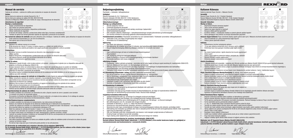 H H ✔ Betjeningsvejledning ✖ Flyerkæder + rullekæder i løfteapplikationer Gyldighed Rexnord-flyerkæder AL, BL, F, fabriksnorm Rexnord-rullekæder ISO 606, DIN 8187 / 8188, fabriksnorm (Løftegrej/lastoptagelsesmiddel if. maskindirektiv 2006/42/EF) Sikkerhedsanvisninger Montage og vedligeholdelse • Slå alle anlæg/drev helt fra! • Forbeholdt faguddannet personale! • Brug udelukkende fagmæssigt korrekt værktøj, anordninger, hjælpemidler! 5% H 5% H • Sikkerhedsbeklædning påbudt! • Efter arbejdets udførelse: Afdækninger + beskyttelsesindretninger komplet påmonterede og funktionsdygtige! • Der henvises endvidere til almindeligt gældende sikkerhedsbestemmelser! Formålsbestemt anvendelse af flyerkæder (anvendelse kun som lasttrækmiddel!) / Rullekæder (anvendelse i løfteapplikationer!) • Sidekræfter (f.eks. som følge af flugtningsfejl) skal undgås! • Anvendelse kun til trækbelastning! Opbevaring • Nye kæder skal opbevares i emballagen. • Ved opbevaring, der strækker sig ud over 12 måneder, skal beskyttelsesolie smøres på kæden. • Brug af luftgennemtrængelig afdækning (oliepapir) anbefales for at beskytte mod snavs! Advarsler • Ingen kraftindvirkninger på tværs af omløbsretningen/belastningsaksen! • Brug handsker! • Løft, håndtering, sikring kun med egnet løftegrej! • Kæder fra Rexnord er forsynet med en førstegangssmøring, når de forlader fabrikken! • Forurenede overflader skal renses omgående! Afkortning af kæden • Prespasning - mellem yderlask og kædetap - overvindes ved at trykke tappen ud (brug en egnet anordning iht. maskindirektiv 2006/42 EF). • Fjern evt. nittehovedet først (lasker må ikke beskadiges ved slibning!) • Slibning: Fare for brand og personskade som følge af gnistregn! Foranstaltninger til arbejderbeskyttelse skal iværksættes i overensstemmelse med almindeligt gældende sikkerhedsbestemmelser! • Yderlasker til det udtagne led og/eller beskadigede kædekomponenter må ikke genanvendes/forsøges udbedret/efterbearbejdes! På-/afmontering af flyerkæder i anlæg (ved anker, kædeholder/samlestykke f.eks.) • Der må kun anvendes ubrugte originale Rexnord-tilslutningsbolte og –sikringsmidler! • Mål for tilslutningen i anlægssiden (f.eks. kædeanker) ifølge Rexnord-angivelserne (katalog)! • Samlestykke og indtagsboring til kædetap skal være uden skader! • Sidekraftpåvirkninger (flugtningsfejl!) skal undgås! • Løbeflader til kæder (f.eks. styretrisser) skal være plane og uden skader! • Kontroller, at flyerkæden er tilstrækkeligt smurt inden anvendelse! På-/afmontering af rullekæder • Forbindelse med overgangsled og sikringselement (låsefjeder eller split) samt • Forbindelse med nittet yderled I forbindelse med valg og brug af kæder henvises til sikkerhedsfaktorerne, der følger af maskindirektivet 2006/42 EF. Oplysninger om dimensionering og konstruktion findes i Rexnord Kette-kataloget. Inspektion/renholdelse/eftersmøring • Vedligeholdelsesintervaller og –anvisninger fra anlæggets producent skal følges! • Målinger af slidlængde skal foretages i de af anlægsproducenten fastlagte tidsintervaller! • Flyerkæder skal udskiftes ved en slidforlængelse på 2% (længde over 100 delinger – se Rexnord-kataloget)! • Når slidforlængelsen over 3%, må kæden ikke længere benyttes! • Flyerkæder af størrelsen ½“ op til 2 ½“ måles med Rexnord’s slitagelineal. • Rensning kun med paraffinderivater (dieselolie, petroleum, rensebenzin)! • Rensning må under ingen omstændigheder foretages med dampstråleapparat, koldrens eller ætsende, syreholdige midler! • Eftersmøring med mineralske og syntetiske olier med en viskositet på ISO-VG 68 op til 220 ved brugstemperatur (RexOil, motor- og gearolier). • Ingen brug af smøremidler, som tykner! • Olier, der indeholder grafit eller molybdænsulfid, skal doseres i små mængder (undgå dannelse af fedtkraver!). • Smøring foregår ved hjælp af pensel eller spraydåse. • Ingen smøring under lastpåvirkning, da smøremidlet skal kunne trænge ind i leddene. ✔ Kullanım Kılavuzu ✖ Kaldırma ișlerinde Fleyer Zincirler + Makaralı Zincirler Verimlilik Rexnord Fleyer Zincirler AL, BL, F, Endüstri Standardı Rexnord Makaralı Zincirler ISO 606, DIN 8187 / 8188, Endüstri Standardı (Kaldırma Düzenekleri/Kaldırma Ekipmanı Makine Direktifi 2006/42/EG) Güvenlik Talimatları Montaj ve Bakım • Ekipmanları/Cihazları tamamen kapatın! • Yalnız uzman personel yapabilir! • Sadece ișe uygun ekipman ve teçhizat! 5% H 5% H • Koruyucu elbise giyilmesi gereklidir! • İși bitince: Kılıfları + muhafazaları eksiksiz ve ișlevini görecek șekilde kapatın! • Ayrıca genelgeçer kaza önleme ve emniyet düzenlemeleri geçerlidir! Amacına Uygun Kullanım Fleyer zincirlerde (Sadece ağırlık çekme ișleri için!) / Makaralı zincirlerde (kaldırma ișleri için!) • Yanal kuvvetlerden (ör. yanlıș eksenlemeye bağlı) kaçının! • Sadece çekme ișleminde kullanın! Saklama • Kullanılmamıș zincirleri ambalajında saklayın. • 12 ayı așan saklama sürelerinde zinciri, koruyucu yağ ile yağlayın. • Kirlenmeye karșı hava geçirgen muhafaza (yağlı kağıt) önerilir! Uyarılar • İlke olarak hareket yönüne / ağırlık eksenine ters kuvvet uygulamayın! • Eldiven giyin! • Sadece uygun kaldırma sistemiyle kaldırın, emniyete alın, nakledin! • Rexnord zincirleri imalatta yağlanmıștır! • Kirlenmiș yüzeyleri beklemeksizin temizleyin! Zincirin Kısaltılması • - Mapayla zincirin pimi arasındaki – bağlantıyı pimi ittirmek suretiyle açın (Makine Direktifi 2006/42 EG’yle uyumlu teçhizat kullanarak). • Gerekirse perçin bașını önceden demonte edin (Mapalar tașlama sırasında zarar görmemeli!) • Tașlama: Kıvılcım sıçraması sonucu yangın ve yaralanma tehlikesi! Genelgeçer kaza önleme ve emniyet düzenlemelerini
