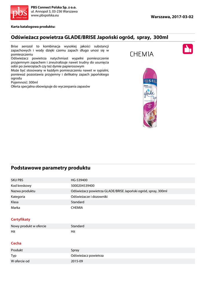PBS Connect Polska Sp. z o.o. ul. Annopol 3, 03-236 Warszawa www.pbspolska.eu Warszawa, 2017-03-02 Karta katalogowa produktu: Odświeżacz powietrza GLADE/BRISE Japoński ogród, spray, 300ml Brise aerozol to kombinacja wysokiej jakości substancji zapachowych i wody dzięki czemu zapach długo unosi się w pomieszczeniu Odświeżacz powietrza natychmiast wypełni pomieszczenie przyjemnym zapachem i zneutralizuje nawet trudny do usunięcia odór po zwierzętach czy też dymie papierosowym Może być stosowany w każdym pomieszczeniu nawet w sypialni, ponieważ pozostawia przyjemny i delikatny zapach japońskiego ogrodu Pojemność: 300ml Oferta specjalna obowiązuje do wyczerpania zapasów Podstawowe parametry produktu SKU PBS HG-539400 Kod kreskowy 5000204539400 Nazwa produktu Odświeżacz powietrza GLADE/BRISE Japoński ogród, spray, 300ml Kategoria Odświeżacze i dozowniki Klasa Standard Marka CHEMIA Certyfikaty Nowy produkt w ofercie Standard Hit Hit Cecha Produkt Spray Typ Odświeżacz powietrza W ofercie od 2015-09 PBS Connect Polska Sp. z o.o. ul. Annopol 3, 03-236 Warszawa www.pbspolska.eu Warszawa, 2017-03-02 Karta katalogowa produktu cd. Odświeżacz powietrza GLADE/BRISE Japoński ogród, spray, 300ml Podstawowe parametry produktu Wymiary Pojemność (ml) 300 Wspólny słownik zamówień CPV 39830000-9 Środki czyszczące Jednostki logistyczne Opakowanie 1 12 szt