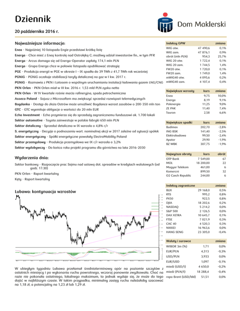 Dziennik 20 października 2016 r. Najważniejsze informacje: Indeksy GPW WIG otw. Enea - Najpóźniej 10 listopada Engie przedstawi krótką listę WIG zam. Energa - Chce mieć z Eneą kontrolę nad Ostrołęką C; możliwy udział inwestorów fin., w tym PFR obrót (mln PLN) WIG 20 otw. Energa - Arcus domaga się od Energa-Operator zapłaty 174,1 mln PLN WIG 20 zam. Energa - Grupa Energa chce w połowie listopada opublikować strategię FW20 otw. PGE - Produkcja energii w PGE w okresie I – IX spadła do 39 TWh z 41,7 TWh rok wcześniej FW20 zam. PGNiG - PGNiG oczekuje stabilizacji taryfy detalicznej na gaz w I kw. 2017 r. mWIG40 otw. PGNiG - Rozmawia z PKN i Lotosem o wspólnym uruchamianiu instalacji ładowania gazem LNG/CNG mWIG40 zam. zmiana 47 490,6 47 876,1 954,3 1 722,4 1 744,5 1 720,0 1 749,0 4 095,6 4 107,4 0,1% 0,9% 25,7% 0,1% 1,4% 0,1% 1,4% 0,2% 0,4% kurs zmiana 9,75 8,19 11,25 11,40 2,58 10,0% 9,1% 9,0% 7,4% 6,6% PKN Orlen - PKN Orlen miał w III kw. 2016 r. 1,53 mld PLN zysku netto Największe wzrosty PKN Orlen - W IV kwartale rośnie marża rafineryjna, spada petrochemiczna Enea Energa Polenergia ZE PAK Tauron Asseco Poland - Sojusz z Microsoftem ma zwiększyć sprzedaż rozwiązań telemedycznych Bogdanka - Dostęp do złoża Ostrów może umożliwić Bogdance wzrost zasobów o 200-350 mln ton GTC - GTC wyemituje obligacje o wartości do 20 mln EUR Echo Investment - Echo przymierza się do sprzedaży zagranicznemu funduszowi ok. 1.700 lokali Sektor automotive - Toyota zainwestuje w polskie fabryki 650 mln PLN Największe spadki Sektor detaliczny - Sprzedaż detaliczna w IX wzrosła o 4,8% r/r kurs zmiana 202,70 141,40 99,50 29,90 307,75 -2,8% -2,5% -2,4% -1,9% -1,9% Najwyższe obroty kurs obrót OTP Bank MOL Magyar Telekom Komercni O2 Czech Republic 7 549,00 18 200,00 461,00 899,50 244,00 67 22 6 32 6 Budimex ING BSK Elektrobudowa Apator BZ WBK S. energetyczny - Decyzje o podnoszeniu wart. nominalnej akcji w 2017 zależne od sytuacji spółek Sektor energetyczny - Spółki energetyczne powołały ElectroMobility Poland Sektor przemysłowy - Produkcja przemysłowa we IX r/r wzrosła o 3,2% Sektor wydobywczy - Do końca roku projekt programu dla górnictwa na lata 2016-2030 Wydarzenia dnia: Sektor bankowy - Rozpoczęcie prac Sejmu nad ustawą dot. spreadów w kredytach walutowych (od godz. 17:30) PKN Orlen - Raport kwartalny Kęty - Raport kwartalny Indeksy zagraniczne Lubawa: kontynuacja wzrostów 1.45 1.40 1.35 1.30 1.25 1.20 1.15 1.10 1.05 1.00 0.95 0.90 0.85 BUX RTS PX50 DJIA NASDAQ S&P 500 DAX XETRA FTSE CAC 40 NIKKEI HANG SENG zmiana 29 168,0 995,2 922,5 18 202,6 5 214,2 2 126,5 10 645,7 7 021,9 4 520,3 16 963,6 23 305,0 0,5% 0,8% 0,8% 0,2% 0,0% 0,0% 0,1% 0,3% 0,3% 0,0% -0,4% 0.80 0.75 Waluty i surowce 0.70 WIBOR 3m (%) zmiana 1,71 0,0% EUR/PLN 4,313 -0,3% USD/PLN 3,933 0,0% EUR/USD 1,097 -0,1% 4 650,0 -0,2% 20 15 10 5 0 -5 -10 -15 -20 -25 -30 May June July Augus t Septem ber October Novem ber Decem ber 2016 February March April May June July Augus t Septem ber October Novem ber miedź (USD/t) W ubiegłym tygodniu Lubawa przełamał średnioterminowy opór na poziomie szczytów z 18 288,4 ostatnich miesięcy i po wykonaniu ruchu powrotnego, wczoraj ponownie zwyżkowała. Choć na miedź (PLN/t) razie nie pokonała ostatniego, lokalnego maksimum, to jednak wydaje się, że może do tego ropa Brent (USD/bbl) 51,51 dojść w najbliższym czasie. W takim przypadku, minimalny zasięg ruchu należałoby szacować na 1,18 zł, a potencjalny na 1,23 zł lub 1,29 zł. -0,4% 0,0% Dziennik 20 października 2016 r. Najważniejsze informacje: Enea Najpóźniej 10 listopada Engie przedstawi krótką listę Jak wynika z informacji "Parkietu", najpóźniej 10 listopada francuski koncern Engie przedstawi krótką listę podmiotów zainteresowanych zakupem Elektrowni Połaniec, które zostaną dopuszczone do dalszych negocjacji i przeprowadzenia due diligence. Dziennik podaje, że najprawdopodobniej będą to dwa z czterech zainteresowanych podmiotów. (Parkiet) Energa Energa chce mieć z Eneą kontrolę nad Ostrołęką C; możliwy udział inwestorów fin., w tym PFR Energa i Enea chcą zachować kontrolę nad projektem nowego bloku w Elektrowni Ostrołęka, ale nie jest wykluczony "znaczący mniejszościowy udział" w inwestycji inwestorów finansowych, w tym PFR. Zdaniem prezesa Energi Dariusza Kaśków blok będzie trwale rentowny dzięki rynkowi mocy i korzystnej umowie z PGG na dostawy węgla. Droga do negocjacji z Bogdanką nie jest zamknięta. (PAP) Energa Arcus domaga się od Energa-Operator zapłaty 174,1 mln PLN Arcus domaga się od Energa-Operator łącznej kwoty 174,1 mln PLN tytułem naprawienia szkody poniesionej przez spółkę. (PAP) Energa Grupa Energa chce w połowie listopada opublikować strategię Jak poinformował prezes Dariusz Kaśków, Energa zamierza w połowie listopada opublikować strategię grupy do 2020 roku, z perspektywą do 2025 roku. (PAP) PGE Produkcja energii w PGE w okresie I – IX spadła do 39 TWh z 41,7 TWh rok wcześniej Produkcja energii elektrycznej netto w jednostkach wytwórczych PGE od stycznia do września tego roku spadła do 39 TWh z 41,7 TWh rok wcześniej - podała spółka. Z węgla brunatnego grupa wytworzyła 27,2 TWh wobec 29,5 TWh rok wcześniej. Wolumen sprzedaży detalicznej do odbiorców finalnych wyniósł 31,9 TWh. Tymczasem w analogicznym okresie 2015 roku było to 29 TWh. Wolumen dystrybuowanej energii wyniósł 25,4 TWh wobec 24,8 TWh w poprzednim roku. (PAP) PGNiG PGNiG oczekuje stabilizacji taryfy detalicznej na gaz w I kw. 2017 r. PGNiG w najbliższym tygodniu złoży do URE wniosek taryfowy dla odbiorców detalicznych gazu. Spółka oczekuje stabilizacji cen dla detalu przynajmniej w pierwszym kwartale 2017 roku. (PAP) PGNiG PGNiG rozmawia z PKN i Lotosem o wspólnym uruchamianiu instalacji ładowania gazem LNG/CNG Jak poinformował Maciej Woźniak, wiceprezes spółki, PGNiG prowadzi rozmowy z PKN Orlen i Lotosem 