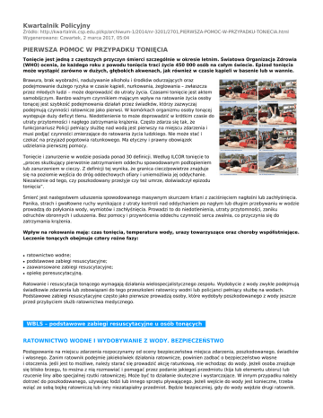 Kwartalnik Policyjny Źródło: http://kwartalnik.csp.edu.pl/kp/archiwum-1/2014/nr-3201/2701,PIERWSZA-POMOC-W-PRZYPADKU-TONIECIA.html Wygenerowano: Czwartek, 2 marca 2017, 05:04 PIERWSZA POMOC W PRZYPADKU TONIĘCIA Tonięcie jest jedną z częstszych przyczyn śmierci szczególnie w okresie letnim. Światowa Organizacja Zdrowia (WHO) ocenia, że każdego roku z powodu tonięcia traci życie 450 000 osób na całym świecie. Epizod tonięcia może wystąpić zarówno w dużych, głębokich akwenach, jak również w czasie kąpieli w basenie lub w wannie. Brawura, brak wyobraźni, nadużywanie alkoholu i środków odurzających oraz podejmowanie dużego ryzyka w czasie kąpieli, nurkowania, żeglowania – zwłaszcza przez młodych ludzi – może doprowadzić do utraty życia. Czasami tonięcie jest aktem samobójczym. Bardzo ważnym czynnikiem mającym wpływ na ratowanie życia osoby tonącej jest szybkość podejmowania działań przez świadków, którzy zazwyczaj podejmują czynności ratownicze jako pierwsi. W komórkach organizmu osoby tonącej występuje duży deficyt tlenu. Niedotlenienie to może doprowadzić w krótkim czasie do utraty przytomności i nagłego zatrzymania krążenia. Często zdarza się tak, że funkcjonariusz Policji pełniący służbę nad wodą jest pierwszy na miejscu zdarzenia i musi podjąć czynności zmierzające do ratowania życia ludzkiego. Nie może stać i czekać na przyjazd pogotowia ratunkowego. Ma etyczny i prawny obowiązek udzielania pierwszej pomocy. Tonięcie i zanurzenie w wodzie posiada ponad 30 definicji. Według ILCOR tonięcie to „proces skutkujący pierwotnie zatrzymaniem oddechu spowodowanym podtopieniem lub zanurzeniem w cieczy. Z definicji tej wynika, że granica ciecz/powietrze znajduje się na poziomie wejścia do dróg oddechowych ofiary i uniemożliwia jej oddychanie. Niezależnie od tego, czy poszkodowany przeżyje czy też umrze, doświadczył epizodu tonięcia”. Śmierć jest następstwem uduszenia spowodowanego masywnym skurczem krtani z zaciśnięciem nagłośni lub zachłyśnięcia. Panika, strach i gwałtowne ruchy wynikające z utraty kontroli nad oddychaniem po nagłym lub długim przebywaniu w wodzie prowadzą do połykania wody, wymiotów i zachłyśnięcia. Prowadzi to do niedotlenienia, utraty przytomności, zaniku odruchów obronnych i uduszenia. Bez pomocy i przywrócenia oddechu czynność serca zwalnia, co przyczynia się do zatrzymania krążenia. Wpływ na rokowania mają: czas tonięcia, temperatura wody, urazy towarzyszące oraz choroby współistniejące. Leczenie tonących obejmuje cztery rożne fazy: ● ● ● ● ratownictwo wodne; podstawowe zabiegi resuscytacyjne; zaawansowane zabiegi resuscytacyjne; opiekę poresuscytacyjną. Ratowanie i resuscytacja tonącego wymagają działania wielospecjalistycznego zespołu. Wydobycie z wody zwykle podejmują świadkowie zdarzenia lub zobowiązani do tego przeszkoleni ratownicy wodni lub policjanci pełniący służbę na wodach. Podstawowe zabiegi resuscytacyjne często jako pierwsze prowadzą osoby, które wydobyły poszkodowanego z wody jeszcze przed przybyciem służb ratownictwa medycznego. WBLS – podstawowe zabiegi resuscytacyjne u osób tonących RATOWNICTWO WODNE I WYDOBYWANIE Z WODY. BEZPIECZEŃSTWO Postępowanie na miejscu zdarzenia rozpoczynamy od oceny bezpieczeństwa miejsca zdarzenia, poszkodowanego, świadków i własnego. Zanim ratownik podejmie jakiekolwiek działania ratownicze, powinien zadbać o bezpieczeństwo własne i otoczenia. Jeśli jest to możliwe, należy starać się prowadzić akcję ratunkową, nie wchodząc do wody. Jeżeli osoba znajduje się blisko brzegu, to można z nią rozmawiać i pomagać przez podanie jakiegoś przedmiotu (kija lub elementu ubioru) lub rzucenie liny albo specjalnej rzutki ratowniczej. Może być to działanie skuteczne i wystarczające. W innym przypadku należy dotrzeć do poszkodowanego, używając łodzi lub innego sprzętu pływającego. Jeżeli wejście do wody jest konieczne, trzeba wziąć ze sobą bojkę ratowniczą lub inny niezatapialny przedmiot. Będzie bezpieczniej, gdy do wody wejdzie drugi ratownik. W trakcie akcji ratunkowej nie należy skakać do wody na głowę, ponieważ można stracić kontakt wzrokowy z poszkodowanym oraz ryzykować doznanie urazu kręgosłupa. Poszkodowanych należy wydobywać z wody w jak najszybszy i najbardziej bezpieczny sposób, a resuscytację trzeba rozpocząć tak szybko, jak to tylko możliwe. Ryzyko obrażeń szyjnego odcinka kręgosłupa u tonących jest bardzo małe (około 0,5%). Unieruchomienie kręgosłupa szyjnego w wodzie może być trudne do wykonania i może opóźnić wydobycie poszkodowanego oraz utrudnić resuscytację, dlatego nie jest wskazane, chyba że stwierdza się oznaki ciężkich obrażeń lub wywiad wskazuje na możliwość ich wystąpienia. Dotyczy to urazów doznanych podczas skoków do wody, a także zjazdów na zjeżdżalniach. Szczególnie ważnym elementem oceny bezpieczeństwa jest bezpieczeństwo własne. Udzielając pierwszej pomocy, możemy ulec ekspozycji na zakażenie wirusami HIV, HBV, HCV. W ramach ogólnej profilaktyki należy używać rękawiczek jednorazowych (lateksowych, winylowych) przy pracy z materiałem biologicznym, stanowiącym potencjalne źródło zakażenia (krwią, płynami ustrojowymi). Powinno się również chronić oczy, błony śluzowe ust i nosa przez zakładanie masek i okularów ochronnych. Stosowanie indywidualnych środków ochrony znacznie zmniejsza ryzyko zakażenia. Prowadząc oddech zastępczy, powinno się stosować maseczki do sztucznego oddychania. SPRAWDZENIE REAKCJI Po wykluczeniu zagrożeń należy przejść do kolejnego etapu postępowania. Trzeba sprawdzić, czy poszkodowany reaguje na bodźce przy pomocy schematu głos, dotyk. Powinno mówić się do poszkodowanego, do jednego i do drugiego ucha. Można powiedzieć: „Halo, proszę otworzyć oczy. Co się stało? Czy wszyst