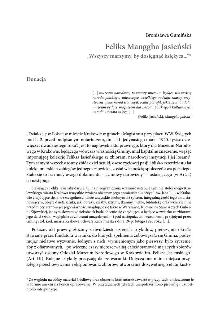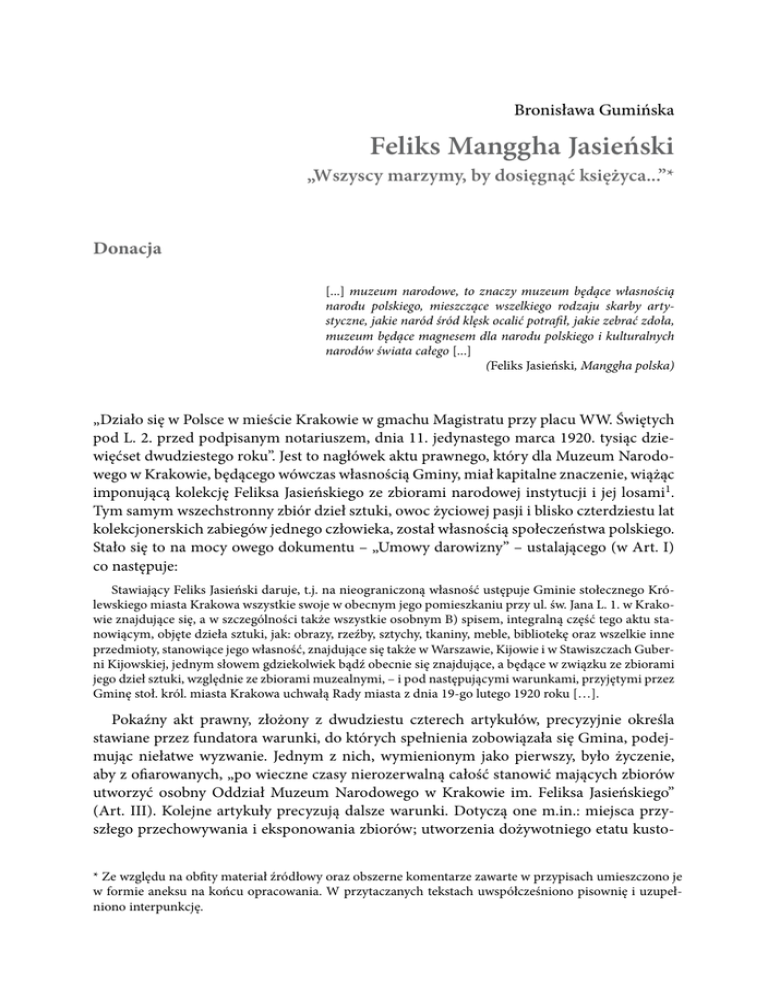 Bronisława Gumińska Feliks Manggha Jasieński „Wszyscy marzymy, by dosięgnąć księżyca...”* Donacja [...] muzeum narodowe, to znaczy muzeum będące własnością narodu polskiego, mieszczące wszelkiego rodzaju skarby arty‑ styczne, jakie naród śród klęsk ocalić potrafił, jakie zebrać zdoła, muzeum będące magnesem dla narodu polskiego i kulturalnych narodów świata całego [...] (Feliks Jasieński, Manggha polska) „Działo się w Polsce w mieście Krakowie w gmachu Magistratu przy placu WW. Świętych pod L. 2. przed podpisanym notariuszem, dnia 11. jedynastego marca 1920. tysiąc dzie‑ więćset dwudziestego roku”. Jest to nagłówek aktu prawnego, który dla Muzeum Narodo‑ wego w Krakowie, będącego wówczas własnością Gminy, miał kapitalne znaczenie, wiążąc imponującą kolekcję Feliksa Jasieńskiego ze zbiorami narodowej instytucji i jej losami1. Tym samym wszechstronny zbiór dzieł sztuki, owoc życiowej pasji i blisko czterdziestu lat kolekcjonerskich zabiegów jednego człowieka, został własnością społeczeństwa polskiego. Stało się to na mocy owego dokumentu – „Umowy darowizny” – ustalającego (w Art. I) co następuje: Stawiający Feliks Jasieński daruje, t.j. na nieograniczoną własność ustępuje Gminie stołecznego Kró‑ lewskiego miasta Krakowa wszystkie swoje w obecnym jego pomieszkaniu przy ul. św. Jana L. 1. w Krako‑ wie znajdujące się, a w szczególności także wszystkie osobnym B) spisem, integralną część tego aktu sta‑ nowiącym, objęte dzieła sztuki, jak: obrazy, rzeźby, sztychy, tkaniny, meble, bibliotekę oraz wszelkie inne przedmioty, stanowiące jego własność, znajdujące się także w Warszawie, Kijowie i w Stawiszczach Guber‑ ni Kijowskiej, jednym słowem gdziekolwiek bądź obecnie się znajdujące, a będące w związku ze zbiorami jego dzieł sztuki, względnie ze zbiorami muzealnymi, – i pod następującymi warunkami, przyjętymi przez Gminę stoł. król. miasta Krakowa uchwałą Rady miasta z dnia 19‑go lutego 1920 roku […]. Pokaźny akt prawny, złożony z dwudziestu czterech artykułów, precyzyjnie określa stawiane przez fundatora warunki, do których spełnienia zobowiązała się Gmina, podej‑ mując niełatwe wyzwanie. Jednym z nich, wymienionym jako pierwszy, było życzenie, aby z ofiarowanych, „po wieczne czasy nierozerwalną całość stanowić mających zbiorów utworzyć osobny Oddział Muzeum Narodowego w Krakowie im. Feliksa Jasieńskiego” (Art. III). Kolejne artykuły precyzują dalsze warunki. Dotyczą one m.in.: miejsca przy‑ szłego przechowywania i eksponowania zbiorów; utworzenia dożywotniego etatu kusto‑ * Ze względu na obfity materiał źródłowy oraz obszerne komentarze zawarte w przypisach umieszczono je w formie aneksu na końcu opracowania. W przytaczanych tekstach uwspółcześniono pisownię i uzupeł‑ niono interpunkcję. 18 Bronisława Gumińska sza dla kierującego Oddziałem Feliksa Jasieńskiego; oddania mu do użytku odpowied‑ niego mieszkania (w sąsiedztwie zgromadzonych zbiorów); ustanowienia jego (niemal nieograniczonych) uprawnień do dysponowania kolekcją (wystawy, decyzje o zakupach, wymienianiu i wycofywaniu obiektów); precyzyjnego ustalenia warunków finansowych zabezpieczających utrzymanie Oddziału (zakupy dzieł sztuki, konserwacje, obsługa, me‑ dia) i mieszkania kolekcjonera. W tymże akcie (Art. XIX) ustalono również, iż „z chwilą śmierci stawiającego [Feliksa Jasieńskiego] przechodzi wyłączny i niczym nie ograniczony zarząd Oddziałem na Dyrekcję Muzeum Narodowego”. Dokument podpisali (w obecno‑ ści notariusza Józefa Grodyńskiego): Feliks Jasieński, I wiceprezydent m. Krakowa dr Er‑ nest Bandrowski, pełniący funkcję radców miejskich – prof. dr Julian Nowak i prof. dr Jó‑ zef Muczkowski oraz „dobrowolnie do aktu tego przystępujący” Henryk Jasieński, syn darczyńcy. Na sporządzonym 27 marca tegoż roku uwierzytelnionym odpisie załączników do po‑ wyższego dokumentu 9 listopada 1921 Henryk Jasieński dokonał istotnego – zapewne wy‑ nikającego z wymogów prawnych – własnoręcznego wpisu: „Ja niżej podpisany jedyny syn Feliksa i nieżyjącej Teresy z Łabęckich małżonków Jasieńskich oświadczam, iż rościć nie będę żadnych pretensji do darowizny uczynionej przez Ojca mojego na rzecz gminy mia‑ sta Krakowa”. Obok jego podpisu widnieje autograf Leona Wyczółkowskiego występujące‑ go w roli świadka Feliksa i Henryka Jasieńskich. „W sposób symboliczny przez podpisanie niniejszego” Feliks Jasieński oddał swoje zbiory w posiadanie miastu, przypieczętowując swoje wieloletnie więzi z Muzeum Narodowym i finalizując ideę, która dojrzewała długo, z trudem, w atmosferze uzasadnionego zaangażowania ze strony Muzeum, natomiast nie zawsze pełnego zrozumienia i docenienia wagi sprawy przez decydentów we władzach miejskich. Ofiarowana kolekcja, której przebogaty zasób kwituje lakoniczny dwustronicowy spis dzieł (załącznik „B” do „Umowy darowizny”), jest zbiorem bardzo obfitym i wszechstron‑ nym2. O jej wyjątkowej wartości przesądza zarówno ranga artystyczna zebranych blisko 20 tysięcy muzealiów, jak i różnorodność polskich, europejskich, blisko- i dalekowschodnich dzieł sztuki wszelkich dziedzin, z czasów od średniowiecza po współczesne kolekcjonero‑ wi. Wśród nich miejsce szczególne, w skali europejskiej, zajmuje zbiór sztuki Dalekiego Wschodu, ponad 6 tysięcy dzieł pochodzących przede wszystkim z Japonii i Chin, ale także (w mniejszym zakresie) z Azji Południowo‑Wschodniej (Indie, Syjam, Kambodża, Korea, Indonezja) oraz Azji Centralnej (Mongolia, Tybet). Reprezentowane są w nim rozmaite dziedziny sztuki: malarstwo, rzeźba, tkaniny, ceramika, brązy, militaria, wyroby z laki, wśród nich 4 600 plansz barwnych drzeworytów japońskich. Bezsprzecznie największą pasją Jasieńs
