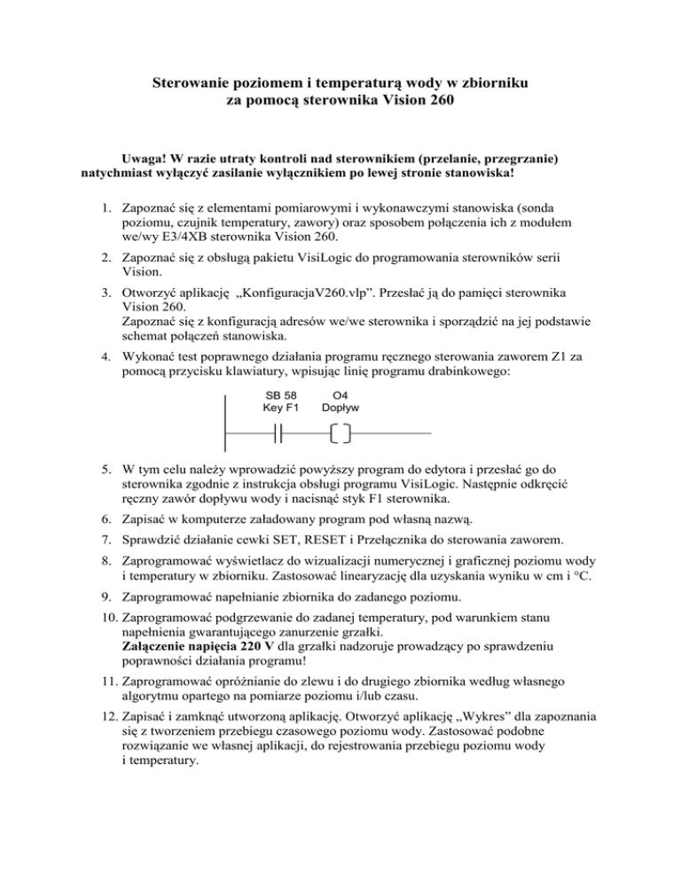 Sterowanie poziomem i temperaturą wody w zbiorniku za pomocą sterownika Vision 260 Uwaga! W razie utraty kontroli nad sterownikiem (przelanie, przegrzanie) natychmiast wyłączyć zasilanie wyłącznikiem po lewej stronie stanowiska! 1. Zapoznać się z elementami pomiarowymi i wykonawczymi stanowiska (sonda poziomu, czujnik temperatury, zawory) oraz sposobem połączenia ich z modułem we/wy E3/4XB sterownika Vision 260. 2. Zapoznać się z obsługą pakietu VisiLogic do programowania sterowników serii Vision. 3. Otworzyć aplikację „KonfiguracjaV260.vlp”. Przesłać ją do pamięci sterownika Vision 260. Zapoznać się z konfiguracją adresów we/we sterownika i sporządzić na jej podstawie schemat połączeń stanowiska. 4. Wykonać test poprawnego działania programu ręcznego sterowania zaworem Z1 za pomocą przycisku klawiatury, wpisując linię programu drabinkowego: SB 58 Key F1 O4 Dopływ 5. W tym celu naleŜy wprowadzić powyŜszy program do edytora i przesłać go do sterownika zgodnie z instrukcja obsługi programu VisiLogic. Następnie odkręcić ręczny zawór dopływu wody i nacisnąć styk F1 sterownika. 6. Zapisać w komputerze załadowany program pod własną nazwą. 7. Sprawdzić działanie cewki SET, RESET i Przełącznika do sterowania zaworem. 8. Zaprogramować wyświetlacz do wizualizacji numerycznej i graficznej poziomu wody i temperatury w zbiorniku. Zastosować linearyzację dla uzyskania wyniku w cm i °C. 9. Zaprogramować napełnianie zbiornika do zadanego poziomu. 10. Zaprogramować podgrzewanie do zadanej temperatury, pod warunkiem stanu napełnienia gwarantującego zanurzenie grzałki. Załączenie napięcia 220 V dla grzałki nadzoruje prowadzący po sprawdzeniu poprawności działania programu! 11. Zaprogramować opróŜnianie do zlewu i do drugiego zbiornika według własnego algorytmu opartego na pomiarze poziomu i/lub czasu. 12. Zapisać i zamknąć utworzoną aplikację. Otworzyć aplikację „Wykres” dla zapoznania się z tworzeniem przebiegu czasowego poziomu wody. Zastosować podobne rozwiązanie we własnej aplikacji, do rejestrowania przebiegu poziomu wody i temperatury. Schemat połączeń sterownika Vision 260 (pomoc do wykreślenia własnego schematu z opisem szczegółowym) W sprawozdaniu naleŜy zamieścić: 1. Wykaz i krótki opis elementów stanowiska: pomiarowych, wykonawczych i sterujących 2. Krótki opis zasad programowania sterownika z przykładami operacji elementarnych i wykorzystania ekranu 3. Opis algorytmu własnego procesu sterowania poziomem wody i jej temperaturą 4. Schemat wprowadzonego programu 5. Komentarz do programu 6. Komentarz do ćwiczenia (trudności, propozycje itp.)