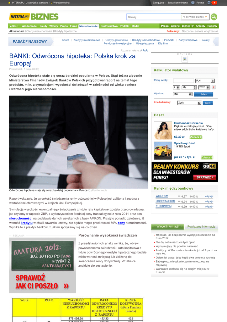 INTERIA.PL - Ustaw jako startową Wersja mobilna Zaloguj się Załóż Konto Interia Prasa Galerie BiznesTV Ankiety Raporty Wiadomości Giełdy Waluty Praca Firma Nieruchomości Budownictwo Podatki Media Aktualności Oferty nieruchomości Kredyty hipoteczne PASAŻ FINANSOWY Konta Ding 1 w serwisie Biznes Szukaj Start Poczta Polecamy: Deccoria - serwis wnętrzarski Kredyty mieszkaniowe Kredyty gotówkowe Kredyty samochodowe Pożyczki Fundusze inwestycyjne Ubezpieczenia Dla firm Karty kredytowe Lokaty Rozmiar tekstu: A A A BANKI: Odwrócona hipoteka: Polska krok za Europą! Poniedziałek, 7 maja (06:00) Kalkulator walutowy Odwrócona hipoteka staje się coraz bardziej popularna w Polsce. Stąd też na zlecenie Ministerstwa Finansów Związek Banków Polskich przygotował raport na temat tego produktu, m.in. z symulacjami wysokości świadczeń w zależności od wieku seniora i wartości jego nieruchomości. Podaj kwotę: 6 PLN 7 6 Wynik w: PLN Inne kalkulatory: 6 Maj 6 2012 6 oblicz 6 Zysk dalej Pasaż Biustonosz Gorsenia Pięknie kształtujący biust. Górę misek zdobi tiul w kwiatowe hafty. 63,30 zł Zobacz > Sportowy Seat 1.9 TDI Sport juz za 12 tys. zł Rynek międzybankowy Odwrócona hipoteka staje się coraz bardziej popularna w Polsce /(c) Panthermedia Raport wskazuje, że wysokość świadczenia renty dożywotniej w Polsce jest zbliżona i zgodna z wartościami oferowanymi w krajach Unii Europejskiej. Symulacja wysokości ewentualnego świadczenia z tytułu raty kapitałowej została przeprowadzona, jak czytamy w raporcie ZBP, z wykorzystaniem średniej ceny transakcyjnej z roku 2011 oraz cen nieruchomości na podstawie danych uzyskanych z bazy AMRON. Przyjęto ponadto założenie, iż wartość kredytu w chwili zawarcia umowy, nie będzie mogła przekraczać 50% ceny nieruchomości. Wynika to z praktyk banków, z jakimi spotykamy się na co dzień. Porównanie wysokości świadczeń Z przedstawionych analiz wynika, że, wbrew powszechnemu twierdzeniu, rata kapitałowa z tytułu odwróconego kredytu hipotecznego będzie miała wartość mniejszą lub zbliżoną do świadczenia renty dożywotniej. W tabelce znajduje się zestawienie: Zobacz > WIBOR6M 4,97 0,00% w ięcej> LIBOR6M(EUR) 0,94 0,03% w ięcej> EURIBOR6M 0,99 -0,40% w ięcej> Więcej informacji Powiązane informacje 10 porad, jak bezpiecznie wynająć mieszkanie na Euro 2012 Nie daj sobie narzucić tych opłat! Wynajmujący nie powinni narzekać Analitycy: W Gorzowie mieszkania już od 2 tys. zł za metr kw. Osiem lat pracy, żeby kupić dwa pokoje z kuchnią Zabezpiecz mieszkanie zanim wyjedziesz na majówkę Warszawa znalazła się na drugim miejscu w Europie Ustawa nieopłacalna dla młodych Z raportu przedstawionego przez Związek Banków Polskich jasno wynika, że odwrócony kredyt hipoteczny będzie produktem całkowicie nieopłacalnym dla osób poniżej 60 roku życia. W raporcie czytamy: "(...) wysokość raty kapitałowej dla osób, które nie ukończyły przynajmniej 60 roku życia kształtuje się na poziomie bardzo nieatrakcyjnym czy wręcz symbolicznym, a w związku z tym trudno się spodziewać, aby odwrócona hipoteka była produktem powszechnym w tej grupie wiekowej." Potwierdza to obecne wątpliwości, które towarzyszą propozycji, aby odwrócony kredyt hipoteczny był ofertą skierowaną do wszystkich, a nie tylko i wyłącznie do seniorów powyżej 65 roku życia. Ryzykowna inwestycja Przedstawione w raporcie ZBP symulacje są czysto hipotetyczne. Nie stanowią oferty żadnego z banków. Na tę chwilę bowiem tylko niektóre z nich wyrażają jakiekolwiek zainteresowanie produktem odwróconego kredyty hipotecznego. Dla banku jest to bardzo ryzykowna inwestycja. Po pierwsze dlatego, że bank nie ma stuprocentowej pewności, kiedy nastąpi spłata długu. Po drugie - istnieje duże prawdopodobieństwo, że zanim bank otrzyma spłatę kredytu, będzie zmuszony wyłożyć pieniądze na spadkobierców, którzy nie będą zainteresowani odzyskaniem nieruchomości. Ustawa niesie ryzyko również dla samego kredytobiorcy. Poważne wątpliwości budzi nadal fakt okresowości świadczenia odwróconego kredytu hipotecznego. Kolejną istotną kwestią są koszty, jakie senior będzie musiał ponosić z tytułu wykonywania prawa własności nieruchomości ubezpieczenie, czynsz , remonty czy podatki .Jak wiemy są to znaczące pozycje w budżecie osób starszych komentuje Maria Schicht prezes Funduszu Hipotecznego Familia. Pod tym względem oferta renty dożywotniej wydaje się bardziej korzystna. Interesuje Cię temat "Finanse osobiste"? Kliknij, a nie przegapisz kolejnych materiałów: Powiadom mnie Finanse osobiste Nieruchomości Więcej o: hipoteka, hipoteka odwrócona, bank Oceń artykuł: 26% zobacz ranking > 74% Ocen: 19 Podziel się linkiem! w ięcej Osiedle Parkowe Agregator pracy GoWork Nowoczesne mieszkania pod Warszawą Sprawdź naszą ofertę. jeden klik i wszystkie ogłoszenia pracy w Polsce w zasięgu ręki!!! Z O B A C Z R Ó W N I EŻ Nie daj sobie narzucić tych opłat! Wynajmujący nie powinni narzekać 11 decyzji dotyczących gmin i spółek komunalnych świadczących usługi Zdaniem analityków rynek wynajmu mieszkań ma dobre perspektywy. Kłopoty ze WASZE KOMENTARZE (24) Ja pierdzielę , ale ludzi chcą robić w konia? Oczywiście wmawiając mu że jest tak PO europejsku. dodaj komentarz (2012-05-07 09:04) ~boss NAJCIEKAWSZE TEMATY NA FORUM Polskie banki - dobra mina do złej gry? Pracodawca - problemy z pracą zdalną Polska jest krok za Europą, tylko że jest to krok siedmiomilowy ! (2012-05-07 08:59) ~ed KOMUNO WRÓC !!! (2012-05-07 08:57) ~444444 (2012-05-07 08:50) ~Namor (2012-05-07 08:38) ~czesiu ZALEGALIZOWANE Z Ł O D Z I E J S T W O !!!! wybuduj dom na kredyt pożyczony od banków za (1) 200 % jego wartości a potem go sprzedaj tym samym bankom za 40 % jego wartości. Po prostu intere... Wasze ulice, nasze kamienice. ZALEGALIZOWANE Z Ł O D Z I E J S T W O !!!! Czy bank udzieli mi r