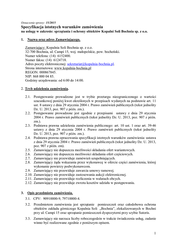 Oznaczenie sprawy: 15/2015 Specyfikacja istotnych warunków zamówienia na usługę w zakresie: sprzątania i ochrony obiektów Kopalni Soli Bochnia sp. z o.o. 1. Nazwa oraz adres Zamawiającego. Zamawiający: Kopalnia Soli Bochnia sp. z o.o. 32-700 Bochnia, ul. Campi 15, woj. małopolskie, pow. bocheński. Numer telefonu: (14) 6152400. Numer faksu: (14) 6124718. Adres poczty elektronicznej: [email protected]. Strona internetowa: www.kopalnia-bochnia.pl REGON: 000867845. NIP: 868 000 04 85. Godziny urzędowania: od 6:00 do 14:00. 2. Tryb udzielenia zamówienia. 2.1. Postępowanie prowadzone jest w trybie przetargu nieograniczonego o wartości szacunkowej poniżej kwot określonych w przepisach wydanych na podstawie art. 11 ust. 8 ustawy z dnia 29 stycznia 2004 r. Prawo zamówień publicznych (tekst jednolity Dz. U. 2013, poz. 907 z późn. zm.). 2.2. Postępowanie prowadzone jest zgodnie z przepisami ustawy z dnia 29 stycznia 2004 r. Prawo zamówień publicznych (tekst jednolity Dz. U. 2013, poz. 907 z późn. zm.). 2.3. Podstawa prawna udzielenia zamówienia publicznego: art. 10 ust. 1 oraz art. 39-46 ustawy z dnia 29 stycznia 2004 r. Prawo zamówień publicznych (tekst jednolity Dz. U. 2013, poz. 907 z późn. zm.). 2.4. Podstawa prawna opracowania specyfikacji istotnych warunków zamówienia: ustawa z dnia 29 stycznia 2004 r. Prawo zamówień publicznych (tekst jednolity Dz. U. 2013, poz. 907 z późn. zm). 2.5. Zamawiający nie dopuszcza możliwości składania ofert wariantowych. 2.6. Zamawiający nie dopuszcza możliwości składania ofert częściowych. 2.7. Zamawiający nie przewiduje zamówień uzupełniających. 2.8. Zamawiający żąda wskazania przez wykonawcę w ofercie części zamówienia, której wykonanie powierzy podwykonawcom. 2.9. Zamawiający nie przewiduje zawarcia umowy ramowej. 2.10. Zamawiający nie przewiduje zastosowania aukcji elektronicznej. 2.11. Zamawiający nie przewiduje rozliczenia w walutach obcych. 2.12. Zamawiający nie przewiduje zwrotu kosztów udziału w postępowaniu. 3. Opis przedmiotu zamówienia. 3.1. CPV: 90910000-9, 79710000-4. 3.2. Przedmiotem zamówienia jest sprzątanie pomieszczeń oraz całodobowa ochrona obiektów zakładu górniczego Kopalnia Soli „Bochnia”, zlokalizowanych w Bochni przy ul. Campi 15 oraz sprzątanie pomieszczeń dyspozytorni przy szybie Sutoris. 3.3. Zamawiający nie narzuca liczby roboczogodzin w trakcie świadczenia usług, zadanie winno być realizowane zgodnie z poniższym opisem. 1 3.4. Zadania ochronne Wykonawca sprawować będzie poprzez osoby fizyczne wpisane na listę kwalifikowanych pracowników ochrony fizycznej, prowadzoną zgodnie z art. 28 ustawy z dna 22 sierpnia 1997 r. o ochronie osób i mienia (tekst jednolity Dz. U. z 2014 poz. 1099) w zakresie: 1) zapewnienia bezpieczeństwa osób i mienia na terenie Kopalni, 2) strzeżenia budynków, budowli i terenów zlokalizowanych przy szybie „Campi” zgodnie z wykazem, przez całą dobę, (powierzchnia obszaru dozorowanego wynosi 1,7 ha), 3) stałego dozoru sygnałów przesyłanych i gromadzonych w elektronicznych urządzeniach (telewizja przemysłowa zainstalowana na terenie Kopalni), 4) bieżącego informowania kierownictwa Kopalni i odpowiednich służb o zaistniałych i potencjalnych zagrożeniach , 5) obsługi bram wjazdowych Kopalni i dbania aby miejsca postojowe wyznaczone do celów przeciwpożarowych nie były zajmowane przez inne pojazdy, 6) zapobiegania włamaniom, kradzieżom oraz niszczeniu mienia Zamawiającego, 7) natychmiastowe zgłaszanie zdarzeń w chwili powzięcia o nich wiadomości, umożliwiające podjęcie interwencji w czasie do 20 minut od chwili zgłoszenia, zdarzenia należy zgłaszać grupie interwencyjnej będącej w dyspozycji Wykonawcy, 8) sprawdzania i kontrolowania osób wchodzących i wychodzących z zakładu, 9) wydawania oraz prowadzenia ewidencji przepustek upoważniających do wejścia na teren Kopalni, zgodnie z odpowiednią instrukcją, 10) zabezpieczenia zdawanych kluczy od wszystkich pomieszczeń, nadzór nad ich wydawaniem, zgodnie z wykazem, 11) prowadzenia rejestru wydawanych kluczy, 12) sprawdzania zgodności wynoszonego bądź wywożonego materiału z przepustką materiałową wystawioną przez osoby uprawnione, 13) prowadzenia ewidencji materiałów wywożonych i wynoszonych, 14) sprawdzania pojazdów samochodowych wjeżdżających i wyjeżdżających z terenu zakładu w aspekcie posiadania ważnych dokumentów zezwalających na wjazd lub wyjazd, 15) włączania o zmroku i wyłączania o świcie oświetlenia dozorowanych obiektów, 16) prowadzenie dziennika służby i odnotowywania nieprawidłowości oraz zaleconych informacji, 17) w przypadku pożaru, awarii wodociągowej, kanalizacyjnej, ciepłowniczej itp. wezwania odpowiednich służb miejskich oraz telefoniczne powiadomienie dyspozytora ruchu zakładu górniczego, 18) wydawania pracownikom znaczków kontrolnych, 19) przestrzeganie przepisów i zasad bhp oraz ppoż., 20) zachowanie bezwzględnej trzeźwości w czasie zmiany. wszystkich zauważonych 2 3.5. Wykaz Budynków, budowli i terenów objętych ochroną zlokalizowanych przy szybie „Campi”: 1) Budynek cechowni, 2) Budynek cechowni – szatnia, 3) Budynek warsztatu mechanicznego, 4) Budynek elektrycznej maszyny wyciągowej „Campi”, 5) Budynek nadszybia szybu „Campi”, 6) Budynek „Stara Warzenia”, 7) Budynek parowej maszyny wyciągowej, 8) Pawilon wejściowy do budynku nadszybia szybu „Campi”, 9) Parkingi wewnętrzne i zewnętrzne, 10) Budynek sprężarkowni, 11) Nieczynny komin przemysłowy, 12) Budynek wywrotu, 13) Place magazynowe. 3.6. Wykaz pojazdów samochodowych: 1) FS – Lublin Nr Rej. KBC 20JP, 2) URSUS C – 360 3P Nr Rej. KBC T375, 3) Przyczepa 2,5 T Nr Rej. TAP 167D, 4) Skoda Octavia 1,6 Combi Clasic Nr Rej. KBC 11040, 5) Wózek widłowy GV 3792, 6) Wózek widłowy Toyota 02-7FGF30, 7) Ford Transit KBC 35435, 8) Skoda Roomster KBC 2570, 9) Peugeot Partner KTA 57857. 3