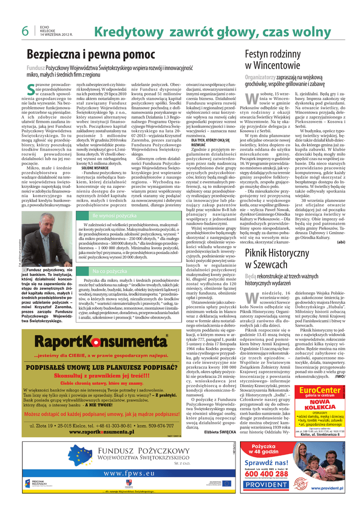 6 ECHO KIELECKIE 14 WRZEŒNIA 2012 R. Kredytowy zawrót g³owy, czas wolny Bezpieczna i pewna pomoc Fundusz Po¿yczkowy Województwa Œwiêtokrzyskiego wspiera rozwój i innowacyjnoœæ mikro, ma³ych i œrednich firm z regionu prawne prowadzenie przedsiêbiorstw w czasach spowolnienia gospodarczego to nie lada wyzwanie. Na bezproblemowe funkcjonowanie potrzebne s¹ pieni¹dze. A ich zdobycie mo¿e u³atwiæ firmom zaufana instytucja, jak¹ jest Fundusz Po¿yczkowy Województwa Œwiêtokrzyskiego. To tu mog¹ zg³osiæ siê przedsiêbiorcy, którzy poszukuj¹ œrodków finansowych na rozwój prowadzonej dzia³alnoœci lub na jej rozpoczêcie. Mikro, ma³e i œrednie przedsiêbiorstwa prowadz¹ce dzia³alnoœæ na terenie województwa œwiêtokrzyskiego napotykaj¹ trudnoœci w zdobyciu finansowania komercyjnego na przyk³ad kredytu bankowego, z powodu braku wymaga- S nych zabezpieczeñ czy historii kredytowej. W odpowiedzi na ich potrzeby 29 lipca 2010 roku aktem notarialnym zosta³ zawi¹zany Fundusz Po¿yczkowy Województwa Œwiêtokrzyskiego Sp. z o.o., który stanowi alternatywê wobec instytucji finansowych. Pocz¹tkowo kapita³ zak³adowy zosta³ ustalony na poziomie 5 milionów z³otych. W grudniu 2010 roku w³adze wojewódzkie postanowi³y zwiêkszyæ go o 4,5 miliona z³otych. W chwili obecnej wynosi on niebagateln¹ kwotê 9,5 miliona z³otych. SOLIDNE WSPARCIE - Fundusz po¿yczkowy, to instytucja niebêd¹ca bankiem, której dzia³alnoœæ koncentruje siê na zapewnieniu dostêpu do zewnêtrznych Ÿróde³ kapita³u mikro, ma³ych i œrednich przedsiêbiorstw poprzez udzielanie po¿yczek. Obecnie Fundusz dysponuje kwot¹ ponad 51 milionów z³otych stanowi¹c¹ kapita³ po¿yczkowy spó³ki. Œrodki finansowe pochodz¹ z dofinansowania pozyskanego w ramach Dzia³ania 1.3 Regionalnego Programu Operacyjnego Województwa Œwiêtokrzyskiego na lata 2007-2013 – wyjaœnia Krzysztof Zaremba, prezes zarz¹du Funduszu Po¿yczkowego Województwa Œwiêtokrzyskiego. G³ównym celem dzia³alnoœci Funduszu Po¿yczkowego Województwa Œwiêtokrzyskiego jest wspieranie przedsiêbiorców z naszego regionu. - Wychodz¹ naprzeciw wymaganiom stawianym przez wspó³czesny rynek staramy siê pod¹¿aæ za nowoczesnymi i dobrymi trendami, dlatego jesteœmy Fot. archiwum prywatne Ile wynosi po¿yczka n - Fundusz po¿yczkowy, nie jest bankiem. To instytucja, której dzia³alnoœæ koncentruje siê na zapewnieniu dostêpu do zewnêtrznych Ÿróde³ kapita³u mikro, ma³ych i œrednich przedsiêbiorstw poprzez udzielanie po¿yczek – mówi Krzysztof Zaremba, prezes zarz¹du Funduszu Po¿yczkowego Województwa Œwiêtokrzyskiego. W zale¿noœci od wielkoœci przedsiêbiorstwa, maksymalne kwoty po¿yczek s¹ ró¿ne. Maksymalna kwota po¿yczki, o ile przedsiêbiorca posiada zdolnoœæ po¿yczkow¹, wynosi: * dla mikro przedsiêbiorstwa – 250 000 z³otych, * dla ma³ego przedsiêbiorstwa – 500 000 z³otych, * dla œredniego przedsiêbiorstwa – 1 000 000 z³otych. Minimalna kwota po¿yczki, jaka mo¿e byæ przyznana, o ile przedsiêbiorca posiada zdolnoœæ po¿yczkow¹ wynosi 20 000 z³otych. Na co po¿yczka Po¿yczka dla mikro, ma³ych i œrednich przedsiêbiorstw mo¿e byæ udzielona na zakup: * œrodków trwa³ych, takich jak: grunty, budowle, budynki, lokale, obiekty in¿ynierii l¹dowej i wodnej,maszyny,urz¹dzenia,œrodkitransportu; *przedmiotów, o których mowa wy¿ej, niezaliczonych do œrodków trwa³ych; * wartoœci niematerialnych i prawnych; * us³ug, takich jak roboty budowlane, remontowe, monta¿owe i instalacyjne,us³ugiprojektowe,doradztwa,przeprowadzaniabadañ i analiz, szkoleniowe i promocji; * œrodków obrotowych. otwarci na wspó³pracê z fundacjami, stowarzyszeniami i innymi organizacjami z otoczenia biznesu. Dzia³alnoœæ Funduszu wspiera rozwój lokalnej i regionalnej przedsiêbiorczoœci oraz korzystnie wp³ywa na rozwój ca³ej gospodarki poprzez wzrost jej konkurencyjnoœci i innowacyjnoœci – zaznacza nasz rozmówca. DLA TYCH, KTÓRZY CHC¥ SIÊ ROZWIJAÆ Zgodnie z przyjêtym regulaminem dzia³alnoœci po¿yczkowej zatwierdzonym przez radê nadzorcz¹ wyodrêbniono dwie grupy przysz³ych po¿yczkobiorców, którzy bêd¹ mogli skorzystaæ z ewentualnych preferencji, s¹ to mikroprzedsiêbiorcy oraz przedsiêbiorcy realizuj¹cy przedsiêwziêcia innowacyjne lub planuj¹cy zakup patentów b¹dŸ prac wyników B+R lub planuj¹cy nawi¹zanie wspó³pracy z jednostkami naukowo-badawczymi. Wy¿ej wymienione grupy przedsiêbiorców bêd¹ mog³y skorzystaæ z nastêpuj¹cych preferencji: obni¿enie wysokoœci wk³adu w³asnego w przedsiêwziêciach inwestycyjnych, podniesienie wysokoœci po¿yczki powy¿ej ustalonych w regulaminie dzia³alnoœci po¿yczkowej maksymalnej kwoty po¿yczki, d³ugoœæ po¿yczki mo¿e zostaæ wyd³u¿ona do 120 miesiêcy, obni¿enie ³¹cznej mar¿y funduszu, obni¿enie op³at i prowizji. Ustanowienie jako zabezpieczenia sp³aty po¿yczki minimum weksla in blanco wraz z deklaracj¹ wekslow¹ oraz w formie aktu notarialnego oœwiadczenia o dobrowolnym poddaniu siê egzekucji, o którym mowa w artykule 777, paragraf 1, punkt 5 ustawy z dnia 17 listopada 1964 roku Kodeks postêpowania cywilnego w przypadku, gdy wysokoœæ po¿yczki na cele inwestycyjne nie przekracza kwoty 100 000 z³otych, okres sp³aty po¿yczki nie przekracza 24 miesiêcy, wnioskodawca jest przedsiêbiorc¹ o dobrej kondycji ekonomiczno-finansowej. O po¿yczkê z Funduszu Po¿yczkowego Województwa Œwiêtokrzyskiego mog¹ siê równie¿ ubiegaæ osoby, które planuj¹ rozpocz¹æ swoj¹ dzia³alnoœæ gospodarcz¹. El¿bieta ŒWIÊCKA Festyn rodzinny w Wincentowie Organizatorzy zapraszaj¹ na wojskow¹ grochówkê, wspólne grillowanie i zabawê sobotê, 15 wrzeœnia w Wincentowie w gminie Piekoszów odbêdzie siê festyn rodzinny z okazji otwarcia Œwietlicy Wiejskiej w Wincentowie. Na tê okazjê przyjedzie delegacja z Kosowa i z Serbii. W tym dniu planowane jest oficjaln