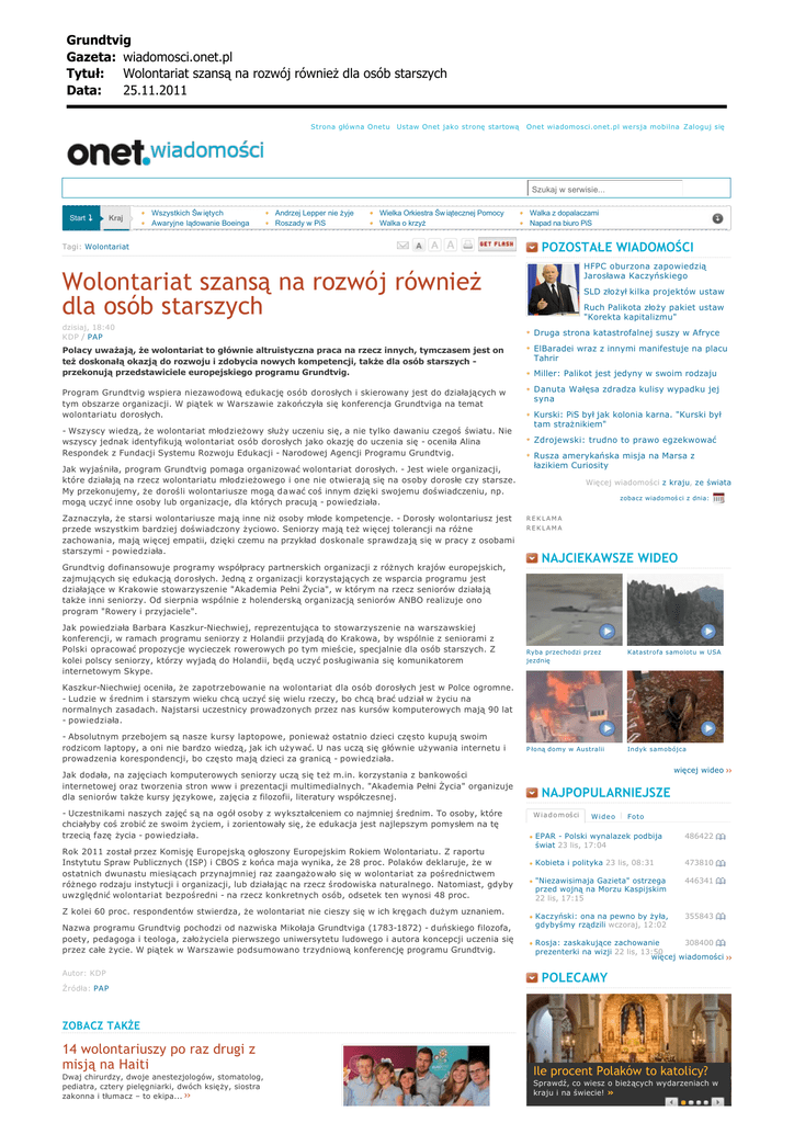 Grundtvig Gazeta: wiadomosci.onet.pl Tytu³: Wolontariat szans¹ na rozwój równie¿ dla osób starszych Data: 25.11.2011 Strona główna Onetu Start Kraj Start Regionalne Kraj Świat Kiosk Nauka Wszystkich Św iętych Awaryjne lądowanie Boeinga Ciekawostki Ustaw Onet jako stronę startową Waszym zdaniem Andrzej Lepper nie żyje Roszady w PiS Inne Wybory Wielka Orkiestra Św iątecznej Pomocy Walka o krzyż IVONA Webreader Tagi: Wolontariat Onet wiadomosci.onet.pl wersja mobilna Zaloguj się Walka z dopalaczami Napad na biuro PiS POZOSTAŁE WIADOMOŚCI HFPC oburzona zapowiedzią Jarosława Kaczyńskiego Wolontariat szansą na rozwój również dla osób starszych dzisiaj, 18:40 KDP / PAP Szukaj Szukaj w serwisie... SLD złożył kilka projektów ustaw Ruch Palikota złoży pakiet ustaw "Korekta kapitalizmu" Druga strona katastrofalnej suszy w Afryce Polacy uważają, że wolontariat to głównie altruistyczna praca na rzecz innych, tymczasem jest on też doskonałą okazją do rozwoju i zdobycia nowych kompetencji, także dla osób starszych przekonują przedstawiciele europejskiego programu Grundtvig. ElBaradei wraz z innymi manifestuje na placu Tahrir Program Grundtvig wspiera niezawodową edukację osób dorosłych i skierowany jest do działających w tym obszarze organizacji. W piątek w Warszawie zakończyła się konferencja Grundtviga na temat wolontariatu dorosłych. Danuta Wałęsa zdradza kulisy wypadku jej syna - Wszyscy wiedzą, że wolontariat młodzieżowy służy uczeniu się, a nie tylko dawaniu czegoś światu. Nie wszyscy jednak identyfikują wolontariat osób dorosłych jako okazję do uczenia się - oceniła Alina Respondek z Fundacji Systemu Rozwoju Edukacji - Narodowej Agencji Programu Grundtvig. Jak wyjaśniła, program Grundtvig pomaga organizować wolontariat dorosłych. - Jest wiele organizacji, które działają na rzecz wolontariatu młodzieżowego i one nie otwierają się na osoby dorosłe czy starsze. My przekonujemy, że dorośli wolontariusze mogą dawać coś innym dzięki swojemu doświadczeniu, np. mogą uczyć inne osoby lub organizacje, dla których pracują - powiedziała. Zaznaczyła, że starsi wolontariusze mają inne niż osoby młode kompetencje. - Dorosły wolontariusz jest przede wszystkim bardziej doświadczony życiowo. Seniorzy mają też więcej tolerancji na różne zachowania, mają więcej empatii, dzięki czemu na przykład doskonale sprawdzają się w pracy z osobami starszymi - powiedziała. Grundtvig dofinansowuje programy współpracy partnerskich organizacji z różnych krajów europejskich, zajmujących się edukacją dorosłych. Jedną z organizacji korzystających ze wsparcia programu jest działające w Krakowie stowarzyszenie "Akademia Pełni Życia", w którym na rzecz seniorów działają także inni seniorzy. Od sierpnia wspólnie z holenderską organizacją seniorów ANBO realizuje ono program "Rowery i przyjaciele". Jak powiedziała Barbara Kaszkur-Niechwiej, reprezentująca to stowarzyszenie na warszawskiej konferencji, w ramach programu seniorzy z Holandii przyjadą do Krakowa, by wspólnie z seniorami z Polski opracować propozycje wycieczek rowerowych po tym mieście, specjalnie dla osób starszych. Z kolei polscy seniorzy, którzy wyjadą do Holandii, będą uczyć posługiwania się komunikatorem internetowym Skype. Miller: Palikot jest jedyny w swoim rodzaju Kurski: PiS był jak kolonia karna. "Kurski był tam strażnikiem" Zdrojewski: trudno to prawo egzekwować Rusza amerykańska misja na Marsa z łazikiem Curiosity Więcej wiadomości z kraju, ze świata zobacz wiadomoś ci z dnia: REKLAMA REKLAMA NAJCIEKAWSZE WIDEO Ryba przechodzi przez jezdnię Katastrofa samolotu w USA P łoną domy w Australii Indyk samobójca Kaszkur-Niechwiej oceniła, że zapotrzebowanie na wolontariat dla osób dorosłych jest w Polce ogromne. - Ludzie w średnim i starszym wieku chcą uczyć się wielu rzeczy, bo chcą brać udział w życiu na normalnych zasadach. Najstarsi uczestnicy prowadzonych przez nas kursów komputerowych mają 90 lat - powiedziała. - Absolutnym przebojem są nasze kursy laptopowe, ponieważ ostatnio dzieci często kupują swoim rodzicom laptopy, a oni nie bardzo wiedzą, jak ich używać. U nas uczą się głównie używania internetu i prowadzenia korespondencji, bo często mają dzieci za granicą - powiedziała. Jak dodała, na zajęciach komputerowych seniorzy uczą się też m.in. korzystania z bankowości internetowej oraz tworzenia stron www i prezentacji multimedialnych. "Akademia Pełni Życia" organizuje dla seniorów także kursy językowe, zajęcia z filozofii, literatury współczesnej. - Uczestnikami naszych zajęć są na ogół osoby z wykształceniem co najmniej średnim. To osoby, które chciałyby coś zrobić ze swoim życiem, i zorientowały się, że edukacja jest najlepszym pomysłem na tę trzecią fazę życia - powiedziała. Rok 2011 został przez Komisję Europejską o głoszony Europejskim Rokiem Wolontariatu. Z raportu Instytutu Spraw Publicznych (ISP) i CBOS z końca maja wynika, że 28 proc. Polaków deklaruje, że w ostatnich dwunastu miesiącach przynajmniej raz zaangażo w ało się w wolontariat za pośrednictwem różnego rodzaju instytucji i organizacji, lub działając na rzecz środowiska naturalnego. Natomiast, gdyby uwzględnić wolontariat bezpośredni - na rzecz konkretnych osób, odsetek ten wynosi 48 proc. Z kolei 60 proc. respondentów stwierdza, że wolontariat nie cieszy się w ich kręgach dużym uznaniem. Nazwa programu Grundtvig pochodzi od nazwiska Mikołaja Grundtviga (1783-1872) - duńskiego filozofa, poety, pedagoga i teologa, założyciela pierwszego uniwersytetu ludowego i autora koncepcji uczenia się przez całe życie. W piątek w Warszawie podsumowano trzydniową konferencję programu Grundtvig. Autor: KDP więcej wideo NAJPOPULARNIEJSZE W i a d o m ości Wideo Foto EPAR - Polski wynalazek podbija świat 23 lis, 17:04 486422 Kobieta i polityka 