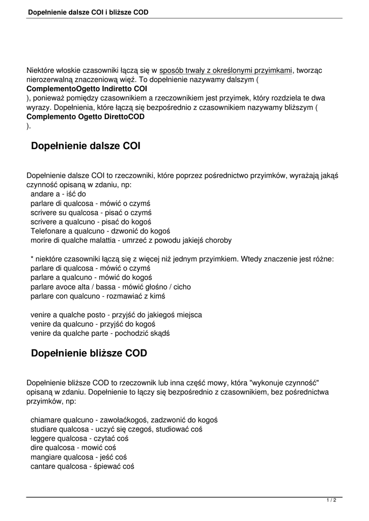 Dopełnienie dalsze COI i bliższe COD Niektóre włoskie czasowniki łączą się w sposób trwały z określonymi przyimkami, tworząc nierozerwalną znaczeniową więź. To dopełnienie nazywamy dalszym ( ComplementoOgetto Indiretto COI ), ponieważ pomiędzy czasownikiem a rzeczownikiem jest przyimek, który rozdziela te dwa wyrazy. Dopełnienia, które łączą się bezpośrednio z czasownikiem nazywamy bliższym ( Complemento Ogetto DirettoCOD ). Dopełnienie dalsze COI Dopełnienie dalsze COI to rzeczowniki, które poprzez pośrednictwo przyimków, wyrażają jakąś czynność opisaną w zdaniu, np: andare a - iść do parlare di qualcosa - mówić o czymś scrivere su qualcosa - pisać o czymś scrivere a qualcuno - pisać do kogoś Telefonare a qualcuno - dzwonić do kogoś morire di qualche malattia - umrzeć z powodu jakiejś choroby * niektóre czasowniki łączą się z więcej niż jednym przyimkiem. Wtedy znaczenie jest różne: parlare di qualcosa - mówić o czymś parlare a qualcuno - mówić do kogoś parlare avoce alta / bassa - mówić głośno / cicho parlare con qualcuno - rozmawiać z kimś venire a qualche posto - przyjść do jakiegoś miejsca venire da qualcuno - przyjść do kogoś venire da qualche parte - pochodzić skądś Dopełnienie bliższe COD Dopełnienie bliższe COD to rzeczownik lub inna część mowy, która "wykonuje czynność" opisaną w zdaniu. Dopełnienie to łączy się bezpośrednio z czasownikiem, bez pośrednictwa przyimków, np: chiamare qualcuno - zawołaćkogoś, zadzwonić do kogoś studiare qualcosa - uczyć się czegoś, studiować coś leggere qualcosa - czytać coś dire qualcosa - mowić coś mangiare qualcosa - jeść coś cantare qualcosa - śpiewać coś 1/2 Dopełnienie dalsze COI i bliższe COD amare qualcuno / qualcosa - kochać kogoś / coś studiare qualcosa - uczyć się / studiować coś template joomla 2/2