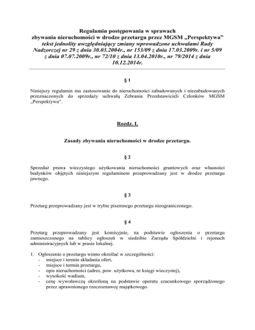 Regulamin postępowania w sprawach zbywania nieruchomości w drodze przetargu przez MGSM „Perspektywa” tekst jednolity uwzględniający zmiany wprowadzone uchwałami Rady Nadzorczej nr 29 z dnia 30.03.2004r., nr 153/09 z dnia 17.03.2009r. i nr 5/09 z dnia 07.07.2009r., nr 72/10 z dnia 13.04.2010r., nr 79/2014 z dnia 10.12.2014r. §1 Niniejszy regulamin ma zastosowanie do nieruchomości zabudowanych i niezabudowanych przeznaczonych do sprzedaży uchwałą Zebrania Przedstawicieli Członków MGSM „Perspektywa”. Rozdz. I. Zasady zbywania nieruchomości w drodze przetargu. §2 Sprzedaż prawa wieczystego użytkowania nieruchomości gruntowych oraz własności budynków objętych niniejszym regulaminem przeprowadzany jest w drodze przetargu jawnego. §3 Przetarg przeprowadzany jest w trybie pisemnego przetargu nieograniczonego. §4 Przetarg przeprowadzany jest komisyjnie, na podstawie ogłoszenia o przetargu zamieszczonego na tablicy ogłoszeń w siedzibie Zarządu Spółdzielni i rejonach administracyjnych lub w prasie lokalnej. 1. Ogłoszenie o przetargu winno określać w szczególności: - miejsce i termin składania ofert, - miejsce i termin przetargu, - opis nieruchomości (adres, pow. użytkowa, nr księgi wieczystej), - wysokość wadium, - cenę wywoławczą określoną na podstawie operatu szacunkowego sporządzonego przez uprawnionego rzeczoznawcę majątkowego. §5 Osoba wygrywająca przetarg zobowiązana jest do wpłacenia zaoferowanej ceny nabycia nieruchomości oraz ponosi koszty sporządzenia aktu notarialnego. §6 Komisja prowadząca przetarg ma obowiązek równego traktowania wszystkich osób biorących udział w przetargu w sposób gwarantujący zachowanie uczciwej konkurencji. §7 1. Oferty na przetarg należy składać w Kancelarii Spółdzielni w zaklejonych kopertach. Kancelaria potwierdza otrzymane oferty, odnotowując datę jej otrzymania, przyjmuje i przekazuje za pośrednictwem Zarządu do Komisji. 2. Składane oferty winny być podpisane osobiście przez oferenta. 3. Pisemna oferta powinna zawierać: - imię, nazwisko, adres oferenta, - datę sporządzenia oferty, - oświadczenie, że oferent zapoznał się z warunkami przetargu i przyjmuje te warunki bez zastrzeżeń, - oferowaną cenę nabycia nieruchomości., - w przypadku, gdy przedmiotem sprzedaży jest nieruchomość zabudowana budynkiem mieszkalnym - oświadczenie, że w razie wygrania przetargu oferent wyraża zgodę na nabycie nieruchomości bez świadectwa charakterystyki energetycznej budynku. §8 Ustalony termin przetargu nie może być krótszy niż 14 dni od daty ukazania się ogłoszenia. §9 Ustalone wadium oferenci są zobowiązani wpłacić: - w kasie Spółdzielni najpóźniej do godz. 1400 dnia poprzedzającego dzień przeprowadzenia przetargu, - na rachunek Spółdzielni podany w ogłoszeniu najpóźniej w dniu poprzedzającym dzień przeprowadzenia przetargu, przy czym za datę wpływu na rachunek Spółdzielni uważa się dzień uznania rachunku bankowego. § 10 1. Spółdzielnia dokonuje zwrotu wadium w przypadku : - zakończenia postępowania przetargowego wszystkim jego uczestnikom z wyjątkiem wygrywającego, - wycofania oferty z przetargu, jeżeli nastąpiło to przed datą jego przeprowadzenia, - odwołania przetargu. 2. Oferent traci wadium w razie nie dokonania wpłaty oferowanej ceny nabycia nieruchomości w terminach określonych w § 151. 3. Kwota wadium zaliczana jest na poczet należnych wpłat wygrywającemu i nie podlega zwrotowi. § 11 1. Oferenci zobowiązani są do zapoznania się z treścią niniejszego Regulaminu i przestrzegania jego postanowień. 2. Treść Regulaminu jest jawna i winna być udostępniona w siedzibie Zarządu Spółdzielni oferentom od daty ukazania się ogłoszenia o przetargu. § 12 1. Przetarg przeprowadzany jest jednoetapowo jako konkurs ofert. 2. Komisja Przetargowa podejmuje następujące czynności: - stwierdza prawidłowość ogłoszenia przetargu, - ustala liczbę złożonych ofert, - dokonuje otwarcia złożonych ofert. 3. Komisja Przetargowa odmawia zakwalifikowania ofert do rozpatrzenia jeżeli: - nie odpowiadają warunkom przetargu, określonym w § 7 ust. 3, - zostały złożone po terminie podanym w ogłoszeniu, - są nieczytelne lub budzą wątpliwości co do ich treści, rzetelności podanych danych, a także zawierają przeróbki lub skreślenia, - nie zostało wpłacone wadium w pełnej wysokości w sposób określony w § 9. 4. Po wywołaniu przetargu prowadzący podaje do wiadomości w obecności przybyłych oferentów: - przedmiot przetargu, - pouczenie o skutkach nie wniesienia zaoferowanej ceny nabycia nieruchomości w terminie, o którym mowa w § 10 ust. 2. 5. Zgłoszenie jednej oferty jest warunkiem wystarczającym do odbycia przetargu. 6. W razie odmowy zakwalifikowania ofert do przetargu należy sporządzić wzmiankę w protokole wraz z podaniem przyczyn. 7. Komisja Przetargowa ma prawo do zamknięcia przetargu bez dokonania wyboru. 8. Komisja Przetargowa podejmuje decyzje w drodze głosowania niejawnego zwykłą większością głosów, przy czym kryterium rozstrzygającym jest wysokość oferowanej ceny nabycia nieruchomości. § 13 Z przeprowadzonego przetargu Komisja sporządza protokół, który powinien zawierać: - oznaczenie miejsca i czasu przeprowadzenia przetargu, - imiona i nazwiska osób prowadzących przetarg, - listę złożonych ofert, - listę ofert nie zakwalifikowanych do przetargu, - określenie oferty wygrywającej przetarg, - wnioski i oświadczenia osób obecnych, - podpisy wszystkich osób wchodzących w skład Komisji oraz osoby wygrywającej przetarg. § 14 1. W razie stwierdzenia, że więcej niż jedna oferta zawiera tę samą ofertę ceny, Komisja przeprowadzi pomiędzy tymi oferentami licytację. 2. W razie stwierdzenia, że więcej niż jedna oferta zawiera cenę podobną Komisja może przeprowadzić licytację. Za ceny podobne uznaje się oferty ceny, których rozbieżność jest mniejs