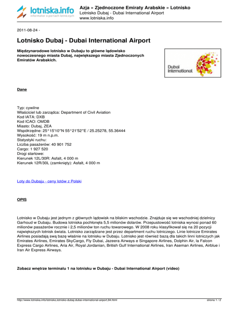 Azja » Zjednoczone Emiraty Arabskie » Lotnisko Lotnisko Dubaj - Dubai International Airport www.lotniska.info 2011-08-24 - Lotnisko Dubaj - Dubai International Airport Międzynarodowe lotnisko w Dubaju to główne lądowisko nowoczesnego miasta Dubaj, największego miasta Zjednoczonych Emiratów Arabskich. Dane Typ: cywilne Właściciel lub zarządca: Department of Civil Aviation Kod IATA: DXB Kod ICAO: OMDB Miasto: Dubaj, ZEA Współrzędne: 25°15'10″N 55°21'52″E / 25.25278, 55.36444 Wysokość: 19 m n.p.m. Statystyki ruchu: Liczba pasażerów: 40 901 752 Cargo: 1 927 520 Drogi startowe: Kierunek 12L/30R: Asfalt, 4 000 m Kierunek 12R/30L (zamknięty): Asfalt, 4 000 m Loty do Dubaju - ceny lotów z Polski OPIS Lotnisko w Dubaju jest jednym z głównych lądowisk na bliskim wschodzie. Znajduje się we wschodniej dzielnicy Garhoud w Dubaju. Budowa lotniska pochłonęła 5,5 milionów dolarów. Przepustowość lotniska wynosi ponad 60 milionów pasażerów rocznie i 2,5 milionów ton ruchu towarowego. W 2008 roku klasyfikował się na 20 pozycji największych lotnisk świata. Lotnisko zarządzane jest przez department ruchu lotniczego. Linie lotnicze Emirates Airlines posiadają swą bazę właśnie na lotnisku w Dubaju. Lotnisko jest również bazą dla takich linni lotniczych jak Emirates Airlines, Emirates SkyCargo, Fly Dubai, Jazeera Airways e Singapore Airlines, Dolphin Air, la Falcon Express Cargo Airlines, Aria Air, Royal Jordanian, British Gulf International Airlines, Iran Aseman Airlines, Airblue i Iran Air Express Airways. Zobacz wnętrze terminalu 1 na lotnisku w Dubaju - Dubai International Airport (video) http://www.lotniska.info/lotnisko,lotnisko-dubaj-dubai-international-airport,94.html strona 1 / 2 Azja » Zjednoczone Emiraty Arabskie » Lotnisko Lotnisko Dubaj - Dubai International Airport www.lotniska.info W marcu 2009 roku na lotnisku zanotowano prawie 4900 lotów tygodniowo wykonanych przez 125 linii lotniczcyh z ponad 200 destynacjami do Ameryki Północnej, Europy, Ameryki Południowej, Azji I Afryki. W 2009 roku przez port lotniczy w Dubaju przewinęło się ponad 40 milionów pasażerów. Lotnisko aktualnie posiada 3 terminale. Do 2017 roku ma odbyć się rozbudow lotniska która będzie kosztowała ponad 30 miliardów dolarów. Lotnisko Dubaj po rozbudowie ma być największym portem lotniczym świata z przepustowością sięgającą 160 milionów pasażerów rocznie. Nocne lądowanie samolotu na lotnisku w Dubaju (video) DOJAZD Autobusy Lotnisko w Dubaju położone jest 4 kilometry od centrum miasta. Z terminali 1 i 2 odjeżdżają autobusy numer 4, 11, 15, 33 i 44. Połączenia wewnątrz lotniska Między terminalem 1, 2 i 3 24 godziny na dobę kursują busy. Wypożyczalnia samochodów na lotnisku w Dubaju http://www.dubaiairport.com/en/passengers/airportguide/Pages/Carrental.aspx http://www.lotniska.info/lotnisko,lotnisko-dubaj-dubai-international-airport,94.html http://www.lotniska.info/lotnisko,lotnisko-dubaj-dubai-international-airport,94.html Powered by TCPDF (www.tcpdf.org) strona 2 / 2