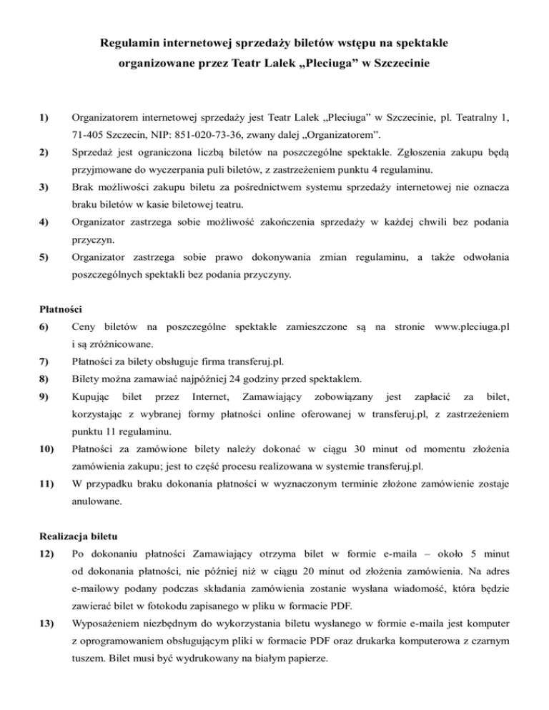 Regulamin internetowej sprzedaży biletów wstępu na spektakle organizowane przez Teatr Lalek „Pleciuga” w Szczecinie 1) Organizatorem internetowej sprzedaży jest Teatr Lalek „Pleciuga” w Szczecinie, pl. Teatralny 1, 71-405 Szczecin, NIP: 851-020-73-36, zwany dalej „Organizatorem”. 2) Sprzedaż jest ograniczona liczbą biletów na poszczególne spektakle. Zgłoszenia zakupu będą przyjmowane do wyczerpania puli biletów, z zastrzeżeniem punktu 4 regulaminu. 3) Brak możliwości zakupu biletu za pośrednictwem systemu sprzedaży internetowej nie oznacza braku biletów w kasie biletowej teatru. 4) Organizator zastrzega sobie możliwość zakończenia sprzedaży w każdej chwili bez podania przyczyn. 5) Organizator zastrzega sobie prawo dokonywania zmian regulaminu, a także odwołania poszczególnych spektakli bez podania przyczyny. Płatności 6) Ceny biletów na poszczególne spektakle zamieszczone są na stronie www.pleciuga.pl i są zróżnicowane. 7) Płatności za bilety obsługuje firma transferuj.pl. 8) Bilety można zamawiać najpóźniej 24 godziny przed spektaklem. 9) Kupując bilet przez Internet, Zamawiający zobowiązany jest zapłacić za bilet, korzystając z wybranej formy płatności online oferowanej w transferuj.pl, z zastrzeżeniem punktu 11 regulaminu. 10) Płatności za zamówione bilety należy dokonać w ciągu 30 minut od momentu złożenia zamówienia zakupu; jest to część procesu realizowana w systemie transferuj.pl. 11) W przypadku braku dokonania płatności w wyznaczonym terminie złożone zamówienie zostaje anulowane. Realizacja biletu 12) Po dokonaniu płatności Zamawiający otrzyma bilet w formie e-maila – około 5 minut od dokonania płatności, nie później niż w ciągu 20 minut od złożenia zamówienia. Na adres e-mailowy podany podczas składania zamówienia zostanie wysłana wiadomość, która będzie zawierać bilet w fotokodu zapisanego w pliku w formacie PDF. 13) Wyposażeniem niezbędnym do wykorzystania biletu wysłanego w formie e-maila jest komputer z oprogramowaniem obsługującym pliki w formacie PDF oraz drukarka komputerowa z czarnym tuszem. Bilet musi być wydrukowany na białym papierze. 14) Realizacja biletu następuje poprzez okazanie bileterowi wydruku zawierającego fotokod w rozmiarze nie mniejszym niż 2x2 cm. Odbiór biletów w kasie 15) Widz, który z jakichkolwiek przyczyn nie jest w stanie przedstawić biletu w sposób wskazany w punkcie 13 regulaminu, ma możliwość odbioru biletu w kasie teatru. 16) Odbiór biletów w kasie biletowej teatru jest możliwy od wtorku do piątku w godzinach 8.30–15.30 oraz w dniu spektaklu na 30 minut przed jego rozpoczęciem. 17) Przy odbiorze Klient jest zobowiązany podać numer rezerwacji oraz okazać dowód tożsamości osoby rezerwującej, a w przypadku biletu ulgowego – dokument upoważniający do zniżki. Zwroty 18) Bilety zakupione przez Internet nie podlegają zwrotowi. 19) W przypadku odwołania spektaklu lub innych zdarzeń losowych informacje na temat dokonywania zwrotu biletów będą udzielane w Biurze Obsługi Widzów, tel. +48 (91) 433 58 04, lub mailowo:[email protected]. Dane osobowe 20) Administratorem danych osobowych jest Teatr Lalek „Pleciuga”. 21) Dane osobowe Kupującego nie będą przekazywane innym stronom bez jego wiedzy i zgody. Dokonanie wpłaty na rachunek bankowy Teatru oznacza zapoznanie się z powyższym regulaminem i akceptację jego treści oraz zgodę na przekazanie swoich danych osobowych Teatrowi. 22) Każdemu przysługuje prawo do wglądu do swoich danych osobowych oraz do ich poprawiania.