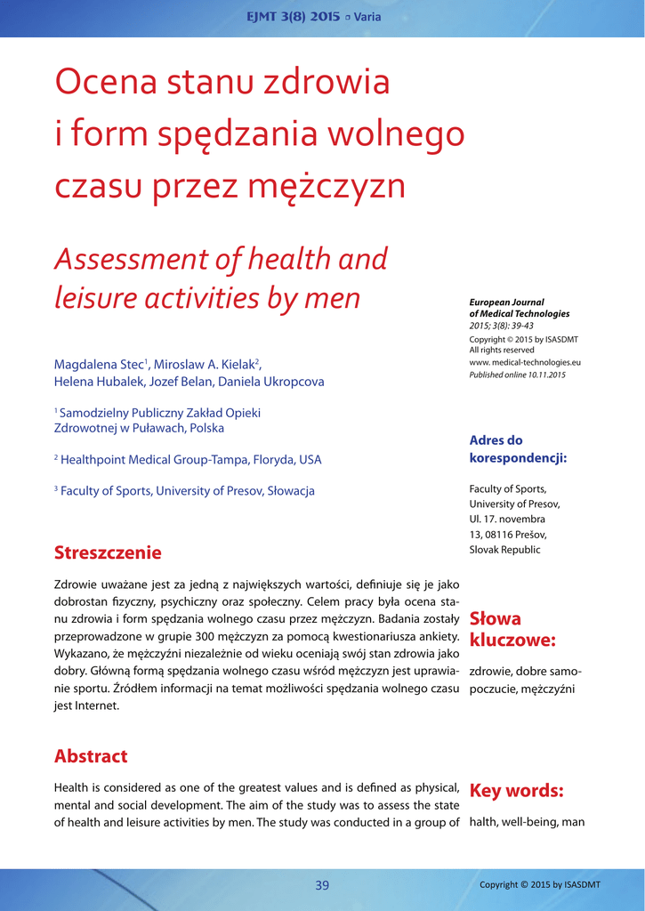 EJMT 3(8) 2015 • Varia Ocena stanu zdrowia i form spędzania wolnego czasu przez mężczyzn Assessment of health and leisure activities by men Magdalena Stec1, Miroslaw A. Kielak2, Helena Hubalek, Jozef Belan, Daniela Ukropcova Samodzielny Publiczny Zakład Opieki Zdrowotnej w Puławach, Polska European Journal of Medical Technologies 2015; 3(8): 39-43 Copyright © 2015 by ISASDMT All rights reserved www. medical-technologies.eu Published online 10.11.2015 1 2 Healthpoint Medical Group-Tampa, Floryda, USA 3 Faculty of Sports, University of Presov, Słowacja Adres do korespondencji: Faculty of Sports, University of Presov, Ul. 17. novembra 13, 08116 Prešov, Slovak Republic Streszczenie Zdrowie uważane jest za jedną z największych wartości, definiuje się je jako dobrostan fizyczny, psychiczny oraz społeczny. Celem pracy była ocena stanu zdrowia i form spędzania wolnego czasu przez mężczyzn. Badania zostały Słowa przeprowadzone w grupie 300 mężczyzn za pomocą kwestionariusza ankiety. kluczowe: Wykazano, że mężczyźni niezależnie od wieku oceniają swój stan zdrowia jako dobry. Główną formą spędzania wolnego czasu wśród mężczyzn jest uprawia- zdrowie, dobre samonie sportu. Źródłem informacji na temat możliwości spędzania wolnego czasu poczucie, mężczyźni jest Internet. Abstract Health is considered as one of the greatest values and is defined as physical, Key words: mental and social development. The aim of the study was to assess the state of health and leisure activities by men. The study was conducted in a group of halth, well-being, man 39 Copyright © 2015 by ISASDMT EJMT 3(8) 2015 • Varia 300 men using a questionnaire. It has been shown that men regardless of age assess their health as good. The main pastime among men is sport. The source of information about leisure opportunities is the Internet. Wstęp Zdrowie uważane jest za jedną z największych wartości, definiuje się je jako dobrostan fizyczny, psychiczny oraz społeczny. Zdrowie rozumieć można również jako proces, w którym możliwe staje się osiągniecie pełni swoich możliwości przy adekwatnym reagowaniu na codzienne wyzwania [6]. W literaturze przedmiotu termin zachowań zdrowotnych w zależności od dziedziny naukowej ma różny charakter [1]. Woynarowska [8], skupiając się na sferze zdrowia, opisuje zachowania zdrowotne jako działania, „które w świetle współczesnej wiedzy medycznej wywołują określone pozytywne bądź negatywne skutki zdrowotne osób, które je realizują” [8]. Według Puchalskiego, zachowania zdrowotne są to „zachowania analizowane z punktu widzenia ich znaczenia dla zdrowia” [1]. Natomiast Frączek oraz Stępień definiują to pojęcie w aspekcie społeczno-kulturowym. Według nich zachowania zdrowotne to różnorodne czynności dokonywane w sposób pośredni lub bezpośredni przez społeczeństwo, które wpływają na fizyczną lub psychiczną płaszczyznę zdrowia w sposób pozytywny lub negatywny. Wszelkie działania dotyczące zachowań zdrowotnych polegają na dokonywaniu określonych wyborów obejmujących własne zdrowie, jak i zdrowia innych osób. Biorąc pod uwagę ustalenia dotyczące związków między zdrowiem a zachowaniem oraz zasady konstruowania pojęcia „zachowania zdrowotne”, a także istniejącą już wiedzę o rodzajach zachowań zdrowotnych można ustalić kilka podstawowych kryteriów klasyfikacji zachowań zdrowotnych [7]. Według Wardla J. i Steptoe’a A. wyróżnia się pięć klas zachowań prozdrowotnych: 1. Unikanie używek (alkohol, narkotyki, papierosy). 2. Bezpieczne prowadzenie samochodu, czyli używanie pasów bezpieczeństwa (także na tylnych siedzeniach), jazda z mniejszą szybkością. 3. Zwyczaje żywieniowe, czyli jedzenie większej ilości warzyw i owoców, zmniejszenie ilości zjadanych tłuszczów zawierających cholesterol. 4. Pozytywne praktyki zdrowotne, ćwiczenia fizyczne, mycie zębów, odpowiednia higiena otoczenia i samego siebie. 5. Zachowania związane z działalnością prewencyjną, regularne wizyty kontrolne u lekarzy pierwszego kontaktu i stomatologów, samokontrole. Biorąc pod uwagę cel zachowań prozdrowotnych, wymienić można takie, które są ukierunkowane na ochronę zdrowia, zapobieganie chorobom, na poprawę, doskonalenie kondycji psychofizycznej, zwiększenie potencjału własnego zdrowia, jego rozwój oraz ratowanie zdrowia, jego odzyskanie w przypadku wystąpienia zaburzeń i chorób [3]. Warto wspomnieć o podziale zachowań zdrowotnych, kierując się dwoma kryteriami, takimi jak: stan zdrowia i ich wpływ na zdrowie [2]. Zachowania zdrowotne można podzielić ze względu na stan zdrowia: • zachowania zdrowotne w zdrowiu, tj. przez które rozumie się działania podejmowane przez osoby zdrowe, mające na celu wzmocnienie zdrowia oraz zapobieganie chorobie i niepełnosprawności; • zachowania zdrowotne w doświadczeniu choroby, tj. wynikają one ze świadomości istniejących zaburzeń w prawidłowym stanie zdrowia oraz mogące przebiegać bezobjawowo bądź dawać niepokojące dolegliwości; • zachowania zdrowotne w roli chorego, tj. są to zachowania podejmowane przez człowieka chorego w celu eliminacji występujących objawów choroby. Zarówno zakres, jak i charakter podejmowanych działań w głównej mierze zależy od typu objawów, jak także od rodzaju jednostki chorobowej. 40 Copyright © 2015 by ISASDMT EJMT 3(8) 2015 • Varia Celem pracy była ocena stanu zdrowia i form spędzania wolnego czasu przez mężczyzn. Materiał i metoda Badania zostały przeprowadzone w grupie 300 mężczyzn w Akademickim Centrum Fizjoterapii NZOZ w Lublinie z wykorzystaniem ankiety własnego autorstwa. Wśród ankietowanych największy odsetek badanych (40,3%) znajdował się w wieku 20-35 lat, o 6% mniej stanowiły osoby mieszczące się w przedziale 36-50 lat, 25,3% ankietowanych mężczyzn było powyżej 50 lat. Wyniki badań W tabeli 1 przedstawiono współza