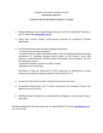 Procedura rekrutacji na studia w ramach podwójnego dyplomu z Ecole des Mines de Nantes (Nantes, Francja) 1. Wstępne deklaracje należy wysyłać drogą mailową w terminie do 26.01.2014. Przyjmuje je mgr inż. Paweł Gajda ([email protected]). 2. Osoby, które wyraziły wstępne zainteresowanie otrzymają do wypełnienia formularz zgłoszeniowy. 3. Do 29.01.2014 (środa) należy przesłać następujące dokumenty: - List motywacyjny (w języku angielskim), - Certyfikat znajomości języka angielskiego. Osoby , które nie posiadają certyfikatu przysyłają oświadczenie nt. ostatniego zdanego poziomu języka na AGH (poziom, ocena, data egzaminu). Udokumentowana znajomość języka francuskiego nie jest wymagana, ale może być dodatkowym atutem. - Suplement do dyplomu ukończenia studiów I stopnia, - Egzemplarz pracy inżynierskiej. Dokumenty te mogą być dostarczone w formie papierowej lub elektronicznej na adres mailowy jak w przypadku wstępnego zgłoszenia lub do pokoju D4, 113. 4. Do dnia 31.01.2014 należy wypełnić i wysłać otrzymany od nas formularz. 5. Na podstawie dokumentów z pkt. 3 zostanie sporządzona lista rankingowa. Zostanie ona ogłoszona w dniu 31.01.2014. 6. Kwalifikacja będzie odbywać się na podstawie listy rankingowej w miarę wolnych miejsc i stypendiów. Wszelkich dodatkowych informacji udziela mgr inż. Paweł Gajda (D4, 113 email: [email protected], tel: 12 617 51 89)