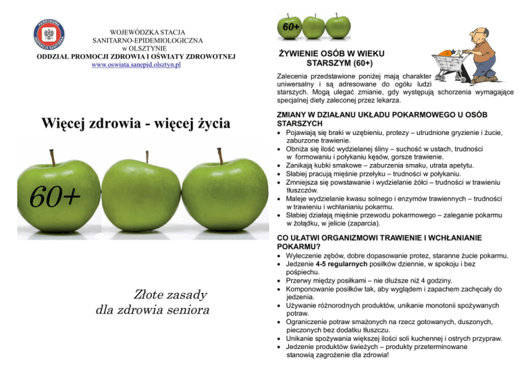 WOJEWÓDZKA STACJA SANITARNO-EPIDEMIOLOGICZNA w OLSZTYNIE ODDZIAŁ PROMOCJI ZDROWIA I OŚWIATY ZDROWOTNEJ www.oswiata.sanepid.olsztyn.pl ŻYWIENIE OSÓB W WIEKU STARSZYM (60+) Zalecenia przedstawione poniżej mają charakter uniwersalny i są adresowane do ogółu ludzi starszych. Mogą ulegać zmianie, gdy występują schorzenia wymagające specjalnej diety zaleconej przez lekarza. Więcej zdrowia - więcej życia 60+ ZMIANY W DZIAŁANU UKŁADU POKARMOWEGO U OSÓB STARSZYCH Pojawiają się braki w uzębieniu, protezy – utrudnione gryzienie i żucie, zaburzone trawienie. Obniża się ilość wydzielanej śliny – suchość w ustach, trudności w formowaniu i połykaniu kęsów, gorsze trawienie. Zanikają kubki smakowe – zaburzenia smaku, utrata apetytu. Słabiej pracują mięśnie przełyku – trudności w połykaniu. Zmniejsza się powstawanie i wydzielanie żółci – trudności w trawieniu tłuszczów. Maleje wydzielanie kwasu solnego i enzymów trawiennych – trudności w trawieniu i wchłanianiu pokarmu. Słabiej działają mięśnie przewodu pokarmowego – zaleganie pokarmu w żołądku, w jelicie (zaparcia). CO UŁATWI ORGANIZMOWI TRAWIENIE I WCHŁANIANIE POKARMU? Złote zasady dla zdrowia seniora Wyleczenie zębów, dobre dopasowanie protez, staranne żucie pokarmu. Jedzenie 4-5 regularnych posiłków dziennie, w spokoju i bez pośpiechu. Przerwy między posiłkami – nie dłuższe niż 4 godziny. Komponowanie posiłków tak, aby wyglądem i zapachem zachęcały do jedzenia. Używanie różnorodnych produktów, unikanie monotonii spożywanych potraw. Ograniczenie potraw smażonych na rzecz gotowanych, duszonych, pieczonych bez dodatku tłuszczu. Unikanie spożywania większej ilości soli kuchennej i ostrych przypraw. Jedzenie produktów świeżych – produkty przeterminowane stanowią zagrożenie dla zdrowia! DBAJ O WŁAŚCIWĄ KALORYCZNOŚĆ SWOJEJ DIETY! Ludzie starsi mają mniejsze zapotrzebowanie na energię (kilokalorie) z powodu: obniżenia poziomu aktywności fizycznej obniżenia podstawowej przemiany materii organizmu. Podstawowa przemiana materii jest zależna od beztłuszczowej masy ciała – głównie masy mięśni – a ta maleje w starszym wieku. Zwiększa się natomiast ilość tłuszczu ustrojowego – do około 36%. CO JEŚĆ I ILE? Prawidłowe żywienie opóźnia procesy starzenia się organizmu i łagodzi dolegliwości związane z niektórymi chorobami. Pojęcie „porcja” ma ułatwić stosowanie zaleceń piramidy żywienia. Umownie można przyjąć, że „nasza własna porcja” to taka ilość produktu żywnościowego, jaka mieści się w naszej garści. PAMIĘTAJ O WODZIE! Z wiekiem zmniejsza się zawartość wody w organizmie. Starsze osoby mają zmniejszone odczuwanie pragnienia, często obawiają się przyjmowania płynów z powodu zaburzeń w pracy układu moczowego – w związku z tym są bardziej narażone na odwodnienie organizmu. Objawy odwodnienia organizmu uczucie osłabienia bóle i zawroty głowy skurcze i bóle mięśni zaburzenia widzenia zaburzenia mowy suchość w ustach zaburzenia funkcji poznawczych zaburzenia pracy serca przyspieszony oddech zaburzenia wydalania moczu zmiany ciśnienia krwi nudności spadek masy ciała zaparcia osłabienie odporności organizmu Ludzie w starszym wieku powinni szczególnie dbać o codzienne spożywanie właściwej ilości płynów – nawet wtedy, kiedy nie odczuwają pragnienia. Należy popijać dość często, małymi łyczkami. Należy wypić 1,5-2 litry niegazowanych płynów dziennie w postaci, np. wody, słabej herbaty, herbatek owocowych, kawy zbożowej, soków warzywnych, soków owocowych. PRODUKTY ZBOŻOWE Zaleca się spożywanie co najmniej 6 porcji produktów zbożowych dziennie: pieczywo (najlepiej z pełnego przemiału), kasze, ryż, makarony, płatki zbożowe, mąki. Są źródłem węglowodanów złożonych (skrobia), które powinny pokrywać 50-60% dziennego zapotrzebowania na energię. Są także źródłem błonnika, który reguluje pracę jelit i zapobiega zaparciom. Co to jest jedna porcja? Przykłady: 1 kromka chleba (50 g) ½ szklanki gotowanego ryżu lub kaszy ½ szklanki gotowanej owsianki 1 szklanka gotowanego makaronu/klusek 1/3 szklanki musli WARZYWA I OWOCE W codziennym jadłospisie powinny się znaleźć 3 porcje warzyw i 2 porcje owoców – najlepiej surowe lub krótko gotowane. Są źródłem witamin, składników mineralnych i błonnika. Co to jest jedna porcja? Przykłady: 1 średniej wielkości warzywo – pomidor, papryka, ogórek, burak itp. mała miseczka sałatki lub surówki 1 owoc średniej wielkości – jabłko, pomarańcza, banan, gruszka itp. 10 truskawek, 1 szklanka malin MLEKO I PRODUKTY MLECZNE Mleko i produkty mleczne – maślanka, kefir, jogurt, chude sery – dostarczają białka, ale także są bogatym źródłem wapnia. Zaleca się spożywać 3 porcje produktów mlecznych dziennie. Co to jest jedna porcja? Przykłady: 1 szklanka mleka, kefiru lub jogurtu 2 plastry sera żółtego gruby plaster twarogu serek homogenizowany (ok.150 g) Z wiekiem zmniejsza się w organizmie ilość laktazy – enzymu odpowiedzialnego za trawienie cukru mlecznego (laktozy). Jeśli więc słodkie mleko powoduje wzdęcia i bóle brzucha, pij fermentowane napoje mleczne – kefir, jogurt, maślankę, mleko acidofilne. Nie wywołują dolegliwości i poprawiają mikroflorę jelita grubego. Zapotrzebowanie na wapń w starszym wieku wyraźnie wzrasta. Normy żywienia zalecają zwiększenie spożycia tego składnika już po 50 roku życia. Wynika to ze zmniejszenia wchłaniania i przyswajalności wapnia oraz z faktu, że jego niedobór powoduje ubytek masy kostnej, postępujący w miarę starzenia się organizmu. MIĘSO I RYBY Produkty mięsne i ryby są źródłem białka oraz tłuszczu. Powinny być spożywane 2 porcje dziennie. Zalecane są chude wędliny i mięso (drób, wołowina, cielęcina) oraz ryby morskie (np. dorsz, łosoś, tuńczyk, śledź). Co to jest 