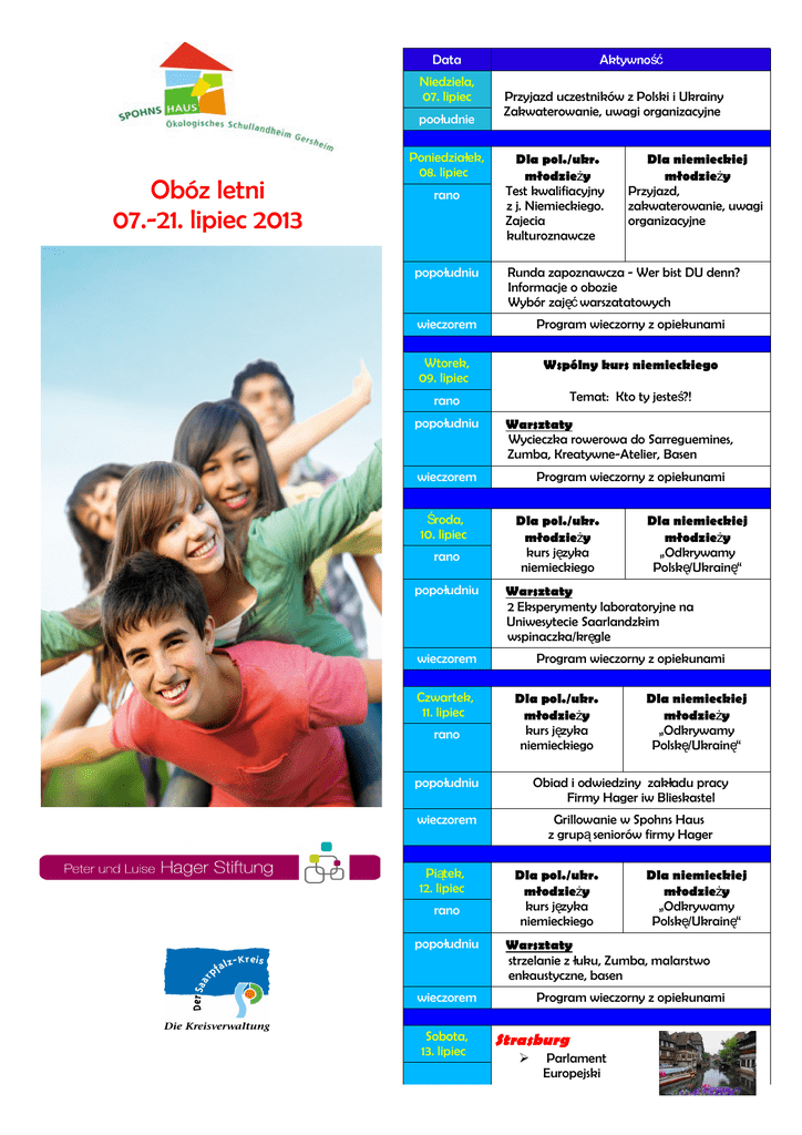 Data Niedziela, 07. lipiec poołudnie Obóz letni 07.-21. lipiec 2013 Poniedziałek, 08. lipiec rano popołudniu Aktywność Przyjazd uczestników z Polski i Ukrainy Zakwaterowanie, uwagi organizacyjne Dla pol./ukr. młodzieży Test kwalifiacyjny z j. Niemieckiego. Zajecia kulturoznawcze Dla niemieckiej młodzieży Przyjazd, zakwaterowanie, uwagi organizacyjne Runda zapoznawcza - Wer bist DU denn? Informacje o obozie Wybór zajęć warszatatowych wieczorem Program wieczorny z opiekunami Wtorek, 09. lipiec Wspólny kurs niemieckiego rano Temat: Kto ty jesteś?! popołudniu Warsztaty Wycieczka rowerowa do Sarreguemines, Zumba, Kreatywne-Atelier, Basen wieczorem Środa, 10. lipiec rano popołudniu Program wieczorny z opiekunami Dla pol./ukr. młodzieży kurs języka niemieckiego Warsztaty 2 Eksperymenty laboratoryjne na Uniwesytecie Saarlandzkim wspinaczka/kręgle wieczorem Czwartek, 11. lipiec rano Dla niemieckiej młodzieży „Odkrywamy Polskę/Ukrainę“ Program wieczorny z opiekunami Dla pol./ukr. młodzieży kurs języka niemieckiego Dla niemieckiej młodzieży „Odkrywamy Polskę/Ukrainę“ popołudniu Obiad i odwiedziny zakładu pracy Firmy Hager iw Blieskastel wieczorem Grillowanie w Spohns Haus z grupą seniorów firmy Hager Piątek, 12. lipiec rano popołudniu Dla pol./ukr. młodzieży kurs języka niemieckiego Warsztaty strzelanie z łuku, Zumba, malarstwo enkaustyczne, basen wieczorem Sobota, 13. lipiec Dla niemieckiej młodzieży „Odkrywamy Polskę/Ukrainę“ Program wieczorny z opiekunami Strasburg ➢ Parlament Europejski całodniowa ➢ ➢ ➢ rejs statkiem zwiedzanie miasta czas wolny, zakupy wieczorem Program wieczorny z opiekunami Data Aktywność Niedziela, 14. lipiec rano Msza święta w kościele Sankt Alban, Gersheim lub czas wolny/zajęcia z opiekunami popołudniu czas wolny/zajęcia z opiekunami wieczorem Program wieczorny z opiekunami Poniedziałek, 15. lipiec rano popołudniu Dla pol./ukr. młodzieży kurs języka niemieckiego Wtorek, 16. lipiec rano popołudniu Program wieczorny z opiekunami Dla pol./ukr. młodzieży kurs języka niemieckiego Dla niemieckiej młodzieży „Odkrywamy Polskę/Ukrainę“ 2. Część: Hip Hop/Rap i R&B warsztat z Produkcją CD – Rapschool NRW wieczorem Program wieczorny z opiekunami Środa, 17. lipiec Wspólne zajęcia z języka niemieckiego rano Temat: Paryż Przygotowania projektu do prezentacji popołudniu Warsztaty Produkcja klipu muzycznego z Rapschool NRW wieczorem Program wieczorny z opiekunami Czwartek, 18. lipiec PARIS ➢ zwiedzanie miasta autobusem Open Tour ➢ zwiedzanie Paryża całodniowa korzystając z metra Piatek, 19. lipiec rano ➢ ➢ ➢ Feedbackrunde ➢ Prezentacje multimedialne Wręczenie świadectw ukończenia kursu językowego Oficjalne pożegnanie popołudniu Czas wolny Przygotowania do imprezy pożegnalnej wieczorem Polsko-Niemiecko-Ukraińska impreza pożegnalna Sobota, 20. lipiec Śniadanie Odjazd niemieckich uczestników rano Saarbrücken zwiedzanie miasta, zakupy abends Program wieczorny z opiekunami Niedziela, 21. lipiec Przygotowania do odjazdu rano popołudniu Odjazd uczetników z Polski i Ukrainy Z zastrzeżeniem wprowadzenia zmian. Dla niemieckiej młodzieży Polen/Ukraine entdecken Warsztaty jazda na rolkach, 1. Część: Hip Hop/Rap i R&B warsztat z Produkcją CD – Rapschool NRW wieczorem popołudniu Pracownicy Spohns Haus życzą przyjemnego pobytu! Ökologisches Schullandheim Spohns Haus Dekan-Schindler-Str. 13-14 D-66453 Gersheim Tel. +49 (0) 6843/58999-0 Fax: +49 (0) 6843/58999-9 E-Mail: [email protected] Homepage: www.spohnshaus.de Dyrektor: Hans Bollinger Tel.: +49 (0) 6843/58 999-13 E-Mail: [email protected] Asystentka: Marie-Christine Dussart Tel.: +49 (0) 6843/58 999-0 E-Mail: [email protected] Pedagog, opiekun: Jerzy Wegrzynowski Tel.: +49 (0) 6843/58 999-11 E-Mail: [email protected]