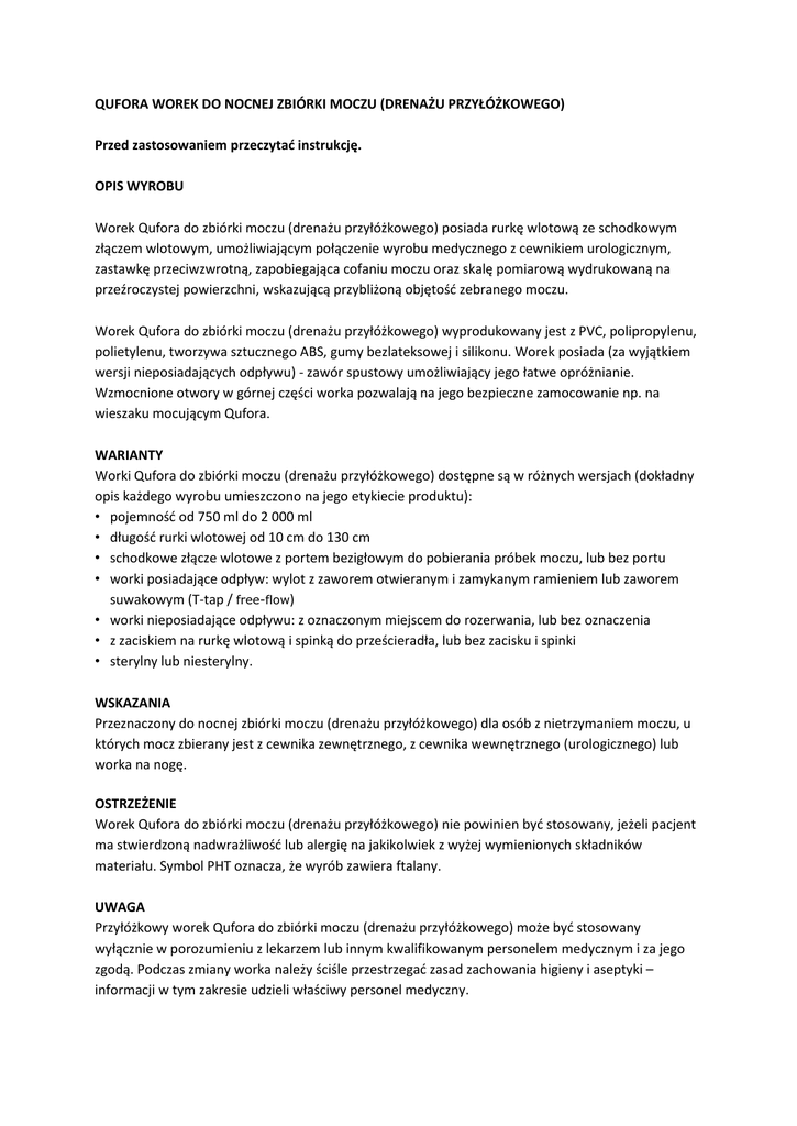 QUFORA WOREK DO NOCNEJ ZBIÓRKI MOCZU (DRENAŻU PRZYŁÓŻKOWEGO) Przed zastosowaniem przeczytad instrukcję. OPIS WYROBU Worek Qufora do zbiórki moczu (drenażu przyłóżkowego) posiada rurkę wlotową ze schodkowym złączem wlotowym, umożliwiającym połączenie wyrobu medycznego z cewnikiem urologicznym, zastawkę przeciwzwrotną, zapobiegająca cofaniu moczu oraz skalę pomiarową wydrukowaną na przeźroczystej powierzchni, wskazującą przybliżoną objętośd zebranego moczu. Worek Qufora do zbiórki moczu (drenażu przyłóżkowego) wyprodukowany jest z PVC, polipropylenu, polietylenu, tworzywa sztucznego ABS, gumy bezlateksowej i silikonu. Worek posiada (za wyjątkiem wersji nieposiadających odpływu) - zawór spustowy umożliwiający jego łatwe opróżnianie. Wzmocnione otwory w górnej części worka pozwalają na jego bezpieczne zamocowanie np. na wieszaku mocującym Qufora. WARIANTY Worki Qufora do zbiórki moczu (drenażu przyłóżkowego) dostępne są w różnych wersjach (dokładny opis każdego wyrobu umieszczono na jego etykiecie produktu): • pojemnośd od 750 ml do 2 000 ml • długośd rurki wlotowej od 10 cm do 130 cm • schodkowe złącze wlotowe z portem bezigłowym do pobierania próbek moczu, lub bez portu • worki posiadające odpływ: wylot z zaworem otwieranym i zamykanym ramieniem lub zaworem suwakowym (T-tap / free-flow) • worki nieposiadające odpływu: z oznaczonym miejscem do rozerwania, lub bez oznaczenia • z zaciskiem na rurkę wlotową i spinką do prześcieradła, lub bez zacisku i spinki • sterylny lub niesterylny. WSKAZANIA Przeznaczony do nocnej zbiórki moczu (drenażu przyłóżkowego) dla osób z nietrzymaniem moczu, u których mocz zbierany jest z cewnika zewnętrznego, z cewnika wewnętrznego (urologicznego) lub worka na nogę. OSTRZEŻENIE Worek Qufora do zbiórki moczu (drenażu przyłóżkowego) nie powinien byd stosowany, jeżeli pacjent ma stwierdzoną nadwrażliwośd lub alergię na jakikolwiek z wyżej wymienionych składników materiału. Symbol PHT oznacza, że wyrób zawiera ftalany. UWAGA Przyłóżkowy worek Qufora do zbiórki moczu (drenażu przyłóżkowego) może byd stosowany wyłącznie w porozumieniu z lekarzem lub innym kwalifikowanym personelem medycznym i za jego zgodą. Podczas zmiany worka należy ściśle przestrzegad zasad zachowania higieny i aseptyki – informacji w tym zakresie udzieli właściwy personel medyczny. INSTRUKCJA UŻYWANIA 1. Przed przystąpieniem do użytkowania produktu umyd ręce oraz upewnid się, że wszystkie powierzchnie robocze są czyste i suche (zaleca się używanie rękawic). Sposób przygotowania worka do użycia zależy od sytuacji i lokalnych przepisów dotyczących zachowania higieny. 2. Do zamocowania worka Quora do zbiórki moczu (drenażu przyłóżkowego) na wieszaku mocującym, należy używad wzmocnionych otworów znajdujących się w górnej części worka. Worek Qufora do zbiórki moczu (drenażu przyłóżkowego) musi zawsze wisied swobodnie ponad poziomem podłogi i bez kontaktu z nią, a poniżej poziomu pęcherza moczowego pacjenta. 3. Zdjąd nakładkę ochronną ze schodkowego złącza wlotowego i włożyd jego stożkową koocówkę do wylotu cewnika urologicznego lub worka do zbiórki moczu przymocowanego do nogi. Unikad dotykania koocówki cewnika lub powierzchni schodkowego złącza wchodzącego w cewnik. 4. Upewnid się, że rurka jest usytuowana w taki sposób, że się nie załamuje. 5. Obsługa zaworu spustowego w workach posiadających odpływ: a. Zawór z ramieniem: kiedy ramię skierowane jest do góry, worek jest zamknięty. W celu opróżnienia worka przekręcid ramię zaworu w dół. b. Zawór suwakowy (T-tap / free-flow): Kieszeo, w której znajduje się wylot jest przezroczysta i łatwo zobaczyd, czy zawór jest otwarty, czy zamknięty. W celu opróżnienia worka należy przesunąd suwak w drugim kierunku kieszeni. Po opróżnieniu starannie zamknąd worek. 6. Opróżnianie worków nieposiadających odpływu (łatwiejsze, jeżeli worek nie jest przepełniony): a. Worki z oznaczonym miejscem do rozerwania: zrobid otwór w worku, chwytając go palcami po obu stronach oznaczenia, i rozrywając w przeciwnych kierunkach. b. Worki bez oznaczonego miejsca na rozerwanie: wyrzucid pełny worek w miejscu do tego przeznaczonym lub odciąd nożyczkami jeden z górnych narożników worka. 7. Nie należy przepełniad worka. Należy opróżnid worek zanim mocz wejdzie w kontakt z zastawką przeciwzwrotną. 8. Podczas zbiórki moczu (drenażu przyłóżkowego) worek Qufora może byd połączony z workiem Qufora na nogę. Rurkę wylotową worka na nogę można połączyd ze złączem worka przyłóżkowego, bez konieczności zdejmowania worka na nogę. Zmniejsza to ryzyko powstania zakażenia. 9. Jeżeli pacjent użytkujący worek do nocnej zbiórki moczu (drenażu przyłóżkowego) chce wstad z łóżka, ze względów bezpieczeostwa zaleca się stosowanie paska Qufora przeznaczonego do noszenia zawieszonego worka. Przyłóżkowy worek Qufora do zbiórki moczu (drenażu przyłóżkowego) z portem do pobierania próbek Port do pobierania próbek, umiejscowiony w złączu wlotowym, umożliwia bezigłowe pobieranie próbek moczu przy pomocy standardowej strzykawki. Przed pobraniem próbki należy zdezynfekowad miejsce, z którego mocz jest pobierany, oraz upewnid się, że lokalnie obowiązujące procedury zachowania zasad higieny i aseptyki zostały zastosowane. STERYLIZACJA (W PRZYPADKU WORKÓW STERYLNYCH) Wyroby sterylne są sterylizowane gazem ETO. Przed użyciem produktu należy upewnid się, czy opakowanie nie jest otwarte i/lub uszkodzone i czy termin ważności nie upłynął. W takim przypadku wyrób nie powinien byd używany. Worek Qufora do zbiórki moczu (drenażu przyłóżkowego) nie powinien byd ponownie sterylizowany. OSTRZEŻENIE Jeżeli wyrób, lub jego częśd, jest ponownie używany lub sterylizowany, istnieje wysokie ryzyko zaistnienia dzia