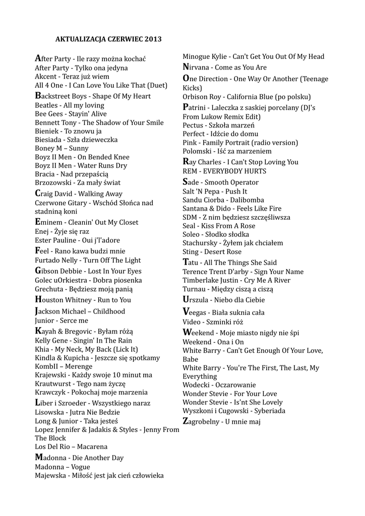 AKTUALIZACJA CZERWIEC 2013 After Party - Ile razy można kochać After Party - Tylko ona jedyna Akcent - Teraz już wiem All 4 One - I Can Love You Like That (Duet) Backstreet Boys - Shape Of My Heart Beatles - All my loving Bee Gees - Stayin' Alive Bennett Tony - The Shadow of Your Smile Bieniek - To znowu ja Biesiada - Szła dzieweczka Boney M – Sunny Boyz II Men - On Bended Knee Boyz II Men - Water Runs Dry Bracia - Nad przepaścią Brzozowski - Za mały świat Craig David - Walking Away Czerwone Gitary - Wschód Słońca nad stadniną koni Eminem - Cleanin' Out My Closet Enej - Żyje się raz Ester Pauline - Oui j'l'adore Feel - Rano kawa budzi mnie Furtado Nelly - Turn Off The Light Gibson Debbie - Lost In Your Eyes Golec uOrkiestra - Dobra piosenka Grechuta - Będziesz moją panią Houston Whitney - Run to You Jackson Michael – Childhood Junior - Serce me Kayah & Bregovic - Byłam różą Kelly Gene - Singin' In The Rain Khia - My Neck, My Back (Lick It) Kindla & Kupicha - Jeszcze się spotkamy KombII – Merenge Krajewski - Każdy swoje 10 minut ma Krautwurst - Tego nam życzę Krawczyk - Pokochaj moje marzenia Liber i Szroeder - Wszystkiego naraz Lisowska - Jutra Nie Bedzie Long & Junior - Taka jesteś Lopez Jennifer & Jadakis & Styles - Jenny From The Block Los Del Rio – Macarena Madonna - Die Another Day Madonna – Vogue Majewska - Miłość jest jak cień człowieka Minogue Kylie - Can't Get You Out Of My Head Nirvana - Come as You Are One Direction - One Way Or Another (Teenage Kicks) Orbison Roy - California Blue (po polsku) Patrini - Laleczka z saskiej porcelany (DJ's From Lukow Remix Edit) Pectus - Szkoła marzeń Perfect - Idźcie do domu Pink - Family Portrait (radio version) Polomski - Iść za marzeniem Ray Charles - I Can't Stop Loving You REM - EVERYBODY HURTS Sade - Smooth Operator Salt 'N Pepa - Push It Sandu Ciorba - Dalibomba Santana & Dido - Feels Like Fire SDM - Z nim będziesz szczęśliwsza Seal - Kiss From A Rose Soleo - Słodko słodka Stachursky - Żyłem jak chciałem Sting - Desert Rose Tatu - All The Things She Said Terence Trent D'arby - Sign Your Name Timberlake Justin - Cry Me A River Turnau - Między ciszą a ciszą Urszula - Niebo dla Ciebie Veegas - Biała suknia cała Video - Szminki róż Weekend - Moje miasto nigdy nie śpi Weekend - Ona i On White Barry - Can't Get Enough Of Your Love, Babe White Barry - You're The First, The Last, My Everything Wodecki - Oczarowanie Wonder Stevie - For Your Love Wonder Stevie - Is'nt She Lovely Wyszkoni i Cugowski - Syberiada Zagrobelny - U mnie maj