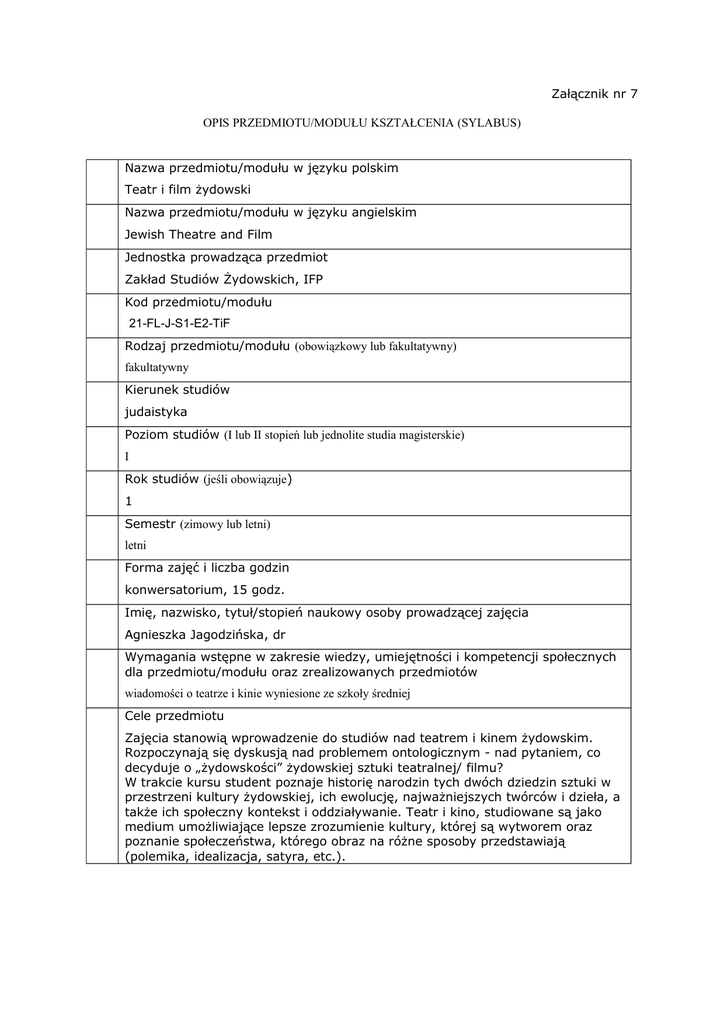 Załącznik nr 7 OPIS PRZEDMIOTU/MODUŁU KSZTAŁCENIA (SYLABUS) Nazwa przedmiotu/modułu w języku polskim Teatr i film żydowski Nazwa przedmiotu/modułu w języku angielskim Jewish Theatre and Film Jednostka prowadząca przedmiot Zakład Studiów Żydowskich, IFP Kod przedmiotu/modułu 21-FL-J-S1-E2-TiF Rodzaj przedmiotu/modułu (obowiązkowy lub fakultatywny) fakultatywny Kierunek studiów judaistyka Poziom studiów (I lub II stopień lub jednolite studia magisterskie) I Rok studiów (jeśli obowiązuje) 1 Semestr (zimowy lub letni) letni Forma zajęć i liczba godzin konwersatorium, 15 godz. Imię, nazwisko, tytuł/stopień naukowy osoby prowadzącej zajęcia Agnieszka Jagodzińska, dr Wymagania wstępne w zakresie wiedzy, umiejętności i kompetencji społecznych dla przedmiotu/modułu oraz zrealizowanych przedmiotów wiadomości o teatrze i kinie wyniesione ze szkoły średniej Cele przedmiotu Zajęcia stanowią wprowadzenie do studiów nad teatrem i kinem żydowskim. Rozpoczynają się dyskusją nad problemem ontologicznym - nad pytaniem, co decyduje o „żydowskości” żydowskiej sztuki teatralnej/ filmu? W trakcie kursu student poznaje historię narodzin tych dwóch dziedzin sztuki w przestrzeni kultury żydowskiej, ich ewolucję, najważniejszych twórców i dzieła, a także ich społeczny kontekst i oddziaływanie. Teatr i kino, studiowane są jako medium umożliwiające lepsze zrozumienie kultury, której są wytworem oraz poznanie społeczeństwa, którego obraz na różne sposoby przedstawiają (polemika, idealizacja, satyra, etc.). Zakładane efekty kształcenia WIEDZA Student: - zna i rozumie podstawowe metody analizy żydowskich dzieł teatralnych i filmowych - ma wiedzę dotyczącą najważniejszych zjawisk z historii kultury żydowskiej od ich początków do czasów współczesnych oraz ważnych ośrodków życia kulturalnego UMIEJĘTNOŚCI - potrafi wyszukiwać, selekcjonować, analizować, oceniać i użytkować wiedzę z zakresu studiów nad żydowskim teatrem i kinem z wykorzystaniem różnych źródeł i metod - potrafi zastosować elementarne zasady i procedury badawczej, formułować i analizować problemy, dobrać odpowiednie narzędzia, formułować wnioski, opracować i zaprezentować rezultaty pracy w zakresie studiów nad żydowskim teatrem i kinem - potrafi identyfikować różne rodzaje wytworów kultury (z obszaru teatru i filmu) będące przedmiotem badań literaturoznawstwa, językoznawstwa i kulturoznawstwa - potrafi, posługując się typowymi metodami, analizować żydowskie dzieła teatralne i filmowem oraz interpretować je, dążąc do określenia ich znaczeń, zakresu oddziaływania społecznego oraz ich miejsca w procesie historycznym i w przemianach kultury KOMPETENCJE SPOŁECZNE - potrafi pracować w zespole, przyjmując w nim różne role, dzieli się posiadaną wiedzą i umiejętnościami - umie odpowiednio określić priorytety służące realizacji zadań; potrafi gospodarować czasem i realizować określone zadania w wyznaczonych terminach - poznając specyfikę teatru i filmu żydowskiego ma świadomość różnic kulturowych i związanych z tym wyzwań, potrafi w praktyce stosować wiedzę o mechanizmach komunikacji interkulturowej - potrafi uczestniczyć w życiu kulturalnym (związanym z teatrem i filmem), korzystać z różnorodnych jego form i różnych mediów Symbole kierunkowych efektów kształcenia, np.: K_W01*, K_U05, K_K03 K-W06, K-W09, K-U01, K-U02, K-U05, K-U06, K-K02, K-K03, KK06, K-K07/ K-W06, K-W09, KU05, K-K02, K-K03, K-K04, KK06, K-K08 Treści programowe - Ontologia teatru i kina żydowskiego - Początki teatru żydowskiego - W stronę nowoczesności: od teatru amatorskiego do profesjonalnego - Reforma teatru; awangarda - Żydowskie życie teatralne w Polsce po wojnie – casus Dolnego Śląska - Początki kinematografii żydowskiej - Państwo Izrael i jego problemy ukazane przez pryzmat kina - Legal alien? Portrety filmowe nowego imigranta w Erec Israel – między idealizacją a satyrą - Gender i queer w kinie izraelskim - Żydzi ortodoksyjni w kinie i kino Żydów ortodoksyjnych Zalecana literatura (podręczniki) Teksty obowiązkowe to pozycje zaznaczone pogrubieniem; pozostałe to literatura uzupełniająca dla chętnych. I. Avisar, Israeli cinema and the national Holocaust complex 1948-1978 [w:] A Holocaust a muvészetekben, red. L. Kabdebó, E. Schmidt, Pécs 1994, s. 209216. N. Gertz, From Jew to Hebrew. The ‘Zionist narrative’ in the Israeli cinema of the 1940s and 1950s, “Israel Affairs” 4,3-4 (1998), s. 175-199. N. Gertz, The others in Israeli cinema of the 1940s and 1950s. Holocaust survivors, women, and Arabs, [w:] Israeli and Palestinian Identities in History and Literature, red. K. Abdel-Malek, D. Jacobson, Basingstoke, Hampshire 1999, s. 35-62. N. Gertz, Space and gender in the new Israeli and Palestinian cinema, “Prooftexts” 22,1-2 (2002), s. 157-185. N. Gross, Film żydowski w Polsce, Kraków 2002. R. Harris, Parallel lives - Palestinian, Druze, and Jewish women in recent Israeli cinema on the conflict : "Free Zone", "Syrian Bride", and "Lemon Tree", „Shofar” 32,1 (2013), s. 79-102. Israeli Cinema. Identities in Motion, red. M. Talmon, Y. Peleg, Austin 2011 (wybrane teksty). G. Kouts, The Representation of the Foreigner in Israeli Films (1966–1976), „REEH The European Journal of Hebrew Studies”, Paris: 1999 (Vol. 2), s. 80– 108. O. Lubin, Body and territory. Women in Israeli cinema, “Israel Studies” 4,1 (1999), s. 175-187. O. Lubin, Israeli cinema in its socio-political context. Resistance of the popular, “Israel Studies Forum” 17,2 (2002), s. 61-85. Modern Jewish Experience in World Cinema, red. L. Baron, Waltham 2011 (wybrane teksty). „Pamiętnik Teatralny” 1992, z. 1-4. Y. Peleg, From black to white: changing images of Mizrahim in Israeli cinema, “Israel Studies 13,2 (2008), s. 122-14. R. Rutliner-Reiner, Creative Expressions of Resistance. Original Theat