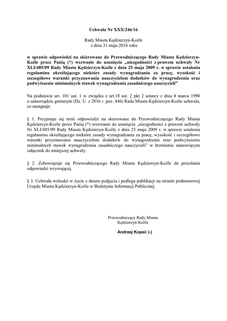 Uchwała Nr XXX/246/16 Rady Miasta Kędzierzyn-Koźle z dnia 31 maja 2016 roku w sprawie odpowiedzi na skierowane do Przewodniczącego Rady Miasta KędzierzynKoźle przez Panią (*) wezwanie do usunięcia „niezgodności z prawem uchwały Nr XLI/485/09 Rady Miasta Kędzierzyn-Koźle z dnia 25 maja 2009 r. w sprawie ustalenia regulaminu określającego niektóre zasady wynagradzania za pracę, wysokość i szczegółowe warunki przyznawania nauczycielom dodatków do wynagrodzenia oraz podwyższenie minimalnych stawek wynagrodzenia zasadniczego nauczycieli” Na podstawie art. 101 ust. 1 w związku z art.18 ust. 2 pkt 2 ustawy z dnia 8 marca 1990 o samorządzie gminnym (Dz. U. z 2016 r. poz. 446) Rada Miasta Kędzierzyn-Koźle uchwala, co następuje: § 1. Przyjmuje się treść odpowiedzi na skierowane do Przewodniczącego Rady Miasta Kędzierzyn-Koźle przez Panią (*) wezwanie do usunięcia „niezgodności z prawem uchwały Nr XLI/485/09 Rady Miasta Kędzierzyn-Koźle z dnia 25 maja 2009 r. w sprawie ustalenia regulaminu określającego niektóre zasady wynagradzania za pracę, wysokość i szczegółowe warunki przyznawania nauczycielom dodatków do wynagrodzenia oraz podwyższenie minimalnych stawek wynagrodzenia zasadniczego nauczycieli” w brzmieniu stanowiącym załącznik do niniejszej uchwały. § 2. Zobowiązuje się Przewodniczącego Rady Miasta Kędzierzyn-Koźle do przesłania odpowiedzi wzywającej. § 3. Uchwała wchodzi w życie z dniem podjęcia i podlega publikacji na stronie podmiotowej Urzędu Miasta Kędzierzyn-Koźle w Biuletynie Informacji Publicznej. Przewodniczący Rady Miasta Kędzierzyn-Koźle Andrzej Kopeć (-) Załącznik do uchwały Nr XXX/246/16 Rady Miasta Kędzierzyn-Koźle z dnia 31 maja 2016 r. Stanowisko Prezydenta Miasta w sprawie skierowanego do Przewodniczącego Rady Miasta Kędzierzyn-Koźle przez Panią (*) wezwania do usunięcia „niezgodności z prawem uchwały Nr XLI/485/09 Rady Miasta Kędzierzyn-Koźle z dnia 25 maja 2009 r. w sprawie ustalenia regulaminu określającego niektóre zasady wynagradzania za pracę, wysokość i szczegółowe warunki przyznawania nauczycielom dodatków do wynagrodzenia oraz podwyższenie minimalnych stawek wynagrodzenia zasadniczego nauczycieli”. W związku z orzecznictwem Naczelnego Sądu Administracyjnego w Warszawie z dnia 3 czerwca 2011 roku, sygn. I OSK 323/11, wskazującym, iż „z przepisów ustawy - Karta Nauczyciela nie wynika by była dopuszczalna możliwość wypłacania nauczycielowi tylko jednego dodatku do wynagrodzenia, jeśli pracowałby on w warunkach zarówno trudnych jaki i uciążliwych", Prezydent Miasta dokona analizy możliwości opracowania i przedłożenia Radzie Miasta projektu uchwały zmieniającej § 16 ust. 4 uchwały Nr XLI/485/09 Rady Miasta Kędzierzyn-Koźle z dnia 25 maja 2009 r. w sprawie ustalenia regulaminu określającego niektóre zasady wynagradzania za pracę, wysokość i szczegółowe warunki przyznawania nauczycielom dodatków do wynagrodzenia oraz podwyższenie minimalnych stawek wynagrodzenia zasadniczego nauczycieli. *) – dane osoby skarżącej znajdują się w aktach postępowania