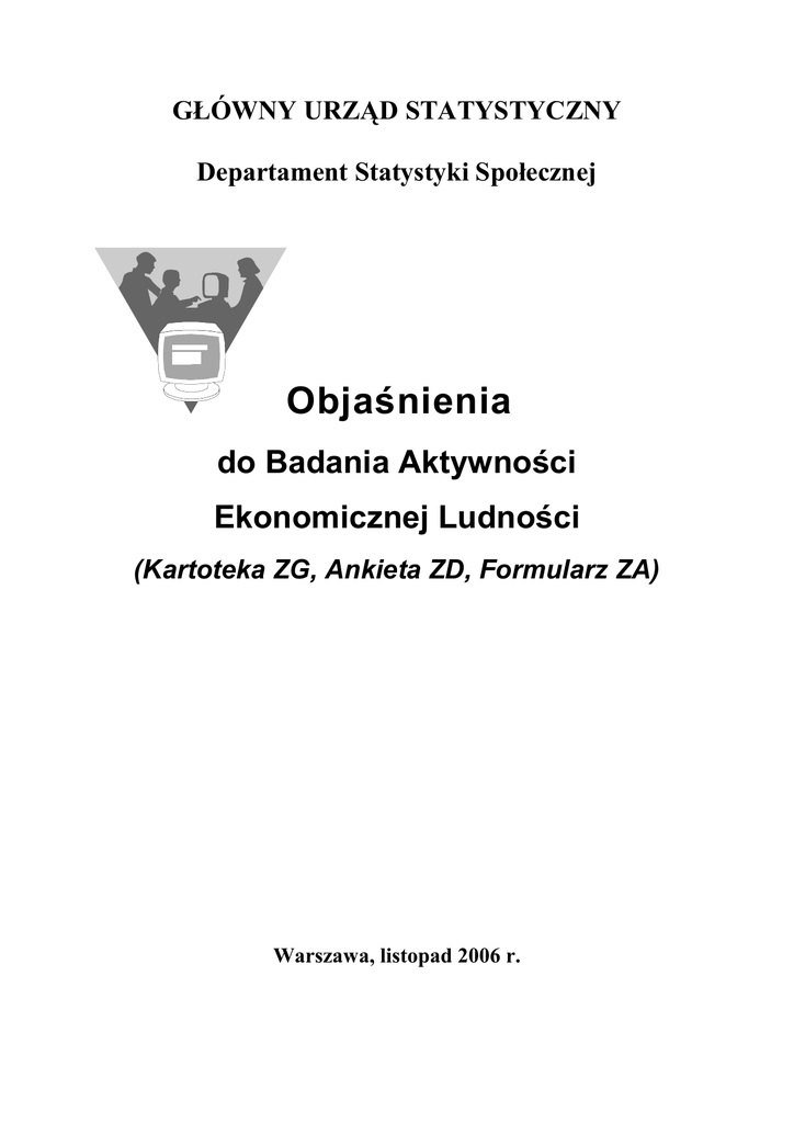GŁÓWNY URZĄD STATYSTYCZNY Departament Statystyki Społecznej Objaśnienia do Badania Aktywności Ekonomicznej Ludności (Kartoteka ZG, Ankieta ZD, Formularz ZA) Warszawa, listopad 2006 r. CZĘŚĆ I PRZEPISY OGÓLNE §1 Podstawa prawna badania Podstawą prawną Badania Aktywności Ekonomicznej Ludności jest ustawa z dnia 29 czerwca 1995 r. o statystyce publicznej (Dz. U. z 1995 r. Nr 88, poz.439 wraz z późniejszymi zmianami). §2 Cel badania Podstawowym celem Badania Aktywności Ekonomicznej Ludności jest uzyskiwanie danych o wielkości i strukturze zasobów siły roboczej. Wyniki badania będą słuŜyły głównie do: - ustalania bilansów siły roboczej z wyróŜnieniem trzech podstawowych kategorii ludności: pracujących, bezrobotnych i biernych zawodowo, - analizy zmian aktywności ekonomicznej ludności w róŜnych grupach społecznozawodowych i przekrojach terytorialnych, - analizy sytuacji na rynku pracy, w tym oceny skali i stopnia zmian natęŜenia bezrobocia w ujęciu przestrzennym, - charakterystyki społeczno-demograficznej osób bezrobotnych, - analizy struktury zatrudnienia według cech społeczno-demograficznych i zawodowych. §3 Forma i zakres badania 1. Badanie Aktywności Ekonomicznej Ludności prowadzone jest przy zastosowaniu metody reprezentacyjnej. Oznacza to, Ŝe wyniki uzyskane na podstawie badania wylosowanej próby uogólnia się na populację generalną. 2. Podmiotami badania są osoby w wieku 15 lat i więcej będące członkami gospodarstw domowych w wylosowanych mieszkaniach. 3. W losowaniu nie biorą udziału pomieszczenia w obiektach ruchomych i w obiektach zbiorowego zamieszkania oraz pomieszczenia prowizoryczne. 4. Badaniem nie są obejmowane osoby nieobecne w gospodarstwie domowym przez okres powyŜej 3 miesięcy. 2 Osoby, które: - odbywają słuŜbę wojskową, - odbywają karę pozbawienia wolności, - mieszkają w internatach, domach studenckich, hotelach pracowniczych, domach opieki społecznej i innych gospodarstwach zbiorowych, - przebywają za granicą powinny być jedynie rejestrowane w Kartotece Gospodarstwa Domowego ZG na podstawie informacji uzyskanych od innych członków gospodarstwa domowego. 5. Od I kwartału 2004 r. badaniem objęci są wszyscy cudzoziemcy będący członkami wylosowanych gospodarstw domowych. §4 Organizacja badania Pracami związanymi z przygotowaniem i prowadzeniem Badania Aktywności Ekonomicznej Ludności kieruje Departament Statystyki Społecznej GUS we współpracy z Departamentem Koordynacji i Organizacji Badań. Na terenie województw badanie prowadzą urzędy statystyczne. §5 Ogólne zasady metodyczne 1. Badanie Aktywności Ekonomicznej Ludności prowadzone jest kwartalnie na próbie gospodarstw domowych w wylosowanych mieszkaniach. Dobór prób kwartalnych odbywa się według zasad tzw. schematu rotacyjnego. Co kwartał dokonuje się częściowej wymiany prób elementarnych. 2. Przedmiotem badania jest sytuacja w zakresie aktywności ekonomicznej członków gospodarstw domowych, tzn. fakt wykonywania pracy, pozostawania bezrobotnym lub biernym zawodowo w tygodniu objętym badaniem. 3. Badanie realizowane jest metodą obserwacji ciągłej (ruchomy tydzień badania). W kaŜdym z 13 tygodni kwartału badana jest 1/13 część kwartalnej próby wylosowanych mieszkań. Przy tej metodzie obserwacji wyniki badania ilustrują sytuację na rynku pracy w okresie całego kwartału. 4. Przez badany tydzień (tydzień obserwacji) naleŜy rozumieć siedem kolejnych dni od poniedziałku do niedzieli. 5. Badanie ankietowe naleŜy przeprowadzić w ciągu 7 dni następujących po tygodniu wyznaczonym do obserwacji. Tydzień, w którym badanie jest przeprowadzane, nazywa się tygodniem ankietyzacji. 6. Badanie prowadzone jest przez ankieterów w wylosowanych mieszkaniach. Pierwsza wizyta ankietera powinna być poprzedzona listem Prezesa Głównego Urzędu Statystycznego informującym o celu badania oraz o fakcie wylosowania mieszkania do badania. 3 7. Odpowiedzi na pytania powinna udzielać osoba, której ankieta dotyczy. W szczególnych przypadkach dopuszcza się moŜliwość, aby za osobę nieobecną udzielił odpowiedzi inny członek gospodarstwa domowego, zorientowany w sytuacji zawodowej osoby nieobecnej. 8. Badanie prowadzone jest przy uŜyciu dwóch formularzy: 1) Kartoteki Gospodarstwa Domowego ZG, która przeznaczona jest dla kaŜdego gospodarstwa domowego znajdującego się w wylosowanym mieszkaniu; Kartoteki ZG stanowią rejestr gospodarstw domowych przez cały cykl badania, 2) Ankiety ZD, która wypełniana jest co kwartał dla kaŜdej osoby objętej badaniem, tj. osoby w wieku 15 lat i więcej, obecnej w gospodarstwie domowym lub nieobecnej przez okres nie dłuŜszy niŜ 3 miesiące. Dodatkowo wprowadzony został formularz ZA, który wypełniany jest w wypadku nieprzeprowadzenia wywiadu (np. odmowa, nieobecność mieszkańców). §6 Zadania Urzędów Statystycznych Pełny zakres obowiązków urzędów statystycznych związanych z realizacją badań ankietowych prowadzonych przez GUS został opublikowany w „Zasadach organizacji i działalności sieci ankieterów statystycznych i rzeczoznawców” (GUS, kwiecień 2000 r.). Do szczegółowych zadań urzędów statystycznych w zakresie Badania Aktywności Ekonomicznej Ludności naleŜy: 1. prowadzenie przez okres badania rejestru wylosowanych mieszkań, 2. załoŜenie i aktualizowanie przez okres badania rejestru gospodarstw domowych objętych badaniem, w oparciu o Kartoteki Gospodarstw Domowych (ZG) i formularze ZA, 3. szkolenie ankieterów w zakresie wypełniania formularzy ZG, ZD i ZA, 4. nadzór merytoryczny nad prowadzonym badaniem, 5. nadzór nad przebiegiem ankietowania, 6. kontrola kompletności, analizowanie przyczyn braku odpowiedzi, 7. kontrola logiczna wypełnionych formularzy, symbolizacja niektórych odpowiedzi na formularzu oraz kontrola symbolizacji dokonanej przez ankieterów, 8. przekazywanie do Departamentu Statystyki Społecznej GUS info