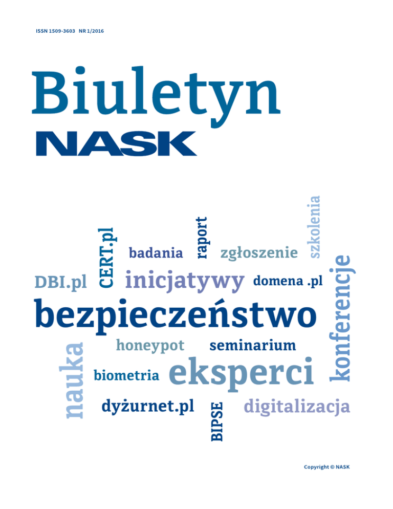 inicjatywy domena .pl seminarium biometria dyżurnet.pl BIPSE nauka bezpieczeństwo honeypot eksperci konferencje zgłoszenie szkolenia raport CERT.pl DBI.pl badania digitalizacja Spis treści konferencje 5 Razem tworzymy lepszy Internet 7 Globalne wyzwanie – bezpieczny Internet dla dzieci i młodzieży 8 SECURE 2015 – Cyberpolicjanci kontra cyberprzestępcy Wydarzenia 10 10 10 11 11 11 Piknik Naukowy Festiwal Nauki CyberPol – szkolenia dla Policji Seminarium eksperckie Konferencja naukowa „Nastolatki wobec internetu” Sukces polskiej biometrii RAPORTY 12 13 15 Roczny raport CERT Polska za 2014 rok Raport Dyżurnet.pl Rekordowy III kwartał w rejestrze domeny .pl BADANIA 17 Nastolatki wobec internetu Projekty 21 Malware kontra lodówka 22 Bezpieczne uwierzytelnienie we współczesnym świecie 24 Digitalizacja, cyfryzacja czyli dostępność…. Bezpieczeństwo 28 29 Cyberprzestępcy podszywają się pod Pocztę Polską Dorkbot już nam nie zagraża Rozmowa z … 30 Senior dla kultury NR 1/2016 Redakcja: Anna Maj, Monika Gajewska-Pol Adres: ul. Wąwozowa 18, 02-796 Warszawa, tel. (22) 38 08 200, e-mail: [email protected] Redakcja zastrzega sobie prawo do skrótu i opracowania redakcyjnego otrzymanych tekstów. Projekt okładki, skład i przygotowanie do druku: Anna Nykiel Biuletyn Szanowni Państwo, Mam przyjemność zaprosić Państwa do lektury najnow- celu ochronę przed zagrożeniami najmłodszych użyt- szego numeru „Biuletynu NASK”. Prezentujemy w nim kowników internetu. W ramach realizowanego przez nasze osiągnięcia, najważniejsze wydarzenia minione- NASK projektu Safer Internet funkcjonuje zespół go roku, opisujemy ciekawe i ważne projekty oraz naj- Dyżurnet.pl, przyjmujący zgłoszenia o niebezpiecz- nowsze opracowane przez nas rozwiązania naukowe. nych treściach internetowych, które zagrażają dzieciom i młodzieży korzystającym z sieci. W czasie swo- NASK jest instytutem badawczym, który realizuje jej dziesięcioletniej działalności zespół przeanalizował liczne projekty naukowe oraz komercyjne, szczególnie blisko 45 tysięcy zgłoszeń. W Biuletynie prezentujemy w segmencie usług telekomunikacyjnych i bezpieczeń- także ogólnopolskie badania „Nastolatki wobec Inter- stwa teleinformatycznego. Wśród priorytetowych dzia- netu”, przeprowadzone we współpracy NASK, Wyższej łań instytutu znajdują się projekty badawczo-rozwojo- Szkoły Nauk Społecznych Pedagogium oraz Rzecznika we dotyczące zwiększenie efektywności, niezawod- Praw Dziecka, które pokazują, w jaki sposób współcze- ności i bezpieczeństwa sieci oraz biometrycznych me- sna młodzież korzysta z sieci i jak w niej funkcjonuje. tod weryfikacji tożsamości w bezpieczeństwie usług. NASK zarządza także domeną .pl. Ostatni kwartał Na łamach Biuletynu prezentujemy coroczny raport ze- 2015 roku był rekordowy jeśli chodzi o liczbę rejestra- społu CERT Polska, zajmującego się reagowaniem na cji. Średnio było to 3 066 nazw dziennie. Dziś liczba za- incydenty naruszające bezpieczeństwo w sieci. Jak rejestrowanych domen zbliża się do 3 mln, co stawia podkreślają eksperci z zespołu, aż cztery z dziesię- nasz rejestr na 6. miejscu w Europie. ciu największych cyberzagrożeń wymierzonych jest w klientów bankowości elektronicznej. Jest to niezwy- To oczywiście tylko niektóre z tematów poruszanych kle niebezpieczne zjawisko, ponieważ skutkuje realną w Biuletynie. utratą środków finansowych, dlatego tak istotne jest kształtowanie świadomości użytkowników o cyberzagrożeniach. Życzę Państwu przyjemnej lektury, NASK przykłada szczególną wagę nie tylko do technicznych aspektów bezpieczeństwa sieciowego. Insty- Michał Chrzanowski tut od wielu lat podejmuje szereg działań mających na Dyrektor NASK Biuletyn NASK w liczbach 600 000 ponad alertów dziennie dotyczących polskich sieci 620-700 połączeń TCP na sekundę od systemów zarażonych złośliwym oprogramowaniem z całego świata trafia do sinkhole CERT Polska 2nazw642 378 aktywnych w domenie .pl IX Międzynarodowa Konferencja 2 dni konferencji 5warsztatów specjalistycznych 45 prelekcji ponad 400 uczestników 54 prelegentów Raport 2015 14 277 przeanalizowanych incydentów 3029 przypadków nielegalnych treści prezentujących seksualne wykorzystanie osób małoletnich 68% materiałów prezentujących seksualne wykorzystanie „Bezpieczeństwo dzieci i młodzieży w Internecie” 600 uczestników 60 prelegentów Dzień Bezpiecznego Internetu 2015 1523 lokalne inicjatywy osób małoletnich znika w ciągu trzech dni Biuletyn konferencje Dzień Bezpiecznego Internetu Razem tworzymy lepszy Internet Dzień Bezpiecznego Internetu (DBI) obchodzony jest rokrocznie w kilkudziesięciu państwach na całym świecie. To akcja organizowana od 2004 r. z inicjatywy Komisji Europejskiej w celu propagowania działań na rzecz bezpiecznego dostępu dzieci i młodzieży do zasobów internetowych. W Polsce DBI od 2005 roku organizowany jest przez Polskie Centrum Programu Safer Internet (PCPSI), które tworzą Naukowa i Akademicka Sieć Komputerowa (NASK) oraz Fundacja Dzieci Niczyje (FDN). Wszystkie działania podejmowane w ramach DBI 2015 realizowane były pod hasłem „Razem tworzymy lepszy Internet”. Motywem przewodnim obchodów była rola, jaką każda z osób korzystających z internetu może odegrać w budowie bezpiecznego i przyjaznego środowiska online. Każdy z nas ponosi odpowiedzialność za to, co robi w sieci i w jaki sposób z niej korzysta. Chcieliśmy również zwrócić szczególną uwagę na potencjał sieci, który dzieci mogą wykorzystać zarówno w edukacji, kontaktach z rówieśnikami, jak również jako formę twórczej rozrywki. Centralnym punktem obchodów Dnia Bezpiecznego Internetu w Polsce była konferencja dla przedstawicieli sektora edukacyjnego i profesjonalistów. Wydarzenie to odbyło się 10 lutego 2015 r. w warszawskim Multikinie Złote Tarasy. Program spotk