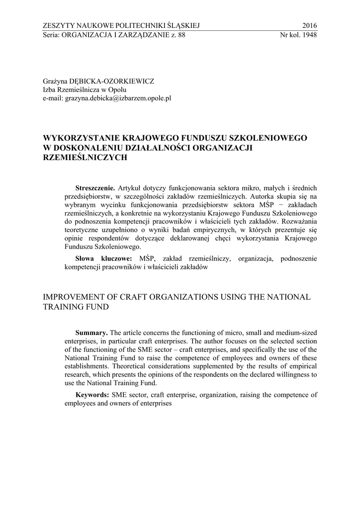 ZESZYTY NAUKOWE POLITECHNIKI ŚLĄSKIEJ Seria: ORGANIZACJA I ZARZĄDZANIE z. 88 2016 Nr kol. 1948 Grażyna DĘBICKA-OZORKIEWICZ Izba Rzemieślnicza w Opolu e-mail: [email protected] WYKORZYSTANIE KRAJOWEGO FUNDUSZU SZKOLENIOWEGO W DOSKONALENIU DZIAŁALNOŚCI ORGANIZACJI RZEMIEŚLNICZYCH Streszczenie. Artykuł dotyczy funkcjonowania sektora mikro, małych i średnich przedsiębiorstw, w szczególności zakładów rzemieślniczych. Autorka skupia się na wybranym wycinku funkcjonowania przedsiębiorstw sektora MŚP − zakładach rzemieślniczych, a konkretnie na wykorzystaniu Krajowego Funduszu Szkoleniowego do podnoszenia kompetencji pracowników i właścicieli tych zakładów. Rozważania teoretyczne uzupełniono o wyniki badań empirycznych, w których prezentuje się opinie respondentów dotyczące deklarowanej chęci wykorzystania Krajowego Funduszu Szkoleniowego. Słowa kluczowe: MŚP, zakład rzemieślniczy, organizacja, podnoszenie kompetencji pracowników i właścicieli zakładów IMPROVEMENT OF CRAFT ORGANIZATIONS USING THE NATIONAL TRAINING FUND Summary. The article concerns the functioning of micro, small and medium-sized enterprises, in particular craft enterprises. The author focuses on the selected section of the functioning of the SME sector – craft enterprises, and specifically the use of the National Training Fund to raise the competence of employees and owners of these establishments. Theoretical considerations supplemented by the results of empirical research, which presents the opinions of the respondents on the declared willingness to use the National Training Fund. Keywords: SME sector, craft enterprise, organization, raising the competence of employees and owners of enterprises 76 G. Dębicka-Ozorkiewicz 1. Wprowadzenie Pogłębiające się procesy globalizacji, rosnąca złożoność czy też dynamika i nieciągłość zmian zachodzących w otoczeniu organizacji rzemieślniczych stanowią istotne wyzwanie dla rzemieślników. Konieczne staje się podjęcie odpowiednich działań adaptacyjnych związanych z osiąganiem przewagi konkurencyjnej, umożliwiającej przede wszystkim uzyskanie takiej pozycji, która pozwala na długotrwałe funkcjonowanie i rozwój, a zwłaszcza skuteczne konkurowanie na rynku globalnym. Nabywanie nowych kompetencji poprzez ustawiczne kształcenie zawodowe może być wręcz jednym ze strategicznych narzędzi zarządzania, użytecznym w realizacji wytyczonych przez rzemiosło celów, upowszechnianiu kultury organizacyjnej i rozwijaniu niezbędnych kompetencji wśród pracowników. Może również wyrównywać wcześniejsze braki kompetencyjne załogi. Nowelizacja ustawy o promocji zatrudnienia i instytucjach rynku pracy od 27 maja 2014 roku wprowadziła nowy instrument polityki rynku pracy – Krajowy Fundusz Szkoleniowy, w skrócie KFS.1 Istotą tego rozwiązania jest przeznaczenie części składki odprowadzanej przez pracodawców na Fundusz Pracy na wsparcie kształcenia ustawicznego podejmowanego z inicjatywy lub za zgodą pracodawcy. Instrument ten jest szansą dla organizacji rzemieślniczych na podniesienie kompetencji zarówno pracowników, jak i właścicielirzemieślników. Celem artykułu jest przedstawienie możliwości podnoszenia kompetencji właścicieli organizacji rzemieślniczych i ich pracowników przy wykorzystaniu Krajowego Funduszu Szkoleniowego. Podjęte w niniejszym artykule rozważania teoretyczne oraz zaprezentowane wyniki przeprowadzonych badań empirycznych stanowią podstawę dociekań dotyczących zidentyfikowanych problemów badawczych, sformułowanych w następujących pytaniach: Czy organizacje Szkoleniowego? rzemieślnicze znają możliwości Krajowego Funduszu Czy właściciele organizacji rzemieślniczych są zainteresowani wykorzystaniem Krajowego Funduszu Szkoleniowego na potrzeby podnoszenia kompetencji własnych i swoich pracowników? Czy i jaki istnieje związek pomiędzy wielkością firmy a chęcią skorzystania z KFS? Prace badawcze prowadzone były w okresie od listopada 2015 roku do stycznia 2016 roku wśród zakładów rzemieślniczych województwa opolskiego, śląskiego i dolnośląskiego, zrzeszonych w Izbie Rzemieślniczej w Opolu. Badania przeprowadzono z użyciem kwestionariusza ankiety. 1 Dz. U. z 2014 r., poz. 598 Wykorzystanie Krajowego Funduszu.… 77 2. Rzemiosło i organizacje rzemieślnicze Zgodnie z ustawową definicją rzemiosło to samodzielna działalność gospodarcza na niewielką skalę, o charakterze produkcyjno-usługowym, prowadzona na rachunek właściciela warsztatu i przy jego osobistym wkładzie pracy.2 W porównaniu z rozumieniem terminu „rzemiosło” obowiązującym do końca 1972 r. przepisy prawa przemysłowego z 1927 r. rozszerzyły jego zakres rodzajowy, który objął wówczas niektóre rodzaje działalności usługowej i wytwórczej, nieuważane dotychczas za rzemiosło. Zgodnie z prawem przemysłowym rzemiosłem były tylko te rodzaje działalności, które zostały wymienione na liście rzemiosł. Art. 1 Ustawy z dnia 8 czerwca 1972 r. o wykonywaniu i organizacji rzemiosła, która weszła w życie z dniem 1 stycznia 1973 r., określał rzemiosło jako zawodowe wykonywanie we własnym imieniu przez osoby fizyczne gospodarczej działalności wytwórczej i usługowej.3 Elementem definicji rzemiosła według Ustawy z dnia 8 czerwca 1972 r. o wykonywaniu i organizacji rzemiosła z 1972 r. jest stwierdzenie, iż rzemiosło wykonywane jest przez osoby fizyczne, czyli że wymaga pracy osobistej rzemieślnika.4 Zapis ten jednak nie wykluczał zatrudniania w ograniczonym zakresie pracowników najemnych, jeśli wynikało to z warunków ekonomicznych lub wymagań procesów usługowych czy produkcyjnych. W procesie zmian polityczno-gospodarczych w 1989 r. dokonano też regulacji prawnych dotyczących rzemiosła. Art. 2 ust. 1 Ustawy z dnia 22 marca 1989 r. o rzemiośle5 definiuje pojęcie rzemiosła następującymi słowami: „rzemiosłem jest zawodowe wykonywa