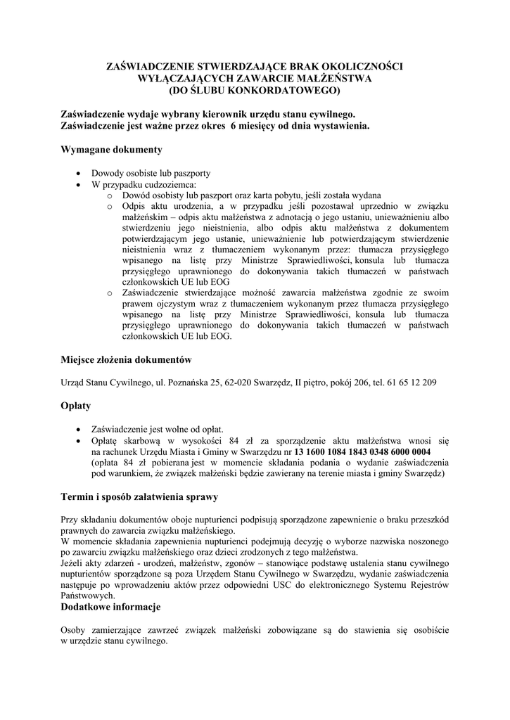 ZAŚWIADCZENIE STWIERDZAJĄCE BRAK OKOLICZNOŚCI WYŁĄCZAJĄCYCH ZAWARCIE MAŁŻEŃSTWA (DO ŚLUBU KONKORDATOWEGO) Zaświadczenie wydaje wybrany kierownik urzędu stanu cywilnego. Zaświadczenie jest ważne przez okres 6 miesięcy od dnia wystawienia. Wymagane dokumenty Dowody osobiste lub paszporty W przypadku cudzoziemca: o Dowód osobisty lub paszport oraz karta pobytu, jeśli została wydana o Odpis aktu urodzenia, a w przypadku jeśli pozostawał uprzednio w związku małżeńskim – odpis aktu małżeństwa z adnotacją o jego ustaniu, unieważnieniu albo stwierdzeniu jego nieistnienia, albo odpis aktu małżeństwa z dokumentem potwierdzającym jego ustanie, unieważnienie lub potwierdzającym stwierdzenie nieistnienia wraz z tłumaczeniem wykonanym przez: tłumacza przysięgłego wpisanego na listę przy Ministrze Sprawiedliwości, konsula lub tłumacza przysięgłego uprawnionego do dokonywania takich tłumaczeń w państwach członkowskich UE lub EOG o Zaświadczenie stwierdzające możność zawarcia małżeństwa zgodnie ze swoim prawem ojczystym wraz z tłumaczeniem wykonanym przez tłumacza przysięgłego wpisanego na listę przy Ministrze Sprawiedliwości, konsula lub tłumacza przysięgłego uprawnionego do dokonywania takich tłumaczeń w państwach członkowskich UE lub EOG. Miejsce złożenia dokumentów Urząd Stanu Cywilnego, ul. Poznańska 25, 62-020 Swarzędz, II piętro, pokój 206, tel. 61 65 12 209 Opłaty Zaświadczenie jest wolne od opłat. Opłatę skarbową w wysokości 84 zł za sporządzenie aktu małżeństwa wnosi się na rachunek Urzędu Miasta i Gminy w Swarzędzu nr 13 1600 1084 1843 0348 6000 0004 (opłata 84 zł pobierana jest w momencie składania podania o wydanie zaświadczenia pod warunkiem, że związek małżeński będzie zawierany na terenie miasta i gminy Swarzędz) Termin i sposób załatwienia sprawy Przy składaniu dokumentów oboje nupturienci podpisują sporządzone zapewnienie o braku przeszkód prawnych do zawarcia związku małżeńskiego. W momencie składania zapewnienia nupturienci podejmują decyzję o wyborze nazwiska noszonego po zawarciu związku małżeńskiego oraz dzieci zrodzonych z tego małżeństwa. Jeżeli akty zdarzeń - urodzeń, małżeństw, zgonów – stanowiące podstawę ustalenia stanu cywilnego nupturientów sporządzone są poza Urzędem Stanu Cywilnego w Swarzędzu, wydanie zaświadczenia następuje po wprowadzeniu aktów przez odpowiedni USC do elektronicznego Systemu Rejestrów Państwowych. Dodatkowe informacje Osoby zamierzające zawrzeć związek małżeński zobowiązane są do stawienia się osobiście w urzędzie stanu cywilnego. Jeżeli kierownik urzędu stanu cywilnego odmawia przyjęcia oświadczeń o wstąpieniu w związek małżeński powiadamia na piśmie osobę zainteresowaną o przyczynach odmowy. Osoba zainteresowana w terminie 14 dni od dnia doręczenia pisma może wystąpić z wnioskiem do sądu rejonowego właściwego ze względu na siedzibę urzędu stanu cywilnego o rozstrzygnięcie, czy okoliczności przedstawione przez kierownika urzędu stanu cywilnego uzasadniają odmowę dokonania czynności. Podstawa prawna: Ustawa z dnia 25 lutego 1964 r. Kodeks rodzinny i opiekuńczy (t.j. Dz. U. z 2015 r., poz. 583 z późn. zm.) Ustawa z dnia 28 listopada 2014 r. Prawo o aktach stanu cywilnego (Dz. U. z 2014 r., poz. 1741 z późn. zm.), Ustawa z dnia 16 listopada 2006 r. o opłacie skarbowej (tekst jednolity Dz. U. z 2015 r., poz. 783 z późn. zm.)