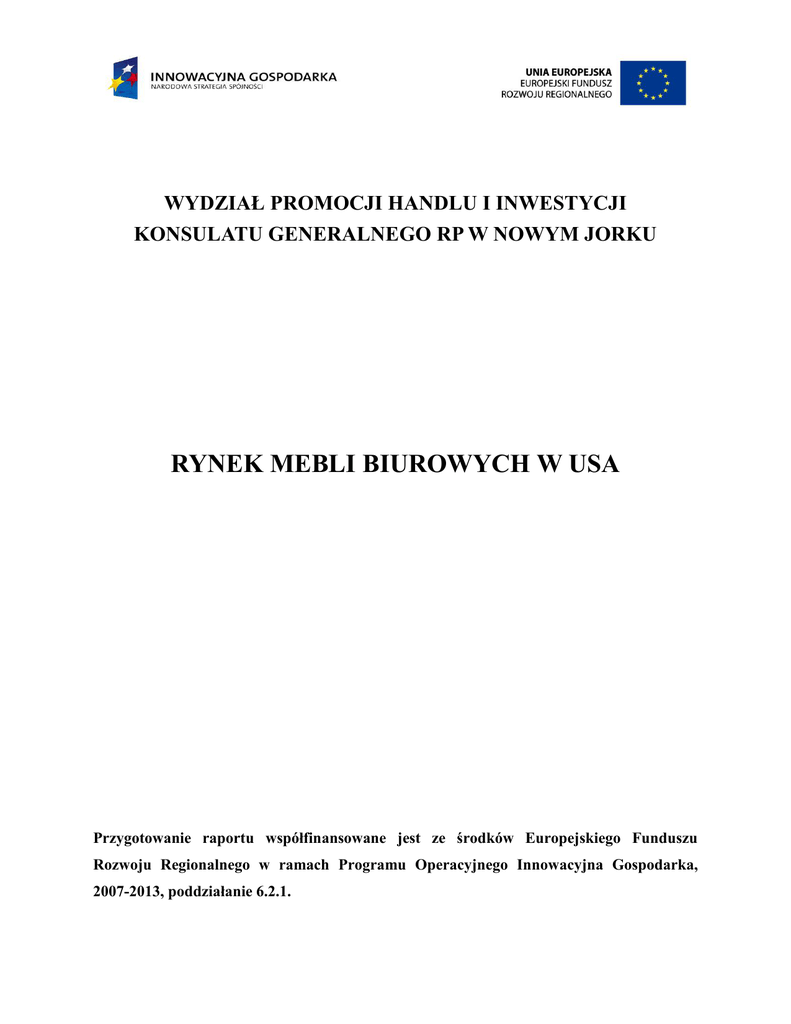 WYDZIAŁ PROMOCJI HANDLU I INWESTYCJI KONSULATU GENERALNEGO RP W NOWYM JORKU RYNEK MEBLI BIUROWYCH W USA Przygotowanie raportu współfinansowane jest ze środków Europejskiego Funduszu Rozwoju Regionalnego w ramach Programu Operacyjnego Innowacyjna Gospodarka, 2007-2013, poddziałanie 6.2.1. WYDZIAŁ PROMOCJI HANDLU I INWESTYCJI KONSULATU GENERALNEGO RP W NOWYM JORKU RYNEK MEBLI BIUROWYCH W USA W ciągu ostatnich pięciu lat do 2011 roku sytuacja na rynku mebli biurowych w Stanach Zjednoczonych kształtowała się niekorzystnie, a w przemyśle odnotowano straty. Zła koniunktura, a także wzrost bezrobocia od 2006 r., oddziaływały hamująco na branżę. To doprowadziło wiodących producentów na rynku krajowym do zmniejszenia ilości dostarczanych towarów, a ponadto wzrostu importu z Chin, gdyż kraj ten był w stanie produkować asortyment po znacznie niższych kosztach. W konsekwencji powyższego, spadły przychody rocznie średnio o 6,2% na przestrzeni pięciu lat do 2011 roku. Dodatkowo niestabilny poziom cen, a w szczególności wahania cen stali i drewna każdego roku o ponad 5% w latach 2006 do 2010, oddziaływały niekorzystnie na przemysł mebli biurowych. IBIS World podaje, że w rezultacie wahania się cen surowców, które utrudniały producentom możliwość przewidywania przyszłych wydatków i kontrolę kosztów, marże spadły z 3,1% przychodów w 2006 r. do 2,8% w 2011 roku. W ciągu ostatnich pięciu lat zmalała także liczba producentów w stosunku rocznym średnio o 5,4% do całkowitej sumy 2967 przedsiębiorstw. Jednakże obecnie warunki popytu ulegają poprawie, a z chwilą, gdy gospodarka USA wyjdzie z recesji, firmy będą mogły w pełni rozszerzyć swoją działalność. Ponieważ odnotowuje się wzrost liczby przedsiębiorstw i ich pracowników, przewiduje się, że w 2011 r. przychody wzrosną o 3,4% na łączną sumę 20,7 mld USD, a do 2016 r. zwiększą się co roku średnio o 2,6% na łączną kwotę 23,5 mld USD. Przemysł mebli biurowych dostarcza produkty na rynku głównie klientom korporacyjnym, gdyż to one generują największe przychody w sektorze mebli. W sytuacji, kiedy przedsiębiorstwo aktywnie się rozwija, zatrudnia większą liczbę pracowników, tym samym musi zakupić większą ilość mebli biurowych na użytek nowo zatrudnionych osób. Jednakże w okresie recesji konsumenci ograniczyli swoje wydatki, a na skutek tego spadły zyski firm o 11,8% w 2008 r. i 3,8% w roku kolejnym. Ponadto, niepewne warunki gospodarcze doprowadziły do redukcji zatrudnienia, co spowodowało, że wzrosły krajowe stopy bezrobocia z 4,6% w 2007 r. do 9,3% w roku 2009. Zatem słabe wyniki finansowe przedsiębiorstw i ograniczenie liczby zatrudnianych pracowników, wywołały znaczny spadek w sprzedaży mebli biurowych. W 2009 roku, po raz pierwszy od prawie dwóch dekad, odnotowano spadek liczby przedsiębiorstw, które utworzyły w ten sposób nadwyżkę na rynku na używane meble biurowe. W rezultacie, przedsiębiorstwa chcąc ograniczyć swoje wydatki, zaczęły nabywać wysokiej jakości Rynek mebli biurowych w USA (lipiec 2011) 2 WYDZIAŁ PROMOCJI HANDLU I INWESTYCJI KONSULATU GENERALNEGO RP W NOWYM JORKU używane meble zamiast kupować nowe od hurtowników lub innych sprzedawców. Wówczas w roku 2009 przychody w branży spadły o 24,2%. Od 2010 roku sytuacja na rynku mebli biurowych ulega poprawie. Zgodnie z raportem IBIS World, dzięki polepszeniu warunków ekonomicznych, złagodzeniu polityki kredytowej i zwiększeniu wydatków konsumentów, liczba amerykańskich firm wzrosła o 0,5% w 2010 r., a ponadto wzrośnie o 0,6% w roku 2011. Zyski przedsiębiorstw także zwiększyły się o 4,0% w 2010 r. i o 3,8% w roku kolejnym. Te korzystne zmiany umożliwią zwiększenie przychodów w przemyśle mebli biurowych i poprawę sytuacji po poprzednim pięcioletnim spadku. Produkty i usługi na rynku mebli biurowych Przemysł mebli biurowych odpowiedzialny jest za produkcję asortymentu dla biur, a zgodnie z raportem IBIS World sektor ten można podzielić na cztery grupy: meble do siedzenia, systemy biurowe, wyposażenie ( skrzynie, komody, regały, szafki) i asortyment do przechowywania, inne meble biurowe. Grupa mebli do siedzenia, która obejmuje krzesła komputerowe, krzesła, biurka i kanapy, tworzą największy segment produktów dla tego przemysłu. W ciągu ostatnich pięciu lat udział tego segmentu w stosunku do całego rynku, wzrósł. Szacuje się, że w roku 2011 ta branża będzie stanowiła 33,1% całkowitej sprzedaży, podczas, gdy w 2006 r. poziom ten był niższy i wyniósł 26,5%. Wzrost ten jest wynikiem zwiększenia obawy o zdrowie i bezpieczeństwo w biurze, ponadto chęcią polepszenia komfortu i dobrego samopoczucia pracowników. Sprzedaż systemów biurowych w 2011 r. szacowana jest na 25,5% w stosunku do całego przemysłu mebli biurowych. Celem systemów biurowych jest izolowanie pracowników od zakłóceń w miejscu pracy, umożliwiając im maksymalizację wydajności. Ponadto, systemy te zwykle zapewniają poczucie jednolitości układu biura. Ostatnie pięć lat charakteryzowały się spadkiem w tym segmencie, co było przede wszystkim wynikiem zwolnienia dużej liczby pracowników umysłowych. W konsekwencji popyt na nowe systemy biurowe znacznie zmalał. Trzecią grupę stanowi wyposażenie i asortyment do przechowywania. Meble do przechowywania obejmują takie produkty jak: szafy na akta, szafy, szafki i regały. Przychody z tych dwóch segmentów w ciągu ubiegłych pięciu lat do 2011 r. były względnie stabilne, co oznacza, że sprzedaż produktów Rynek mebli biurowych w USA (lipiec 2011) 3 WYDZIAŁ PROMOCJI HANDLU I INWESTYCJI KONSULATU GENERALNEGO RP W NOWYM JORKU zmalała porównywalnie do spadków występujących w całym przemyśle, gdy popyt utrzymywał się na niskim poziomie. Ostatnią grupę produktów stanowią inne meble biurowe. Segment ten obejmuje szeroką gamę towarów, które nie są sklasyfikowane w w