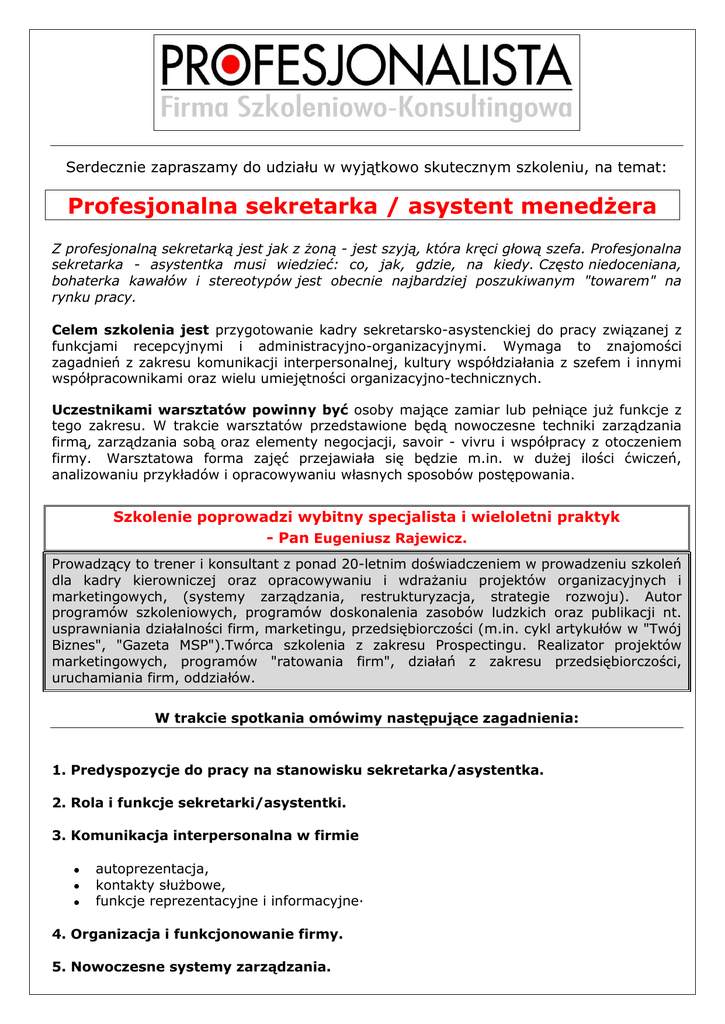 Serdecznie zapraszamy do udziału w wyjątkowo skutecznym szkoleniu, na temat: Profesjonalna sekretarka / asystent menedżera Z profesjonalną sekretarką jest jak z żoną - jest szyją, która kręci głową szefa. Profesjonalna sekretarka - asystentka musi wiedzieć: co, jak, gdzie, na kiedy. Często niedoceniana, bohaterka kawałów i stereotypów jest obecnie najbardziej poszukiwanym "towarem" na rynku pracy. Celem szkolenia jest przygotowanie kadry sekretarsko-asystenckiej do pracy związanej z funkcjami recepcyjnymi i administracyjno-organizacyjnymi. Wymaga to znajomości zagadnień z zakresu komunikacji interpersonalnej, kultury współdziałania z szefem i innymi współpracownikami oraz wielu umiejętności organizacyjno-technicznych. Uczestnikami warsztatów powinny być osoby mające zamiar lub pełniące już funkcje z tego zakresu. W trakcie warsztatów przedstawione będą nowoczesne techniki zarządzania firmą, zarządzania sobą oraz elementy negocjacji, savoir - vivru i współpracy z otoczeniem firmy. Warsztatowa forma zajęć przejawiała się będzie m.in. w dużej ilości ćwiczeń, analizowaniu przykładów i opracowywaniu własnych sposobów postępowania. Szkolenie poprowadzi wybitny specjalista i wieloletni praktyk - Pan Eugeniusz Rajewicz. Prowadzący to trener i konsultant z ponad 20-letnim doświadczeniem w prowadzeniu szkoleń dla kadry kierowniczej oraz opracowywaniu i wdrażaniu projektów organizacyjnych i marketingowych, (systemy zarządzania, restrukturyzacja, strategie rozwoju). Autor programów szkoleniowych, programów doskonalenia zasobów ludzkich oraz publikacji nt. usprawniania działalności firm, marketingu, przedsiębiorczości (m.in. cykl artykułów w "Twój Biznes", "Gazeta MSP").Twórca szkolenia z zakresu Prospectingu. Realizator projektów marketingowych, programów "ratowania firm", działań z zakresu przedsiębiorczości, uruchamiania firm, oddziałów. W trakcie spotkania omówimy następujące zagadnienia: 1. Predyspozycje do pracy na stanowisku sekretarka/asystentka. 2. Rola i funkcje sekretarki/asystentki. 3. Komunikacja interpersonalna w firmie autoprezentacja, kontakty służbowe, funkcje reprezentacyjne i informacyjne· 4. Organizacja i funkcjonowanie firmy. 5. Nowoczesne systemy zarządzania. 6. Zarządzanie czasem i przestrzenią. 7. Korespondencja i dokumentacja firmowa. 8. Organizacja kontaktów menedżera i współpracowników (wizyty, narady, prezentacje). 9. Etyka w biznesie, kultura obsługi klientów i współpracowników, reguły obyczajowe i kulturowe. 10. Elementy reklamy i promocji firmy (misja firmy, jej image). 11. Asertywność i empatia w pracy sekretarki/asystentki ( trudne sytuacje). 12. Środki techniczne w pracy sekretarki/asystentki. 13. Zagadnienia organizacyjno-prawne systemy zarządzania, elementy prawa pracy, prawa administracyjnego i cywilnego – umowy 14. Doskonalenie umiejętności własnych i zasad współpracy z otoczeniem. Szkolenie odbędzie się przy wykorzystaniu prezentacji multimedialnej w małej kameralnej grupie – umożliwiającej prowadzenie swobodnej dyskusji, ćwiczeń i wymiany doświadczeń. Czas trwania: 6 godzin. Rozpoczęcie szkolenia: godzina 9:00; zakończenie ok. 15:00. Koszt uczestnictwa to tylko 450,00 zł. za każdego uczestnika z Państwa firmy. W trakcie spotkania zapraszamy na przerwy kawowe z ciasteczkami i ciepły lunch. Zapewniamy niezwykle przydatne materiały dydaktyczne! Prosimy o rezerwowanie miejsc najpóźniej na dwa dni przed rozpoczęciem spotkania. Rezerwacja według kolejności zgłoszeń; ilość miejsc jest ograniczona. Organizator zastrzega sobie możliwość zmiany miejsca szkolenia (zmiana hotelu). W celu zgłoszenia udziału w szkoleniu należy wypełnić formularz zgłoszeniowy i przesłać go faksem na numer: (0-52) 56-25-808 lub poprzez e-mail na adres: [email protected] Po otrzymaniu zgłoszenia odeślemy Państwu potwierdzenie przyjęcia rezerwacji. Dodatkowe informacje można uzyskać pod numerem (0-52) 56-25-800 ; (0-52) 56-25-801. Zapraszamy również na stronę firmową www.profesjonalista.net.pl Przyjdź na szkolenie – dołącz do grona Profesjonalistów.
