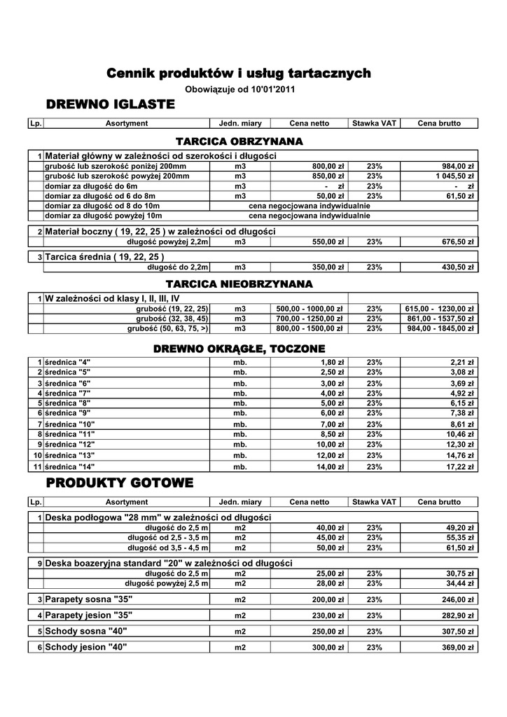 Cennik produktów i usług tartacznych DREWNO IGLASTE