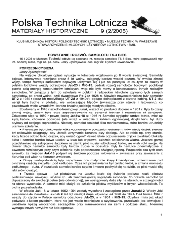Polska Technika Lotnicza MATERIAŁY HISTORYCZNE 9 (2/2005) KLUB MIŁOŚNIKÓW HISTORII POLSKIEJ TECHNIKI LOTNICZEJ • MUZEUM TECHNIKI W WARSZAWIE STOWARZYSZENIE MŁODYCH INŻYNIERÓW LOTNICTWA • SMIL POWSTANIE I ROZWÓJ SAMOLOTU TS-8 BIES 15 I 2005 w Muzeum Techniki odbyło się spotkanie nt. rozwoju samolotu TS-8 Bies, które poprowadzili mgr inż. Andrzej Glass, mgr inż. pil. dośw. Jerzy Jędrzejowski i doc. mgr inż. Ryszard Lewandowski. POPRZEDNICY BIESA Jerzy Jędrzejewski Na wstępie chciałbym opisać sytuację w lotnictwie wojskowym po II wojnie światowej. Samoloty bojowe, intensywnie rozwijane przez 5 lat wojny, osiągnęły bardzo wysoki poziom. W wyniku zimnej wojny, tempo rozwoju samolotów bojowych utrzymało się i już na początku lat 50–tych do służby w polskim lotnictwie weszły odrzutowce Jak-23 i MiG-15. Jednak rozwój samolotów bojowych pochłonął prawie całą energię konstruktorów lotniczych, więc nie było mowy o konstruowaniu innych rodzajów samolotów. W związku z tym do szkolenia w polskim i radzieckim lotnictwie używano tych samych samolotów, co przed wojną, czyli dwupłatowe Po-2 (z 1928 r). Niewiele nowocześniejsze były samoloty UT-2 z 1935 r (oraz ich modyfikacja UT-2M z 1940 r), będące dolnopłatami z otwarta kabiną. UT-2 obu wersji były trudne w pilotażu, nie wybaczające błędów (zwłaszcza przy starcie i lądowaniu), co powodowało wiele wypadków i bardzo brutalną selekcję młodych pilotów. Zbudowany w 1948 r szkolno-treningowy Junak, wszedł do produkcji dopiero w 1951 r. Były to czasy zimnej wojny, zatem było duże zapotrzebowanie na personel lotniczy i rozbudowę sił zbrojnych. Zakupiono więc w 1950 r pewną liczbę Jaków-18 (z 1946 r). Samolot wyglądał bardzo ładnie, miał już krytą kabinę, chowane podwozie (ale wciąż w układzie z kółkiem ogonowym), dzięki temu był dużo szybszy od swojego poprzednika. Niestety, samolot posiadał kilka mankamentów, które bardzo utrudniały uczniom szkolenie. ● Pierwszym było blokowanie kółka ogonowego w położeniu neutralnym, tylko wtedy drążek sterowy był całkowicie ściągnięty, aby ułatwić utrzymanie kierunku przy dobiegu. Ale co robić np. przy starcie, kiedy trzeba oddać lekko drążek, aby unieść ogon? Nawet lekkie odpuszczenie drążka zwalniało blokadę kółka i samolot bardzo łatwo uciekał w lewo lub w prawo, zależnie od kierunku wiatru. Jeszcze gorzej przedstawiało się zakręcanie Jaczkiem na ziemi: pilot musiał odblokować kółko, ale wiatr robił swoje. Na domiar złego hamulce samolotu były bardzo trudne w obsłudze. Były to hamulce pneumatyczne, z zaworem różnicowym, przy czym ciśnienie było popuszczane dźwignią ręczną. Połączenie obu tych cech sprawiło, że niejeden Jak-18 podparł się śmigłem podczas kołowania – zwłaszcza przy zawracaniu z kierunku pod wiatr na kierunek z wiatrem. ● Drugą niedogodnością były napędzane pneumatycznie klapy krokodylowe, umieszczone pod centralną częścią skrzydła i pod kadłubem. Czas ich przestawiania był bardzo krótki, a zmiana momentu podłużnego – duża. W rezultacie samolot bardzo szybko i mocno pochylał się na dziób, co pilot musiał siłą ręki zrównoważyć. ● Trzecia sprawa – już pilotażowa: na Jaczku latało się świetnie podczas nauki pilotażu podstawowego, nawigacji, szyków itp., ale znacznie gorzej wyglądała akrobacja. Co prawda, samolot był dopuszczony do akrobacji pełnej (nie odwróconej), ale występowały duże siły na sterach, w szczególności na sterze wysokości. A samolot miał służyć do szkolenia pilotów myśliwców o innych własnościach. Ta cecha przeszkadzała. W efekcie Jaki-18 w latach 1952-1954 zostały wycofane i zastąpione przez Junaki-2. Wtedy Jaki przekazano do Aeroklubu. Junak-2 też był niezbyt długo używany: od 1952 do 1954. Pod koniec 1950 r weszły do użycia w Polsce samoloty odrzutowe Jak-23, a w 1951 r MiG-15. Obydwa miały już układ podwozia z kołem przednim, które nie jest wcale trudniejsze w użytkowaniu, przeciwnie jest łatwiejsze i umożliwia lepszą widoczność, szczególnie przy manewrowania na ziemi i podczas startu. Niemniej wymaga innych nawyków niż koło ogonowe. 1 Odpowiedzią na powstałą potrzebę był samolot Junak 3 (z 1953 r). Nowy układ podwozia poprawiał znakomicie widoczność z drugiej kabiny na ziemi, na skutek obrotu jakiego dokonał kadłub. Położenie silnika się obniżyło, a położenie kabiny ucznia podniosło. Jednakże samolot wciąż był nieco za wolny do nauki przyszłych pilotów myśliwców. Oprócz Jaków-18 zakupiono też Jaki-11. Sylwetką, mocą silnika i osiągami przypominały słynny amerykański samolot North American Harvard/Texan. Jak-11 był samolotem „przejściowym” – miał wypełnić lukę pomiędzy samolotami szkolnymi a bojowymi. W czasie wojny z braku czasu nie było samolotów przejściowych, wobec tego zmuszano wytwórnie, żeby budowały wersję dwumiejscową samolotu bojowego. Przeszkalano więc na tym, co było, z kosztami nikt się nie liczył, a było to było dość drogie rozwiązanie. Samolot spotkał się z bardzo różnymi ocenami. Z jednej strony piloci, którzy dobrze latali, szczególnie na samolotach tłokowych, bardzo sobie ten samolot chwalili. Był bowiem – dla nich przynajmniej – bardzo łatwy w pilotażu, ale prawie myśliwiec: prędkość maksymalna 424 km/h, a w nurkowaniu aż 600 km/h. Jednak młodzi piloci, latający dotychczas na Po-2, Junakach czy Jakach-18, mieli zupełnie inną opinię. Samolot posiadał bowiem kilka wad, które uczniom sprawiały duże problemy: ● Podwozie klasyczne z kółkiem ogonowym, co prócz zbędnych nawyków, dawało kiepską widoczność podczas kołowania. Samolot miał bardzo duży silnik (o średnicy 1267 mm), co, w połączeniu z dużym kątem postoju sprawiało, że pilot aż do momentu uniesienia ogona nie widział nic przed sobą. ● Duża moc silnika 