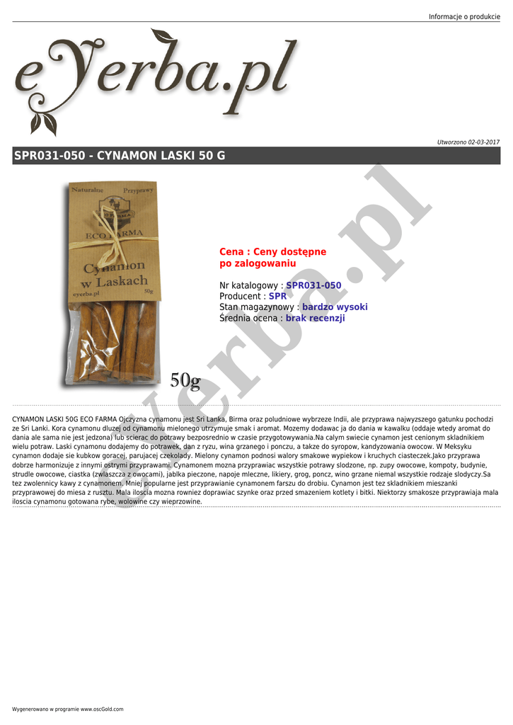 Informacje o produkcie Utworzono 02-03-2017 a. pl SPR031-050 - CYNAMON LASKI 50 G Cena : Ceny dostępne po zalogowaniu er b Nr katalogowy : SPR031-050 Producent : SPR Stan magazynowy : bardzo wysoki Średnia ocena : brak recenzji eY CYNAMON LASKI 50G ECO FARMA Ojczyzna cynamonu jest Sri Lanka, Birma oraz poludniowe wybrzeze Indii, ale przyprawa najwyzszego gatunku pochodzi ze Sri Lanki. Kora cynamonu dluzej od cynamonu mielonego utrzymuje smak i aromat. Mozemy dodawac ja do dania w kawalku (oddaje wtedy aromat do dania ale sama nie jest jedzona) lub scierac do potrawy bezposrednio w czasie przygotowywania.Na calym swiecie cynamon jest cenionym skladnikiem wielu potraw. Laski cynamonu dodajemy do potrawek, dan z ryzu, wina grzanego i ponczu, a takze do syropow, kandyzowania owocow. W Meksyku cynamon dodaje sie kubkow goracej, parujacej czekolady. Mielony cynamon podnosi walory smakowe wypiekow i kruchych ciasteczek.Jako przyprawa dobrze harmonizuje z innymi ostrymi przyprawami. Cynamonem mozna przyprawiac wszystkie potrawy slodzone, np. zupy owocowe, kompoty, budynie, strudle owocowe, ciastka (zwlaszcza z owocami), jablka pieczone, napoje mleczne, likiery, grog, poncz, wino grzane niemal wszystkie rodzaje slodyczy.Sa tez zwolennicy kawy z cynamonem. Mniej popularne jest przyprawianie cynamonem farszu do drobiu. Cynamon jest tez skladnikiem mieszanki przyprawowej do miesa z rusztu. Mala iloscia mozna rowniez doprawiac szynke oraz przed smazeniem kotlety i bitki. Niektorzy smakosze przyprawiaja mala iloscia cynamonu gotowana rybe, wolowine czy wieprzowine. Wygenerowano w programie www.oscGold.com