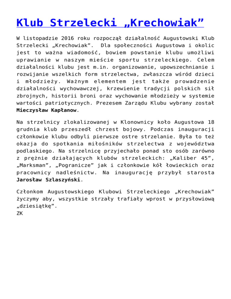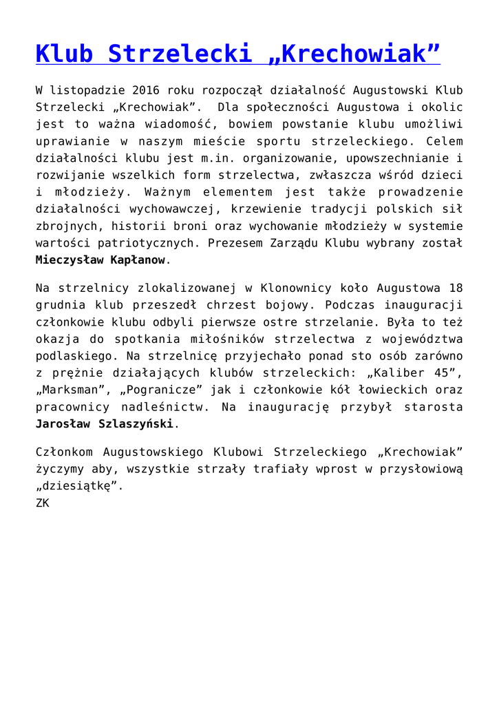 Klub Strzelecki „Krechowiak” W listopadzie 2016 roku rozpoczął działalność Augustowski Klub Strzelecki „Krechowiak”. Dla społeczności Augustowa i okolic jest to ważna wiadomość, bowiem powstanie klubu umożliwi uprawianie w naszym mieście sportu strzeleckiego. Celem działalności klubu jest m.in. organizowanie, upowszechnianie i rozwijanie wszelkich form strzelectwa, zwłaszcza wśród dzieci i młodzieży. Ważnym elementem jest także prowadzenie działalności wychowawczej, krzewienie tradycji polskich sił zbrojnych, historii broni oraz wychowanie młodzieży w systemie wartości patriotycznych. Prezesem Zarządu Klubu wybrany został Mieczysław Kapłanow. Na strzelnicy zlokalizowanej w Klonownicy koło Augustowa 18 grudnia klub przeszedł chrzest bojowy. Podczas inauguracji członkowie klubu odbyli pierwsze ostre strzelanie. Była to też okazja do spotkania miłośników strzelectwa z województwa podlaskiego. Na strzelnicę przyjechało ponad sto osób zarówno z prężnie działających klubów strzeleckich: „Kaliber 45”, „Marksman”, „Pogranicze” jak i członkowie kół łowieckich oraz pracownicy nadleśnictw. Na inaugurację przybył starosta Jarosław Szlaszyński. Członkom Augustowskiego Klubowi Strzeleckiego „Krechowiak” życzymy aby, wszystkie strzały trafiały wprost w przysłowiową „dziesiątkę”. ZK Klub Strzelecki „Krechowiak” – Fot. Jacek Kożańczuk
