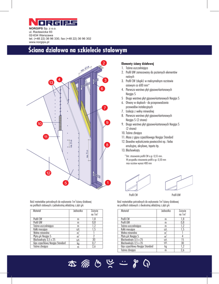 NORGIPS Sp. z o.o. ul. Racławicka 93 02-634 Warszawa tel. (+48 22) 36 96 330, fax (+48 22) 36 96 302 www.norgips.pl Ściana działowa na szkielecie stalowym Elementy ściany działowej 1. Taśma uszczelniająca 2. Profil UW zamocowany do poziomych elementów nośnych 3. Profil CW (słupki) w maksymalnym rozstawie osiowym co 600 mm* 4. Pierwsza warstwa płyt gipsowo-kartonowych Norgips S 5 Druga warstwa płyt gipsowo-kartonowych Norgips S 6. Otwory w słupkach - do przeprowadzania przewodów instalacyjnych 7. Izolacja z wełny mineralnej 8. Pierwsza warstwa płyt gipsowo-kartonowych Norgips S (2 strona) 9. Druga warstwa płyt gipsowo-kartonowych Norgips S (2 strona) 10. Taśma zbrojąca 11. Masa z gipsu szpachlowego Norgips Standard 12. Dowolne wykończenie powierzchni np.: farba emulsyjna, akrylowa, tapeta itp. 13. Blachowkręty * Dot. stosowania profili CW o gr. 0,55 mm. W przypadku stosowania profili o gr. 0,50 mm max rozstaw wynosi 400 mm Profil CW Ilość materiałów potrzebnych do wykonania 1m2 ściany działowej na profilach stalowych z jednokrotną okładziną z płyt g-k Materiał Profil CW Profil UW Taśma uszczelniająca Kołki mocujące Wełna mineralna Płyta g-k Norgips S Blachowkręty 3,5 x 25 Gips szpachlowy Norgips Standard Taśma zbrojąca Jednostka m m m szt. m2 m2 szt. kg m Zużycie na 1m2 1,8 0,8 1,2 1,5 1 2 30 0,7 2,6 Profil UW Ilość materiałów potrzebnych do wykonania 1m2 ściany działowej na profilach stalowych z dwukrotną okładziną z płyt g-k Materiał Profil CW Profil UW Taśma uszczelniająca Kołki mocujące Wełna mineralna Płyta g-k Norgips S Blachowkręty 3,5 x 25 Blachowkręty 3,5 x 35 Gips szpachlowy Norgips Standard Taśma zbrojąca Jednostka m m m szt. m2 m2 szt. szt. kg m Zużycie 2 na 1m 1,8 0,8 1,2 1,5 1 4 15 30 1,2 2,6