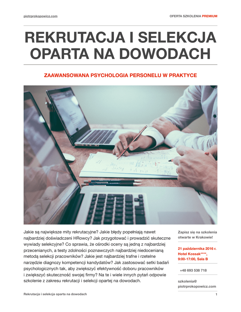 piotrprokopowicz.com OFERTA SZKOLENIA PREMIUM REKRUTACJA I SELEKCJA OPARTA NA DOWODACH ZAAWANSOWANA PSYCHOLOGIA PERSONELU W PRAKTYCE Jakie są największe mity rekrutacyjne? Jakie błędy popełniają nawet najbardziej doświadczeni HRowcy? Jak przygotować i prowadzić skuteczne wywiady selekcyjne? Co sprawia, że ośrodki oceny są jedną z najbardziej przecenianych, a testy zdolności poznawczych najbardziej niedocenianą metodą selekcji pracowników? Jakie jest najbardziej trafne i rzetelne narzędzie diagnozy kompetencji kandydatów? Jak zastosować setki badań psychologicznych tak, aby zwiększyć efektywność doboru pracowników i zwiększyć skuteczność swojej firmy? Na te i wiele innych pytań odpowie szkolenie z zakresu rekrutacji i selekcji opartej na dowodach. Rekrutacja i selekcja oparta na dowodach Zapisz się na szkolenia otwarte w Krakowie! 21 października 2016 r. Hotel Kossak****, 9:00-17:00, Sala B +48 693 538 718 szkolenia@ piotrprokopowicz.com 1 piotrprokopowicz.com OFERTA SZKOLENIA PREMIUM Szkolenie nakierowane jest na szybkie i skuteczne zapoznanie uczestników z zaawansowanymi technikami rekrutacji i selekcji w oparciu o najnowsze badania naukowe z zakresu psychologii personelu. W trakcie szkolenia wykorzystane zostaną wyniki badań (głównie z lat 2000-2016) obrazujące najnowsze trendy w psychologii organizacji i praktyce rekrutacji i selekcji pracowników. Uczestnicy szkoleń: • poznają zasady skutecznej analizy pracy oraz rolę osobowości i zdolności poznawczych w osiąganiu sukcesu zawodowego; • nauczą się określać, rozróżniać i mierzyć różnego typu efektywność pracy; • nabędą rzetelną wiedzę na temat naukowych mechanizmów efektywnej rekrutacji i selekcji; • nauczą się stosować w praktyce badania nad skutecznością narzędzi rekrutacji i selekcji w zależności od grupy docelowej. Szkolenie przeznaczone jest dla specjalistów ds. personelu, pracowników firm “Połączenie badań naukowych z praktyką, podane w przystępnej i uporządkowanej formie. - ŁUKASZ SOWIŃSKI, DYREKTOR PERSONALNY, CAPITAL SERVICE SA, TOP HR MANAGER 2016, O „REKRUTACJI I SELEKCJI OPARTEJ NA DOWODACH” rekrutacyjnych, niezależnych rekruterów, head hunterów oraz menedżerów pragnących rozszerzyć swoją wiedzę i umiejętności dotyczące zaawansowanych podstaw naukowych skutecznej rekrutacji i selekcji pracowników. Pakiet szkoleniowy zawiera: 8 godzin szkoleniowych, materiały szkoleniowe, książkę „Rekrutacja i selekcja oparta na dowodach”, nieograniczone przerwy kawowe z przekąskami oraz lunch. Zapisz się na szkolenia do 30.08 i otrzymaj dodatkowo bon o wartości 350 PLN na 1h konsultacji w swojej firmie. Rekrutacja i selekcja oparta na dowodach “Rekrutacja i selekcja oparta na dowodach. 33 zasady skutecznego naboru pracowników” Piotr Prokopowicz, Wolters Kluwer, 2016; książka dołączana bezpłatnie do materiałów szkoleniowych Cena promocyjna za jedną osobę: 1499 PLN + VAT Cena za drugą / kolejne osoby z firmy: 1299 PLN + VAT Rabat za polecenie kolejnej osoby (referral): 200 PLN 2 piotrprokopowicz.com OFERTA SZKOLENIA PREMIUM Ramowy program szkolenia 1. Rekrutacja i selekcja – nauka czy sztuka, czyli co tak naprawdę mówi nam pytanie o okrągłość studni kanalizacyjnych? Czy dzięki dobrym narzędziom i procedurom naukowym każdy może zostać dobrym menedżerem personalnym? Co ma do powiedzenia psychologia na temat rekrutacji i selekcji pracowników i dlaczego nikt o tym nie mówi głośno? Intuicja czy badania – czym lepiej kierować się w trakcie podejmowania decyzji selekcyjnych i jakie są tego konsekwencje? Jakie są najtańsze, najtrafniejsze i najrzetelniejsze metody rekrutacji i selekcji i dlaczego tak mało ludzi zdaje sobie z tego sprawę? 2. Analiza pracy jako podstawa skuteczności procesu rekrutacji, selekcji i rozwoju, czyli dlaczego niepotrzebnie ekscytujemy się modelem kompetencyjnym? Czym jest trafność i rzetelność narzędzi w rekrutacji i selekcji? Na czym polega profesjonalna analiza pracy? Kim są eksperci w analizie pracy, jak obserwować i jak rozmawiać z ekspertami? Czym różni się efektywność zadaniowa od efektywności kontekstualnej, jak je rozróżnić, jak je mierzyć i czy jest sens mierzyć cokolwiek poza oceną przełożonego? Rekrutacja i selekcja oparta na dowodach 3 piotrprokopowicz.com OFERTA SZKOLENIA PREMIUM 3. Rekrutacja i screening – fakty i mity, czyli czego tak naprawdę powinniśmy wymagać od pracowników? “(…) nie ma zmiłuj – trzeba się skonfrontować z brakami w wiedzy, ograniczającymi przekonaniami na temat rekrutacji. Polecam! Jak rekrutuje Google i dlaczego nie zawsze warto wzorować się na najlepszych? Czy to jak kandydaci szukają pracy i to jak ją znajdują różni się i jakie z tego wynikają konsekwencje dla rekrutacji? Co tak naprawdę przyciąga kandydatów do pracy i jak powinno to wpływać na treść i formę ogłoszenia rekrutacyjnego? Jaka jest efektywność różnych kanałów i źródeł rekrutacji? - MAJA CHABIŃSKAROSSAKOWSKA, VP HR & COMMUNICATION DHL EXPRESS, HR INFLUENCERS O „REKRUTACJI I SELEKCJI OPARTEJ NA DOWODACH” Jak rozpoznać dobre testy w rekrutacji i selekcji? Czy potrzebujemy czegokolwiek poza inteligencją? Dlaczego wywiad rekrutacyjny jest najczęściej i najgorzej używanym narzędziem w selekcji pracowników? Jakie są teoretyczne i praktyczne podstawy przygotowania i zastosowania testów sytuacyjnych? 4. „Wielka Trójka”: Testy inteligencji, wywiady i testy sytuacyjne, czyli jak dobrać, przygotować i wdrożyć odpowiednie i efektywne narzędzie selekcji pracowników? 5. Inne metody selekcji, czyli jaką wartość mają najczęściej stosowane narzędzia z repertuaru specjalistów HR? Testy osobowości – czy wszyscy musimy być sumienni? Testy inteligencji emocjonalnej jako przykład testu rekrutacyjnego opartego na efektowności, nie efektywności. Testy integralności osobistej w rekrutacj