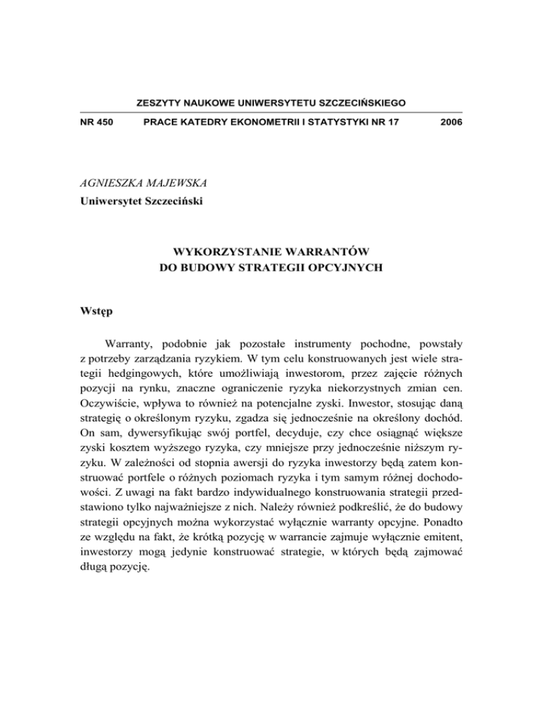 ZESZYTY NAUKOWE UNIWERSYTETU SZCZECIŃSKIEGO NR 450 PRACE KATEDRY EKONOMETRII I STATYSTYKI NR 17 2006 AGNIESZKA MAJEWSKA Uniwersytet Szczeciński WYKORZYSTANIE WARRANTÓW DO BUDOWY STRATEGII OPCYJNYCH Wstęp Warranty, podobnie jak pozostałe instrumenty pochodne, powstały z potrzeby zarządzania ryzykiem. W tym celu konstruowanych jest wiele strategii hedgingowych, które umoŜliwiają inwestorom, przez zajęcie róŜnych pozycji na rynku, znaczne ograniczenie ryzyka niekorzystnych zmian cen. Oczywiście, wpływa to równieŜ na potencjalne zyski. Inwestor, stosując daną strategię o określonym ryzyku, zgadza się jednocześnie na określony dochód. On sam, dywersyfikując swój portfel, decyduje, czy chce osiągnąć większe zyski kosztem wyŜszego ryzyka, czy mniejsze przy jednocześnie niŜszym ryzyku. W zaleŜności od stopnia awersji do ryzyka inwestorzy będą zatem konstruować portfele o róŜnych poziomach ryzyka i tym samym róŜnej dochodowości. Z uwagi na fakt bardzo indywidualnego konstruowania strategii przedstawiono tylko najwaŜniejsze z nich. NaleŜy równieŜ podkreślić, Ŝe do budowy strategii opcyjnych moŜna wykorzystać wyłącznie warranty opcyjne. Ponadto ze względu na fakt, Ŝe krótką pozycję w warrancie zajmuje wyłącznie emitent, inwestorzy mogą jedynie konstruować strategie, w których będą zajmować długą pozycję. 358 Agnieszka Majewska 1. Strategie proste Strategie proste polegają na zakupie lub sprzedaŜy danego typu warrantu. WiąŜą się one z pozycjami zajmowanymi w kontraktach opcyjnych, w których zawsze uczestniczą dwie strony: nabywca opcji, który zajmuje pozycję długą, oraz sprzedawca opcji, który zajmuje pozycję krótką. W związku z tym moŜna wyróŜnić cztery rodzaje pozycji, którym odpowiadają cztery rodzaje strategii: – długa pozycja w warrantach kupna – strategia long call, – długa pozycja w warrantach sprzedaŜy – strategia long put, – krótka pozycja w warrantach kupna – strategia short call, – krótka pozycja w warrantach sprzedaŜy – strategia short put. Dwie pierwsze stosowane są przez osoby wykorzystujące warranty jako jeden z rodzajów inwestycji, dwie ostatnie – przez emitentów. W przedstawionych poniŜej przykładach zastosowano następujące oznaczenia: XC – cena wykonania warrantu kupna, XP – cena wykonania warrantu sprzedaŜy, c – cena warrantu kupna, p – cena warrantu sprzedaŜy. Strategia long call Strategia ta polega na zakupie warrantu kupna, czyli zajęciu długiej pozycji na rynku warrantów opcyjnych. Jest stosowana wówczas, gdy inwestor ma nadzieję na wzrost cen na rynku. Zysk jest potencjalnie nieograniczony i rośnie wraz ze wzrostem cen na rynku. Punkt, powyŜej którego inwestor zaczyna odnosić zyski (tzw. break even point), wyznaczony jest przez następujące wyraŜenie: cena wykonania warrantu (XC) + zapłacona premia (c). Wykorzystanie warrantów do budowy strategii opcyjnych 359 Straty są ograniczone do wysokości zapłaconej premii. Maksymalne straty ponosi się zatem wówczas, gdy cena na rynku jest mniejsza lub równa cenie wykonania warrantu. Zysk w zaleŜności od ceny akcji osiągany przez zastosowanie strategii long call przedstawiono na rysunku 1. Zakup jednego warrantu call (XC = 100, c = 8) Koszt (maks. strata): c=8 Zysk (zł) 8 Punkt rentowności: XC + c = 108 Zysk jest osiągany, wówczas, wówczas gdy: X∈(108, ∞) Straty są ponoszone wówczas, 100 108 0 Cena akcji (zł) -8 gdy: X ∈(0, 108) Rys. 1. Zysk w strategii long call Źródło: opracowanie własne. Strategia long put Strategia ta polega na zakupie warrantów sprzedaŜy. Jest stosowana wówczas, gdy inwestor uwaŜa, Ŝe wzrost ceny na rynku jest raczej wątpliwy. Zysk jest potencjalnie nieograniczony i rośnie wraz ze spadkiem cen na rynku. Punkt, powyŜej którego inwestor zaczyna odnosić zyski (tzw. break even point), jest równy: cena wykonania warrantu (XP) – zapłacona premia (p). 360 Agnieszka Majewska Zakup jednego warrantu put (XP = 103, p = 5) Koszt (maks. strata): p=5 Zysk (zł) 5 Punkt rentowności: XP – p = 98 Zysk jest osiągany wówczas, 98 Cena akcji (zł) gdy: X∈ (0, 98) Straty są ponoszone wówczas, gdy: X ∈ (98, ∞) 103 0 -5 Rys. 2. Zysk w strategii long put Źródło: opracowanie własne. Straty są ograniczone do wysokości zapłaconej premii. Maksymalne straty ponosi się zatem wtedy, gdy cena na rynku jest większa lub równa kursowi warrantu. Zysk w zaleŜności od ceny akcji przedstawiono na rysunku 2. Przykład ten pokazuje, Ŝe kupno warrantu sprzedaŜy zapewnia pewną minimalną cenę sprzedaŜy, a jednocześnie umoŜliwia zarobienie na korzystnych ruchach cen. Strata jest równieŜ ograniczona do ceny, jaką płaci się za warrant, powiększonej o dodatkowo występujące koszty transakcyjne. Strategie short call i short put, polegające na sprzedaŜy odpowiednio warrantu kupna i sprzedaŜy, są przeciwieństwem przedstawionych strategii long call i long put. Sprzedający zyskuje bowiem tyle, ile traci kupujący, i na odwrót. NaleŜy jednak pamiętać o tym, Ŝe w przypadku warrantów, podobnie jak opcji, straty sprzedawcy są potencjalnie nieograniczone (w przypadku nabywcy – zyski), natomiast zysk ogranicza się do wysokości otrzymanej premii, która z kolei stanowi koszt dla kupującego. Zysk osiągany w strategii short call i short put przedstawiono na rysunkach 3 i 4. Wykorzystanie warrantów do budowy strategii opcyjnych SprzedaŜ: jednego warranta call (XC = 100, c = 8) Zysk (zł) Przychód (maks. zysk): c=8 8 Punkt rentowności: XC + c = 108 100 108 0 Zysk jest osiągany wówczas, gdy: Cena akcji (zł) X ∈ (0, 108) -8 Straty są ponoszone wówczas, gdy: X ∈ (108, ∞) Rys. 3. Zysk w strategii short call Źródło: opracowanie własne. SprzedaŜ jednego warrantu put (XP = 103, p = 5) Przychód (maks. zysk): p = 5 Punkt rentowności: XP – p = 98 Zysk jest osiągany wówczas, gdy: X ∈ (98, ∞) Zysk (zł) 5 98 103 0 Ce
