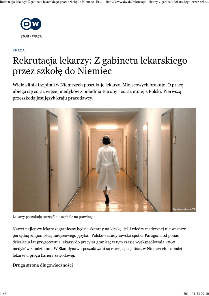 Rekrutacja lekarzy: Z gabinetu lekarskiego przez szkołę do Niemiec | Pr... 1z5 http://www.dw.de/rekrutacja-lekarzy-z-gabinetu-lekarskiego-przez-szko... START / PRACA PR AC A Rekrutacja lekarzy: Z gabinetu lekarskiego przez szkołę do Niemiec Wiele klinik i szpitali w Niemczech poszukuje lekarzy. Miejscowych brakuje. O pracę ubiega się coraz więcej medyków z południa Europy i coraz mniej z Polski. Pierwszą przeszkodą jest język kraju pracodawcy. Lekarzy poszukują szczególnie szpitale na prowincji Nawet najlepszy lekarz zagraniczny będzie skazany na klęskę, jeśli wiedzy medycznej nie wesprze porządną znajomością miejscowego języka. Polsko-skandynawska spółka Paragona od ponad dziesięciu lat przygotowuje lekarzy do pracy za granicą; w tym czasie wyekspediowała 2000 medyków z rodzinami. W Skandynawii poszukiwani są raczej specjaliści, w Niemczech - młodzi lekarze u progu kariery zawodowej. Druga strona długowieczności 2014-01-23 09:10 Rekrutacja lekarzy: Z gabinetu lekarskiego przez szkołę do Niemiec | Pr... 2z5 http://www.dw.de/rekrutacja-lekarzy-z-gabinetu-lekarskiego-przez-szko... Wszędzie działa podobny mechanizm samonapędzający: im dłużej żyjemy – a dłużej żyjemy głównie dzięki rozwojowi medycyny – tym większe jest zapotrzebowanie na opiekę lekarską. – Dziś, w Europie Zachodniej – zauważa prezes zarządu Paragony Adam Ringer - ostatni rok życia pacjenta kosztuje 25 proc. ogółu wydatków medycznych, Przez 3 miesiące sala lekcyjna zastępuje gabinet lekarski poniesionych w ciągu jego całego życia. Specjalizacje, najczęściej oferowane młodym lekarzom zagranicznym, po podjęciu pracy w Niemczech, wiążą się z reguły z konsekwencjami starzenia się społeczeństwa. Szefowa projektu niemieckiego Paragony, Zuzanna Jendryczko, wymienia na pierwszym miejscu geriatrię, choroby wewnętrzne, neurologię i ortopedię. Lekarzy z zagranicy rekrutują niemal wyłącznie szpitale na niemieckiej prowincji, w miastach 40-tysięcznych lub podobnej wielkości. Na starcie pensja rezydenta wynosi plus minus 4000 euro, ale w stosunkowo krótkim czasie podnoszą ją gratyfikacje za dyżury, mówi pani Jendryczko. A prezes Ringer wskazuje na podobieństwo z niewielkimi klubami piłkarskimi, które szybko tracą dobrze wyszkolonych graczy. W tym przypadku, po zdobyciu drugiego stopnia specjalizacji lekarze z małych ośrodków śpiesznie przenoszą się do Hamburga, Monachium, Berlina. Na prowincji trwają poszukiwania następców… Lingwistyka i medycyna Zanim przeniosą się za granicę, kandydaci w białych fartuchach wracają do szkolnych ławek. W Niemczech i innych krajach wymagana jest znajomość języka na poziomie przynajmniej B2. Jest to nieco wyższy aniżeli średni stopień w skali unijnej. Dolina to A1 (powiedzmy, poziom rozmowy towarzyskiej), natomiast szczyt to C2 (native academic, jak ogólnie przyjęty, angielski termin nazywa wierzchołek wiedzy językowej). Do Kandydatów wyróżnia z reguły młody wiek tego dochodzi i ważny przedmiot uzupełniający: terminologia medyczna i procedury, specyfika służby zdrowia w danym kraju. Dyplomy uczelni medycznych państw UE są wprawdzie powszechnie uznawane w tym obszarze, ale to ułatwia jedynie sprawę, całkowicie jej przecież nie rozwiązuje. Kandydaci do pracy w klinikach Danii, Szwecji lub Norwegii nie muszą w ogóle znać języków skandynawskich na starcie. Wiadomo, nie są to języki światowe. W rezultacie nauka trwa dłużej. Zanim staną twarz w twarz z nauczycielem, przez 2 miesiące ludzie ci pobierają wstępne nauki online. Skype jest nieoceniony. A potem, jak kandydaci na Niemcy, przez 3 miesiące wkuwają w 2014-01-23 09:10 Rekrutacja lekarzy: Z gabinetu lekarskiego przez szkołę do Niemiec | Pr... 3z5 http://www.dw.de/rekrutacja-lekarzy-z-gabinetu-lekarskiego-przez-szko... warszawskiej szkole Paragony. Codziennie, od 8.00 do 17.00! Uff… Na koniec egzamin w Instytucie Goethego i certyfikat ze stopniem B2. Lekarze-uczniowie mieszkają na campusie Paragony. Uprzednio firma zweryfikowała ich dokumenty, sprawdziła, czy nie byli karani za błędy w sztuce medycznej i zapewniła tłumaczenia ich papierów. Dla partnerów z Republiki Federalnej w grę wchodzą wyłącznie niemieccy tłumacze przysięgli. W sumie, koszty tak pomyślanej rekrutacji są niebagatelne, wynoszą 16 000 – 17 000 euro na osobę. Polacy w odwrocie, Grecy atakują - Nie, te wydatki nie obciążają kandydatów. Przeciwnie, w okresie nauki otrzymują stypendia, rekompensatę utraconych zarobków - wyjaśnia prezes Ringer. I dodaje: Obciążanie kandydatów kosztami byłoby nieetyczne. Wynikiem stosowania innych zasad i forsowania tempa są szybkie rozstania szpitali z nieprzygotowanymi profesjonalnie Zuzanna Jendryczko i Adam Ringer przygotowują się do kandydatami. Albo status praktykanta dla rozmów z nowym partnerem niemieckim zagranicznego lekarza, który nie jest w stanie porozumieć się w pełni z niemieckim pacjentem. Zuzanna Jendryczko dorzuca, że wynagrodzenie praktykanta wynosi 400 euro. Za kurs, tłumaczenia, sprawdziany płaci przyszły pracodawca. Inwestycja jest opłacalna. Statystyki dowodzą, że 95 proc. pozyskanych tą drogą lekarzy na lata przywiązuje się do nowego miejsca pracy i zamieszkania. Awanse umacniają więzi. Z obserwacji Paragony wynika, że żaden paszport nie hamuje drogi ku górze. Jasne, nie samą pracą człowiek żyje. Jeszcze zanim lekarz rozpocznie wspinaczkę ku B2, udaje się tam, gdzie ewentualnie ma podjąć pracę. Poznaje szpital, przełożonych, warunki życia w miejscowości, w której przyjdzie mu – lub nie – zamieszkać. Jeśli gra muzyka, zainteresowani podpisują umowę wstępną. No i trzeba wkuwać… Już nie takie kokosy D W.D E Dobrych kilka lat temu Paragona wysyłała za granicę głównie polskich lekarzy. Dziś stanowią zdecydowaną mniejszość. Deficyt lekarzy w Niemczech. Niemcy liczą na Polaków W wielu nie