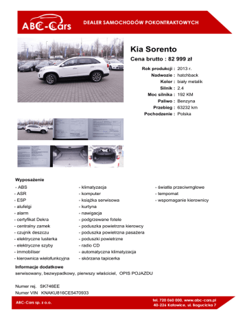 Kia Sorento Cena brutto : 82 999 zł Rok produkcji : 2013 r. Nadwozie : hatchback Kolor : biały metalik Silnik : 2.4 Moc silnika : 192 KM Paliwo : Benzyna Przebieg : 63232 km Pochodzenie : Polska Wyposażenie - ABS - klimatyzacja - światła przeciwmgłowe - ASR - komputer - tempomat - ESP - książka serwisowa - wspomaganie kierownicy - alufelgi - kurtyna - alarm - nawigacja - certyfikat Dekra - podgrzewane fotele - centralny zamek - poduszka powietrzna kierowcy - czujnik deszczu - poduszka powietrzna pasażera - elektryczne lusterka - poduszki powietrzne - elektryczne szyby - radio CD - immobiliser - automatyczna klimatyzacja - kierownica wielofunkcyjna - skórzana tapicerka Informacje dodatkowe serwisowany, bezwypadkowy, pierwszy właściciel, OPIS POJAZDU Numer rej. SK746EE Numer VIN KNAKU816CE5470933 Datę 1. rej. 08-11-2013 Historia pojazdu dostępna jest w bezpłatnym raporcie z Centralnej Ewidencji Pojazdów pod adresem: https://historiapojazdu.gov.pl Wszelkich informacji na temat pojazdu udzielą handlowcy pod numerem telefonu:(+ 48 720-060-000) Wszystkie oferowane przez Nas auta, - pochodzą z krajowej sieci dealerskiej, - są serwisowane w autoryzowanych stacjach obsługi, - w bieżącej ofercie handlowej oferujemy ponad 100 używanych samochodów o udokumentowanej historii napraw i przeglądów, - w stałej ofercie posiadamy pełny wybór aut, zarówno pod względem marek, modeli, jak i przebiegów, - z możliwością zakupu za gotówkę lub w leasing, - z możliwością finansowania z Pakietem serwisowo-gwarancyjnym - z możliwością odliczenia VAT ( pełna faktura VAT). Firma ABC-CARS Sp. z o.o., to prężnie rozwijający się, dealer samochodów używanych na terenie Górnego Śląska. Zapraszamy do odwiedzenia Naszej strony internetowej Master1.otomoto.pl. Jesteśmy tak pewni naszych samochodów, że naszym klientom gwarantujemy ich ponowne nabycie jeśli zdecydują się ponownie skorzystać z naszych usług. Co oznacza, że posiadamy centrum samochodowe? U nas można nie tylko kupić samochód. Oferujemy pomoc w kredycie, leasingu i ubezpieczeniu, doposażenie auta w interesujące ich akcesoria już w momencie zakupu, bieżącą obsługę serwisową oraz likwidowanie szkód komunikacyjnych. Zapraszamy do naszego centrum samochodowego w Katowicach na ulicy Bogucickiej 7. Niniejsze ogłoszenie jest wyłącznie informacją handlową i nie stanowi oferty w myśl art. 66, § 1. Kodeksu Cywilnego. Sprzedający nie odpowiada za ewentualne błędy lub nieaktualność ogłoszenia.