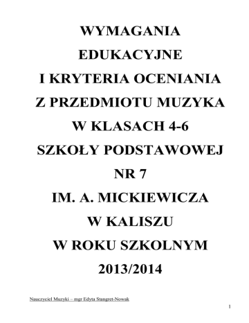 WYMAGANIA EDUKACYJNE I KRYTERIA OCENIANIA Z PRZEDMIOTU MUZYKA W KLASACH 4-6 SZKOŁY PODSTAWOWEJ NR 7 IM. A. MICKIEWICZA W KALISZU W ROKU SZKOLNYM 2013/2014 Nauczyciel Muzyki – mgr Edyta Stangret-Nowak 1 Wymagania edukacyjne i kryteria oceniania powinny uwzględniać różnorodność uzdolnień muzycznych uczniów. W ocenie należy w równym stopniu brać pod uwagę stosunek do przedmiotu, posiadaną wiedzę i umiejętności, jak i indywidualne osiągnięcia artystyczne. Nie należy oceną dyskryminować uczniów o mniejszych zdolnościach muzycznych. Komentarz do podstawy programowej Muzyka, II etap edukacyjny klasy IV-VI Bieżącej ocenie podlegają : przygotowania ucznia do zajęć, uczestnictwo w zajęciach, zaangażowanie ucznia w działania plastyczno-muzyczne, umiejętność formułowania problemów, wyciągania wniosków oraz poszukiwania własnych rozwiązań Ocenianie bieżące powinno być dokonywane poprzez : kartkówki (z trzech ostatnich lekcji) – bez zapowiedzi ćwiczenia muzyczne ( rytmiczne, metodyczne, słuchowe, ruchowe ), działania muzyczne ( śpiew, gra na instrumentach, ekspresja muzyczno- ruchowa ) , quizy i konkursy wewnątrzklasowe odpowiedź ustną ( znajomość podstawowych terminów plastycznych i muzycznych, wiadomości o epokach i stylach w plastyce i muzyce oraz o wybitnych przedstawicielach świata artystycznego i ich wybranych dziełach ) , pracę domową ( referaty, notatki ), wykonanie pracy wymagającej dłuższego czasu realizacji ( np. tworzenie szkolnej lub klasowej galerii, okazjonalnego programu artystycznego ) . Ocena śródroczna powinna być wystawiona z uwzględnieniem kryteriów wewnątrzszkolnego i przedmiotowego systemu nauczania . Musi odzwierciedlać postawę ucznia wobec przedmiotu i wykonywanych zadań oraz wysiłek, jaki uczeń wkłada w ich realizację . Powinna być wykładnikiem osiągniętych umiejętności, poziomu uzyskanej wiedzy w danym okresie oraz motywować i zachęcać ucznia do rozwijania zainteresowań muzycznych . Ocena roczna musi uwzględniać wiedzę oraz umiejętności ucznia zdobyte i utrwalone w ciągu całego roku . Podobnie jak ocena okresowa powinna uwzględniać zapisy, które 2 wynikają z wewnątrzszkolnego i przedmiotowego systemu oceniania . Oceny bieżące, śródroczne oraz roczne oceny klasyfikacyjne z zajęć edukacyjnych, począwszy od klasy czwartej szkoły podstawowej ustala się w stopniach według następującej skali: a) stopień celujący - 6, b) stopień bardzo dobry - 5, c) stopień dobry - 4, d) stopień dostateczny - 3, e) stopień dopuszczający - 2, f) stopień niedostateczny - 1. Ocenę celujący otrzymuje uczeń, który spełnia wszystkie wymagania na ocenę bardzo dobrą, a także: - szczególnie interesuje się muzyką, posiada rozszerzone wiadomości z zakresu wiedzy o muzyce oraz umiejętności twórcze z zakresu tworzenia i ekspresji muzycznej, - ma wzorowo zorganizowany warsztat pracy, - wyróżnia się aktywnością na lekcjach, - rozwija indywidualne uzdolnienia artystyczne i zainteresowania muzyczne na zajęciach pozalekcyjnych, np. w zespole wokalnym, zespole instrumentalnym, zespole tanecznym, sprawnie posługuje się zdobytymi wiadomościami w praktycznych i teoretycznych zadaniach muzycznych, proponuje rozwiązania oryginalne i wykraczające poza materiał programowy, prezentuje swoje umiejętności muzyczne w szkolnych i lokalnych uroczystościach, akademiach, imprezach artystycznych, - - reprezentuje szkołę w konkursach muzycznych, uczestniczy w życiu kulturalnym poprzez udział w koncertach i spektaklach muzycznych. Ocenę bardzo dobry otrzymuje uczeń, który opanował na wysokim poziomie zakres wiedzy i umiejętności określony programem nauczania muzyki, ponadto: - posługuje się w szerokim zakresie zdobytymi wiadomościami w praktycznych i teoretycznych zadaniach muzycznych, - realizuje pomysły muzyczne rozwijając, własne uzdolnienia i zainteresowania muzyczne, ma bardzo dobrze zorganizowany warsztat pracy, - wykazuje dużą aktywność na lekcji, - starannie wykonuje ćwiczenia praktyczne, bardzo dobrze wywiązuje się z powierzonych zadań, potrafi bronić swoich poglądów i własną twórczą postawę, jest zawsze przygotowany do zajęć. - - Ocenę dobry otrzymuje uczeń, który opanował zakres wiedzy w stopniu dobrym, a także: - potrafi wykorzystać zdobyte wiadomości i umiejętności w ćwiczeniach i zadaniach muzycznych, - stara się wywiązywać ze swoich obowiązków, - ma dobrze zorganizowany warsztat pracy, 3 - samodzielnie rozwiązuje typowe zadania praktyczne i teoretyczne, pracuje systematycznie i efektywnie (indywidualnie i w zespole), poprawnie formułuje wnioski, dobrze wywiązuje się z powierzonych zadań, bierze czynny udział w zajęciach lekcyjnych. Ocenę dostateczny otrzymuje uczeń, który częściowo opanował zakres wiedzy i umiejętności określony programem nauczania muzyki oraz: - najczęściej uzyskuje dostateczne oceny cząstkowe, - wykonuje typowe ćwiczenia i zadania muzyczne o średnim stopniu trudności, często z pomocą nauczyciela, - nie pracuje systematycznie, - rzadko uczestniczy w dyskusjach i pracach zespołowo-grupowych, - przejawia niezdecydowanie i powściągliwość w działaniach muzycznych, - ma słabo zorganizowany warsztat pracy. Ocenę dopuszczający otrzymuje uczeń, który na poziomie elementarnym opanował zakres wiedzy i umiejętności określony programem nauczania muzyki, a także: - z pomocą nauczyciela realizuje ćwiczenia i zadania muzyczne o łatwym stopniu trudności, - nie potrafi samodzielnie wykonać działań w poszczególnych formach aktywności, - nie pracuje systematycznie, - niestarannie wykonuje ćwiczenia, - niechętnie podejmuje działania muzyczne, - biernie uczestniczy w zajęciach, - trudno organizuje swój warsztat pracy, - nie wywiązuje się z obowiązków i powierzonych zadań. Ocenę niedostateczny otrzymuje uczeń, który nie opanował minimum wiadomości określonych p