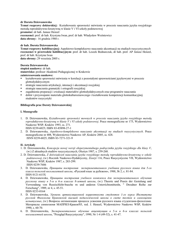 dr Dorota Dziewanowska Temat rozprawy doktorskiej: Kształtowanie sprawności mówienia w procesie nauczania języka rosyjskiego metodą reproduktywno-kreatywną w klasie V i VI szkoły podstawowej promotor: dr hab. Janusz Henzel recenzenci: prof. dr hab. Krystyna Iwan, prof. dr hab. Władysław Woźniewicz data obrony: 16 grudnia 1988 r. dr hab. Dorota Dziewanowska Temat rozprawy habilitacyjnej: Aspektowo-kompleksowe nauczanie akcentuacji na studiach rusycystycznych recenzenci w przewodzie habilitacyjnym: prof. dr hab. Leszek Bednarczuk, dr hab. prof. AP Janusz Henzel, prof. dr hab. Krystyna Iwan data obrony: 29 września 2005 r. Dorota Dziewanowska stopień naukowy: dr hab. stanowisko: profesor Akademii Pedagogicznej w Krakowie zainteresowania naukowe: kształtowanie sprawności mówienia w korelacji z pozostałymi sprawnościami językowymi w procesie glottodydaktycznym strategie nauczania artykulacji, intonacji i akcentuacji rosyjskiej strategie nauczania gramatyki i ortografii rosyjskiej zagadnienia preparacji i ewaluacji materiałów glottodydaktycznych oraz programów nauczania dobór i przyswajanie materiału glottokulturoznawczego i kształtowanie kompetencji komunikacyjnej studentów rusycystyki Bibliografia prac Doroty Dziewanowskiej I. Monografie 1. 2. D. Dziewanowska, Kształtowanie sprawności mownych w procesie nauczania języka rosyjskiego metodą reproduktywno-kreatywną w klasie V i VI szkoły podstawowej. Prace monograficzne nr 175, Wydawnictwo Naukowe WSP, Kraków 1993, ss. 271. ISSN 0239-6025; ISBN 83-85898-27-1 D. Dziewanowska, Aspektowo-kompleksowe nauczanie akcentuacji na studiach rusycystycznych. Prace monograficzne nr 408, Wydawnictwo Naukowe AP, Kraków 2005, ss. 428. ISNN 0239-6025; ISBN 83-7271-321-9 II. Artykuły 1. D. Dziewanowska, Koncepcja nowej wersji eksperymentalnego podręcznika języka rosyjskiego dla klasy V, (w:) Z aktualnych studiów rusycystycznych, Olsztyn 1987, s. 259-268. 2. D. Dziewanowska, Z doświadczeń nauczania języka rosyjskiego metodą reproduktywno-kreatywną w szkole podstawowej, (w:) Rocznik Naukowo-Dydaktyczny, Zeszyt 116, Prace Rusycystyczne VII, Wydawnictwo Naukowe WSP, Kraków 1987, s. 283-299. ISSN 0239-7686 3. D. Dziewanowska, Принципы построения экспериментального учебника русского языка для 5-го класса польской восьмилетней школы, «Русский язык за рубежом», 1988, № 2, с. 81-84. ISSN 0121-615X 4. D. Dziewanowska, Принципы построения учебного комплекса для экспериментального обучения русскому языку в 5-м и 6-м классах 8-летней школы, (w:) Theorie und Praxis der Gestalung und Verwendung von Russischlehr-bueche rn und anderen Unterrichtsmittenln, " Dresdner Reihe zur Forschung", 1989, nr 4, s. 45-51. ISSN 0233-0164 5. D. Dziewanowska, Уровень артикуляционной корректности студентов 1-го курса Института русской Филологии Краковской высшей педагогической школы в свете тестов и самооценки испытуемых, (w:) Вопросы оптимизации процесса усвоения русского языка студентами-филолгами. Материалы симпозюмя МАПРЯЛ-Краков'85, red. J. Henzel, Wydawnictwo Naukowe WSP, Kraków 1990, s. 60-70. 6. D. Dziewanowska, Экспериментальное обучение акцентуации в 5-м и 6-м классах польской восьмилетней школы, "Przegląd Rusycystyczny", 1990, Nr 1-4 (49-52), s. 41-47. 7. 8. 9. 10. 11. 12. 13. 14. 15. 16. 17. 18. 19. 20. 21. 22. D. Dziewanowska, Kształtowanie sprawności językowych na podstawie nowej wersji podręcznika eksperymentalnego dla klasy V, (w:) Próby doskonalenia pracy dydaktyczno-wychowawczej szkoły podstawowej. Prace badawcze w szkołach-laboratoriach WSP w Krakowie w latach 1984-1987, Wydawnictwo Naukowe WSP, Kraków 1991, s. 75-83. D. Dziewanowska, Eksperymentalne nauczanie języka rosyjskiego metodą reproduktywno-kreatywną w klasie VI, (w:) Próby doskonalenia pracy dydaktyczno-wychowawczej szkoły podstawowej. Prace badawcze w szkołach - laboratoriach WSP w Krakowie w latach 1984-1987, Wydawnictwo Naukowe WSP, Kraków 1991, s. 83-89. D. Dziewanowska, Koncepcja optymalizacji nauczania akcentuacji na młodszych latach studiów rusycystycznych, (w:) Unowocześnienie kształcenia wyższego w zakresie filologii rosyjskiej oraz nauczania języka rosyjskiego w szkole podstawowej i średniej. Wydawnictwo Naukowe WSP, Kraków 1991, s. 1724. D. Dziewanowska, Wnioski dotyczące optymalizacji procesu dydaktycznego oraz doskonalenia materiałów dydaktycznych do nauczania języka rosyjskiego w klasach VII i VIII Szkoły podstawowej, (w:) Unowocześnienie kształcenia wyższego w zakresie filologii rosyjskiej oraz nauczania języka rosyjskiego w szkole podstawowej i średniej, Wydawnictwo Naukowe WSP, Kraków 1991, s. 119-132. D. Dziewanowska, Analiza danych empirycznych uzyskanych w toku eksperymentalnego nauczania języka rosyjskiego metodą reproduktywno-kreatywną w klasie V, Rocznik Naukowo-Dydaktyczny, Zeszyt 149, Prace Rusycystyczne VIII, Wydawnictwo Naukowe WSP, Kraków 1992, s. 153-167. ISSN 0239-7986 D. Dziewanowska, Z badań nad opanowaniem systemu akcentuacyjnego języka rosyjskiego przez studentów rusycystyki, Rocznik Naukowo-Dydaktyczny, Zeszyt 149, Prace Rusycystyczne VIII, Wydawnictwo Naukowe WSP, Kraków 1992, s. 167-177. ISSN 0239-7986 D. Dziewanowska, Założenia zbioru ćwiczeń z akcentuacji rosyjskiej dla studentów rusycystyki, Rocznik Naukowo-Dydaktyczny, Zeszyt 149, Prace Rusycystyczne VIII, Wydawnictwo Naukowe WSP, Kraków 1992, s. 177 -185. ISSN 0239-7986 D. Dziewanowska, Формирование ко