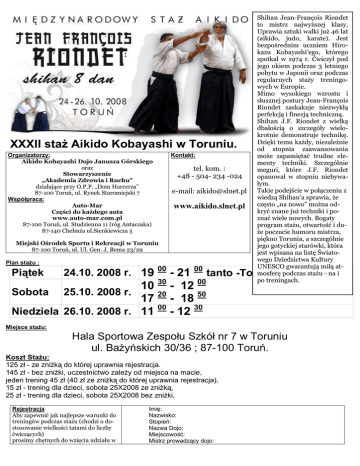 XXXII sttż Aikido Kobtytshi w Toruniu. Kontakt: Organizatorzy: Aikido Kobayashi Dojo Janusza Górskiego oraz Stowarzyszenie „Akademia Zdrowia i Ruchu” działające przy O.P.P. „Dom Harcerza” 87-100 Toruń, ul. Rynek Staromiejski 7 Współpraca: Auto-Mar Części do każdego auta www.auto-mar.com.pl 87-100 Toruń, ul. Studzienna 11 (róg Antaczaka) 87-140 Chełmża ul.Sienkiewicza 5 tel. kom. : +48 - 504- 234 -024 e-mail: [email protected] www.aikido.slnet.pl Miejski Ośrodek Sportu i Rekreacji w Toruniu 87-100 Toruń, ul. Ul. Gen. J. Bema 23/29 Plan stażu : - 21 00 ttnto -Tomiki Aikido 10 30 - 12 00 Sobott 25.10. 2008 r. 17 20 - 18 50 Niedzielt 26.10. 2008 r. 11 00 - 12 30 Piątek 24.10. 2008 r. 19 00 Shihan Jean-François Riondet to mistrz najwyższej klasy. Uprawia sztuki walki już 46 lat (aikido, judo, karate). Jest bezpośrednim uczniem Hirokazu Kobayashi’ego, którego spotkał w 1974 r. Ćwiczył pod jego okiem podczas 3 letniego pobytu w Japonii oraz podczas regularnych staży treningowych w Europie. Mimo wysokiego wzrostu i słusznej postury Jean-François Riondet zaskakuje niezwykłą perfekcją i finezją techniczną. Shihan J.F. Riondet z wielką dbałością o szczegóły wielokrotnie demonstruje technikę. Dzięki temu każdy, niezależnie od stopnia zaawansowania może zapamiętać trudne elementy techniki. Szczególnie meguri, które J.F. Riondet opanował w stopniu niebywałym. Takie podejście w połączeniu z wiedzą Shihan’a sprawia, że często „na nowo” można odkryć znane już techniki i poznać wiele nowych. Bogaty program stażu, otwartość i duże poczucie humoru mistrza, piękno Torunia, a szczególnie jego gotyckiej starówki, która jest wpisana na listę Światowego Dziedzictwa Kultury UNESCO gwarantują miłą atmosferę podczas stażu - na i po treningach. Miejsce stażu: Hala Sportowa Zespołu Szkół nr 7 w Toruniu ul. Bażyńskich 30/36 ; 87-100 Toruń. Koszt Sttżu: 125 zł - ze zniżką do której uprawnia rejestracja. 145 zł - bez zniżki, uczestnictwo zależy od miejsca na macie, jeden trening 45 zł (40 zł ze zniżką do której uprawnia rejestracja), 15 zł - trening dla dzieci, sobota 25X2008 ze zniżką, 25 zł - trening dla dzieci, sobota 25X2008 bez zniżki, Rejestracja Aby zapewnić jak najlepsze warunki do treningów podczas stażu (chodzi o dostosowanie wielkości tatami do liczby ćwiczących) prosimy chętnych do wzięcia udziału w Imię: Nazwisko: Stopień: Nazwa Dojo: Miejscowość: Mistrz prowadzący dojo: stażu o zarejestrowanie się pod [email protected]. podając następujące dane: Po otrzymaniu zgłoszenia zostanie wysłane potwierdzenie i numer konta na które należy przelać wpisowe – 20 zł. Wpisowe upoważnia do zniżki składki stażowej o 20 zł (po 5 zł za trening). Wpisowe nie podlega zwrotowi w przypadku rezygnacji z udziału w stażu. Oczywiście dane osobowe podlegają ochronie ustawowej. Baza Hotelowa Dla uczestników stażu Miejski Ośrodek Sportu i Rekreacji w Toruniu przygotował specjalną ofertę noclegową. Będziemy mogli z niej skorzystać pod warunkiem złożenia zbiorowej rezerwacji. Dlatego chętni do skorzystania z tej oferty powinni jak najszybciej skontaktować się z Januszem Górskim (0504-234-024) aby dokonać rezerwacji. Rezerwacji w Hoteliku przy Pływalni będzie można dokonać do18X2008. Najlepiej gdyby kontaktowali się prowadzący kluby aikido i zgłaszali swoich „podopiecznych”. Hotelik przy Pływalni: adres: ul. Bażyńskich 9/17, 87-100 Toruń telefon: (0-56) 660 62 47 pokoje 2-3 osobowe, łazienka, telewizor i telefon. Na terenie hoteliku znajdują się dwa baseny, sauna, siłownia, solarium, kapsuła odchudzająca, jacuzzi. Goście hotelowi mają bezpłatny wstęp na baseny oraz otrzymują 10 % rabat na inne usługi oferowane ośrodku. Cena dla uczestników stażu 35 zł /osobę. Tanie noclegi oferuje także Dom Wycieczkowy PTTK Toruń 87-100, Legionów 24 tel. (56) 622-38-55, w tej chwili brak miejsc, po 20X może się coś zwolni. Z tańszych hoteli blisko centrum to Hotelik w Centrum 87-100 Toruń ul. Szumana 2 (pl. św. Katarzyny) tel. (056) 652 22 46 fax (056) 652 22 46 „Hotelik położony jest w centrum Torunia 200m od dworca PKP Toruń Miasto i dworca PKP. Parking strzeżony i niestrzeżony. Przytulna atmosfera i miła obsługa gwarantuje udany pobyt w Naszym Hoteliku. Do dyspozycji gości jest również hotelowa restauracja. Kopernik Hotel Garnizonowy 87-100 Toruń ul. Wola Zamkowa 16 tel. 056 616-24-90 Hotel – GOTYK 87-100 Toruń ul. Piekary 20 tel. (0-56) 658-40-00 fax (0-56) 658-40-01 www.hotel-gotyk.com.pl [email protected] Hotel Pod Czarną Różą Toruń 87-100, Rabiańska 11 tel. 56/621-96-37 www.hotelczarnaroza.pl E-mail: [email protected] Hotel Pod Orłem 87-100 Toruń Mostowa 17 tel. (056)622-50-24 Dalej od centrum ale tanie noclegi oferuje: Przedsiębiorstwo Turystyczno – Gastronomiczne Twierdza Toruń Fort IV Schronisko młodzieżowe, restauracja, ul. Chrobrego 86 87-100 Toruń Ceny:15-18 zł tel. 56/ 655-82-36 fax 56/ 658-31-92 www.twierdza.torun.komp.pl [email protected] Można też sprawdzić na stronach: http://miasto.torun.pl/szukaj/ www.it.torun.pl/index.php?d=14&t=1401