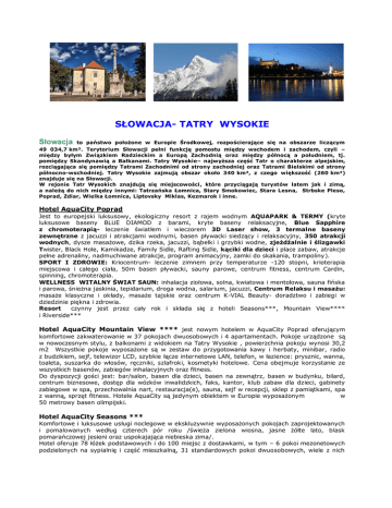 SŁOWACJA- TATRY WYSOKIE Słowacja to państwo położone w Europie Środkowej, rozpościerające się na obszarze liczącym 49 034,7 km². Terytorium Słowacji pełni funkcję pomostu między wschodem i zachodem, czyli – między byłym Związkiem Radzieckim a Europą Zachodnią oraz między północą a południem, tj. pomiędzy Skandynawią a Bałkanami. Tatry Wysokie– najwyższa część Tatr o charakterze alpejskim, rozciągająca się pomiędzy Tatrami Zachodnimi od strony zachodniej oraz Tatrami Bielskimi od strony północno-wschodniej. Tatry Wysokie zajmują obszar około 340 km², z czego większość (260 km²) znajduje się na Słowacji. W rejonie Tatr Wysokich znajdują się miejscowości, które przyciągają turystów latem jak i zimą, a należą do nich między innymi: Tatrzańska Łomnica, Stary Smokowiec, Stara Lesna, Strbske Pleso, Poprad, Zdiar, Wielka Łomnica, Liptovsky Miklas, Kezmarok i inne. Hotel AquaCity Poprad Jest to europejski luksusowy, ekologiczny resort z rajem wodnym AQUAPARK & TERMY (kryte luksusowe baseny BLUE DIAMOD z barami, kryte baseny relaksacyjne, Blue Sapphire z chromoterapią- leczenie światłem i wieczorem 3D Laser show, 3 termalne baseny zewnętrzne z jacuzzi i atrakcjami wodnymi, basen pływacki siedzący i relaksacyjny, 350 atrakcji wodnych, dysze masażowe, dzika rzeka, jacuzzi, bąbelki i grzybki wodne, zjeżdżalnie i ślizgawki Twister, Black Hole, Kamikadze, Family Sidle, Rafting Sidle, kąciki dla dzieci i place zabaw, atrakcje pełne adrenaliny, nadmuchiwane atrakcje, program animacyjny, zamki do skakania, trampoliny). SPORT I ZDROWIE: Kriocentrum- leczenie zimnem przy temperaturze -120 stopni, krioterapia miejscowa i całego ciała, 50m basen pływacki, sauny parowe, centrum fitness, centrum Cardin, spinning, chromoterapia. WELLNESS WITALNY ŚWIAT SAUN: inhalacja ziołowa, solna, kwiatowa i mentolowa, sauna fińska i parowa, śnieżna jaskinia, tepidarium, droga wodna, salarium, jacuzzi, Centrum Relaksu i masażu: masaże klasyczne i okłady, masaże tajskie oraz centrum K-VIAL Beauty- doradztwo i zabiegi w dziedzinie piękna i zdrowia. Resort czynny jest przez cały rok i składa się z hoteli Seasons***, Mountain View**** i Riverside*** Hotel AquaCity Mountain View **** jest nowym hotelem w AquaCity Poprad oferującym komfortowe zakwaterowanie w 37 pokojach dwuosobowych i 4 apartamentach. Pokoje urządzone są w nowoczesnym stylu, z balkonami z widokiem na Tatry Wysokie , powierzchnia pokoju wynosi 30,2 m2 Wszystkie pokoje wyposażone są w zestaw do przygotowania kawy i herbaty, minibar, radio z budzikiem, sejf, telewizor LCD, szybkie łącze internetowe LAN, telefon, w łazience: prysznic, wanna, toaleta, suszarka do włosów, ręczniki, szlafroki, kosmetyki hotelowe. Cena obejmuje korzystanie ze wszystkich basenów, zabiegów inhalacyjnych oraz fitness. Do dyspozycji gości jest: bar/salon, basen dla dzieci, basen na zewnątrz, basen w budynku, bilard, centrum biznesowe, dostęp dla wózków inwalidzkich, faks, kantor, klub zabaw dla dzieci, gabinety zabiegowe w spa, przechowalnia nart, restauracja(e), sauna, sejf w recepcji, sklep z pamiątkami, spa z wanną, sprzęt fitness. Hotele AquaCity są jedynym obiektem w Europie wyposażonym w 50 metrowy basen olimpijski. Hotel AquaCity Seasons *** Komfortowe i luksusowe usługi noclegowe w ekskluzywnie wyposażonych pokojach zaprojektowanych i pomalowanych według czterech pór roku /świeża zielona wiosna, jasne żółte lato, blask pomarańczowej jesieni oraz uspokajająca niebieska zima/. Hotel oferuje 78 łóżek podstawowych i do 100 miejsc z dostawkami, w tym – 6 pokoi mezonetowych podzielonych na sypialnię i część mieszkalną, 31 standardowych pokoi dwuosobowych, wiele z nich posiada drzwi łączące z sąsiednim pokojem, co jest doskonałe dla rodzin z dziećmi, apartament oraz luksusowy apartament prezydencki. Wysoki standard wyposażenia uzupełnia zaawansowany system kart zabezpieczających, TV z łączem internetowym, telefon, minibar, lodówka i komfortowe łazienki. Do dyspozycji gości: bar/salon, basen dla dzieci, basen na zewnątrz, basen w budynku, bilard, centrum biznesowe, dostęp dla wózków inwalidzkich, faks, kantor, klub zabaw dla dzieci, gabinety zabiegowe w spa, przechowalnia nart, restauracja(e), sauna, sejf w recepcji, sklep z pamiątkami, spa z wanną, sprzęt fitness, 50 metrowy basen olimpijski. CENY w PLN za pokój/ doba Poza sezonem MOUNTAIN VIEW POK. 1 OS. 538,POK. 2 OS. 675,APARTAMENT 1247,POK. MEZONETOWY APARTAMENT DELUXE DOSTAWKA 315,- SEASONS 494,630,940,856,1247,230,- Sezon MOUNTAIN VIEW 710,810,1515,315,- SEASONS 625,720,1250,988,1515,230,- Poza sezonem: 16.03-30.06 ; 01.09 – 21.12.2014 Sezon: 04.01 – 15.03; 01.07 – 31.08; 22.12-25.12.2014 CENY OBEJMUJĄ: - śniadania i obiadokolacje w formie szwedzkich stołów w restauracji High Tatras (kolacja nie zawiera napojów) - darmowe połączenie internetowe Wi-Fi na recepcji i w barach, internet LAN w pokojach - kawa i herbata w pokojach - hotelowy parking - lokalna opłata - ubezpieczenie KL i NNW - dzieci do lat 5,99 bezpłatnie w pokoju z rodzicami bez oddzielnego łóżka - Wejście do parku wodnego i strefy wellness: Strefa VITAL: Witalny świat z saunami, inhalacje i aromaterapia, śnieżna jaskinia, tepidarium, jacuzzi Strefa AQUA: wolne wejście do basenów parku wodnego – 3 zewnętrzne baseny termalne, baseny Blue Diamond z barami, baseny Blue Sapphire z wieczornym pokazem Laser show, atrakcje wodne, zjeżdżalnie + Sezon letni - baseny Piramida Majów (zewnętrzne baseny i zjeżdżalnie, basen dla dzieci) Strefa SPORT: 50 m basen pływacki, sauny parowe FITNESS centrum Dla odwiedzających gości są w AquaCity dostępne: KĄCIKI DLA DZIECI - plac zabaw Oskara w recepcji hotela, plac zabaw dla dzieci w kawiarni Café & Wine na 1. piętrze, plac zabaw w basenach Blue Sapphire ANIMACJE - latem w ciągu dnia, w okresie zimowym i poza sezonem programy weekendowe dla dzieci