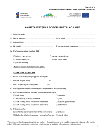 Załącznik Nr 1 do regulaminu naboru ankiet w ramach projektu w zakresie OZE ANKIETA WSTĘPNA DOBORU INSTALACJI OZE 1. Imię i nazwisko: ….………..………………...........…..………………………………………………………………….. 2. Numer telefonu: ………………….……………….…….. Adres email: ………………………………………….. 3. Adres obiektu: .…..............………………………………………….……………………………….………………...… 4. Nr. działki: ……………………..………..…………..….. 6. Preferowany rodzaj instalacji OZE 5. Numer dowodu osobistego: ..……………………… 1 □ kolektory słoneczne □ pompa ciepła (OC) □ piec na biomasę □ panele fotowoltaiczne □ pompa ciepła (cwu) Wybrane rodzaje instalacji można łączyć. KOLEKTORY SŁONECZNE 1. Liczba osób stale przebywających w budynku: …….... 2. Roczne zużycie wody: ......................................m3 3. Ilość zużywanego rocznie paliwa: ….………. ton 4. Rodzaj paliwa obecnie używanego do podgrzewania wody użytkowej: ………………………………………….. 5. Proponowane miejsce instalacji kolektorów słonecznych: □ dach płaski □ dach skośny strona południowa □ dach skośny strona południowo-wschodnia □ dach skośny strona południowo-zachodnia □ elewacja □ grunt □ budynek gospodarczy □ balkon/taras 6. Pokrycie dachu: □ dachówka: ceramiczna / karpiówka / cementowa □ ondulina □ blacha: karpiówka / trapezowa / płaska /profilowana □ eternit: falisty Wybór ten ma charakter poglądowy i nie jest wiążący – Gmina informuje, że do projektu mogą zostać włączone tylko niektóre rodzaje OZE, o czym zainteresowani zostaną poinformowani na spotkaniu informacyjnym z mieszkańcami 1 1 Załącznik Nr 1 do regulaminu naboru ankiet w ramach projektu w zakresie OZE □ □ eternit: płaski □ kotłowania, □ pomieszczenie gospodarcze □ ocieplone poddasze □ pomieszczenie mieszkalne gont / papa 7. Planowane miejsce na podgrzewacz solarny: 8. Wymiary pomieszczenia na podgrzewacz solarny: szerokość ….…. długość….…. wysokość…….. 9. Szerokość drzwi pomieszczenia przygotowanego na podgrzewacz solarny:………,….. m 10. Czy w pomieszczeniu, gdzie będzie znajdował się zbiornik c.w.u. doprowadzony jest prąd? □ Tak □ Nie 11. Czy w pomieszczeniu, gdzie będzie znajdował się zbiornik c.w.u., jest możliwość podłączenia się do ciepłej i zimnej wody użytkowej? □ Tak □ Nie – podać szacunkową odległość………..……m 12. Czy obecnie na instalacji jest zamontowany reduktor ciśnienia? □ tak □ nie 13. Czy istnieje instalacja odgromowa w budynku? □ tak □ nie 14. Istniejące źródło ciepła dla podgrzania ciepłej wody użytkowej: □ kocioł gazowy 1-funkcyjny z wolnostojącym zasobnikiem □ kocioł gazowy 1-funkcyjny ze zintegrowanym zasobnikiem □ kocioł na paliwo stałe węgiel □ kocioł olejowy □ kocioł gazowy 2-funkcyjny □ kocioł gazowy gaz ziemny / płynny □ kocioł na paliwo stałe opalany biomasą □ przepływowy podgrzewacz wody □ pojemnościowy podgrzewacz wody PANELE FOTOWOLTAICZNE 1. Moc umowna (przyłączeniowa)2 ………. Zużycie energii elektrycznej w gospodarstwie domowym na podstawie rachunków za energię elektryczną 2015 r. Wyszczególnienie Zużycie w okresach rozliczeniowych 3 w 2015 r. Zużycie rzeczywiste [kWh] Zużycie prognozowane [kWh] Styczeń Luty Moc umowna wynika z podpisanej umowy z operatorem systemu dystrybucyjnego oraz jest wyrażona w [kW]. Często występuje w fakturach za energię elektryczną pod pozycją „moc umowna” lub w pozycji „ilość” przy opłacie sieciowej stałej lub przy opłacie przejściowej 3 Zużycie proszę podać na poszczególne okresy obliczeniowe (miesięczne, dwumiesięczne, kwartalne, roczne) 2 2 Marzec Kwiecień Maj Czerwiec Lipiec Sierpień Wrzesień Październik Listopad Grudzień Razem w roku 2. Proponowane miejsce instalacji paneli fotowoltaicznych □ dach płaski □ dach skośny strona południowa □ dach skośny strona południowo-wschodnia □ dach skośny strona południowo-zachodnia □ elewacja □ grunt □ budynek gospodarczy □ balkon/taras 3. Pokrycie dachu: □ dachówka: ceramiczna / karpiówka / cementowa □ ondulina □ blacha: karpiówka / trapezowa / płaska /profilowana □ eternit: falisty □ gont / papa □ eternit: płaski POMPA CIEPŁA 1. Powierzchnia / kubatura domu: .……..m2 / ….……m3 2. Moc istniejącego kotła: ……………………….…... kW 3. Ilość zużywanego rocznie paliwa: ….………. ton 4. Liczba osób stale przebywających w budynku:…….... 5. Roczne zużycie wody: ......................................m3 6. Rodzaj paliwa obecnie używanego do podgrzewania wody użytkowej: ………………………………………….. 7. Rodzaj paliwa obecnie używanego do ogrzewania domu: ……………………………………………………….…. 3 KOCIOŁ NA BIOMASĘ 1. Powierzchnia / kubatura domu: .……..m2 / ….……m3 2. Ilość zużywanego rocznie paliwa: ….………. ton 3. Moc istniejącego kotła: ……………………….…... kW 4. Rodzaj paliwa obecnie używanego do podgrzewania wody użytkowej: ………………………………………….. 5. Rodzaj paliwa obecnie używanego do ogrzewania domu: ……………………………………………………….…. 6. Wymiary kotłowni lub miejsca przeznaczonego na kocioł: szerokość….…. długość….…. wysokość…….. 7. Czy kocioł grzeje ciepłą wodę użytkową? □ tak □ nie …………………………..…………………………………………….. DATA I CZYTELNY PODPIS BENEFICJENTA Niniejszym wyrażam zgodę na przetwarzanie danych osobowych zawartych w niniejszej ankiecie na potrzeby prawidłowej realizacji projektu zgodnie 