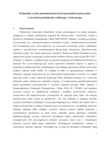 Wskaźniki ryzyka ponadnormatywnych pozostałości pestycydów w żywności pochodzenia roślinnego i zwierzęcego. 1. Wprowadzenie Konieczność stosowania wskaźników ryzyka, pozwalających na pomiar postępów osiąganych w zakresie zmniejszenia zagrożeń dla zdrowia ludzi i środowiska, wynika z Dyrektywy Parlamentu Europejskiego i Rady 2009/128/WE. Zgodnie z dyrektywą preferuje się stosowanie tzw. „zharmonizowanych wskaźników ryzyka”, ujednoliconych na poziomie Unii Europejskiej, przy czym dopuszcza się stosowanie równolegle innych wskaźników zgodnie ze specyficznymi uwarunkowaniami danego kraju. Dotychczas „zharmonizowane wskaźniki ryzyka” nie zostały opracowane. Zgodnie z Krajowym Planem Działania na rzecz ograniczenia ryzyka związanego ze stosowaniem środków ochrony roślin na lata 2013-2017 Działanie 7, Zadanie 2, publikowanym na stronach internetowych Ministerstwa Rolnictwa i Rozwoju Wsi (www.minrol.gov.pl), należy opracować wskaźniki krajowe w oparciu o prowadzone badania kontrolne, monitoringowe oraz badania statystyczne obrotu i stosowania środków ochrony roślin (ŚOR). Ze względu na fakt, że najważniejszym zadaniem w dziedzinie zagrożeń pestycydowych jest zapewnienie bezpieczeństwa żywności (co zostało ujęte jako jeden z celów głównych Krajowego Planu Działania) przyjęto, że w pierwszej kolejności należy zdefiniować wskaźniki związane z występowaniem ponadnormatywnych stężeń pozostałości pestycydowych w żywności (stężenia powyżej NDP). Zgodnie z Rozporządzeniem Parlamentu Europejskiego i Rady (WE) Nr 178/2002, pod pojęciem żywności rozumie się „jakiekolwiek substancje i produkty, przetworzone, częściowo przetworzone lub nieprzetworzone, przeznaczone do spożycia przez ludzi, lub których spożycia przez ludzi można się spodziewać”. Tak więc definicja ta obejmuje zarówno żywność pochodzenia roślinnego i zwierzęcego znajdującą się w handlu, jak i płody rolne w miejscu powstawania (u rolnika). Natomiast pasze nie mieszczą się w tej definicji. Ponieważ definicja obejmuje kilka rodzajów żywności, których krajowe badania kontrolne i monitoringowe prowadzone są przez różne jednostki, oprócz głównego wskaźnika charakteryzującego sytuację całościowo przydatnym będzie opracowanie wskaźników szczegółowych (dla poszczególnych rodzajów żywności), które wraz z wskaźnikiem głównym tworzyć będą grupę wskaźników obrazujących kompleksowo sytuację w omawianym obszarze zagrożeń. Przewiduje się, że bazą do określenia wskaźników będą 1 wyniki badań kontrolnych i monitoringowych prowadzonych w kraju przez kilka jednostek, podanych w punkcie 2. Jakość tych badań ma istotne znaczenie dla uzyskania reprezentatywnych wartości omawianych wskaźników. 2. Cele utworzenia wskaźników Celem głównym utworzenia omawianej grupy wskaźników jest zobrazowanie za pomocą konkretnych wartości liczbowych corocznych zmian w zakresie bezpieczeństwa pestycydowego żywności na rynku krajowym, natomiast celem pomocniczym zobrazowanie postępów w zakresie jakości prowadzonych badań kontrolnych i monitoringowych pozostałości ŚOR w żywności. Przewiduje się utworzenie wskaźnika głównego obrazującego całościowo sytuację w zakresie bezpieczeństwa pestycydowego żywności oraz czterech wskaźników szczegółowych obrazujących: - bezpieczeństwo żywności pochodzenia roślinnego znajdującej się w handlu - na podstawie monitoringu prowadzonego przez Państwową Inspekcję Sanitarną, - bezpieczeństwo żywności pierwotnej pochodzenia roślinnego (płodów rolnych) - na podstawie monitoringu prowadzonego w miejscu wytwarzania przez Państwową Inspekcję Ochrony Roślin i Nasiennictwa, - bezpieczeństwo żywności pochodzenia zwierzęcego - na podstawie monitoringu prowadzonego przez Państwową Inspekcję Sanitarną i Inspekcję Weterynaryjną, - bezpieczeństwo żywności dla niemowląt - na podstawie monitoringu prowadzonego przez Państwową Inspekcję Sanitarną. Piątym wskaźnikiem szczegółowym może być wskaźnik, utworzony na podstawie danych uzyskanych z monitoringu żywności pochodzenia roślinnego, zwierzęcego i żywności dla niemowląt, prowadzonego przez Państwową Inspekcję Sanitarną, którego wyniki przekazywane są do Urzędu ds. Bezpieczeństwa Żywności (EFSA). Wskaźnik ten byłby inną formą przedstawienia danych wykorzystywanych również w pierwszych czterech wskaźnikach szczegółowych. 3. Założenia dotyczące konstrukcji wskaźników Podstawową miarą bezpieczeństwa pestycydowego żywności jest liczba nieprawidłowości wykrytych w ramach kontroli urzędowej, w stosunku do liczby przebadanych próbek. Im niższy wskaźnik tym lepsza sytuacja. Jako „nieprawidłowość” jest tutaj rozumiane przekroczenie najwyższego dopuszczalnego poziomu pozostałości ŚOR w żywności (NDP), uregulowanego przepisami unijnymi. Ponieważ urzędowa kontrola 2 pozostałości prowadzona jest przez kilka niezależnych jednostek w niezależnych laboratoriach, przy obliczaniu wskaźnika konieczne jest uwzględnienie możliwości badawczych (jakości badań) poszczególnych laboratoriów. Konstrukcja wskaźnika powinna uzależniać uzyskany wynik (wartość wskaźnika) od jakości badań, wyrażonej przez współczynnik jakości badań. Im gorsza jakość badań (niższy współczynnik jakości badań), tym wyższy (gorszy) wskaźnik. Do oceny jakości badań można posłużyć się wykazem substancji czynnych objętych unijnym wieloletnim programem kontroli mającym na celu zapewnienie zgodności z najwyższymi dopuszczalnymi poziomami pozostałości pestycydów w żywności pochodzenia roślinnego i zwierzęcego, regulowanym rozporządzeniami unijnymi - ostatnie (UE) Nr 788/2012 z dnia 31 sierpnia 2012 r. Rozporządzenie zawiera wykazy substancji czynnych (oddzielnie dla produktów pochodzenia roślinnego i zwierzęcego), mających is