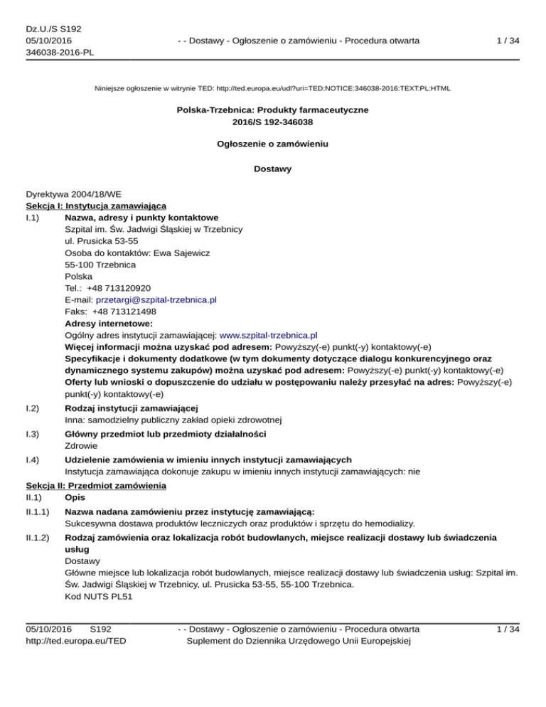 Dz.U./S S192 05/10/2016 346038-2016-PL - - Dostawy - Ogłoszenie o zamówieniu - Procedura otwarta 1 / 34 Niniejsze ogłoszenie w witrynie TED: http://ted.europa.eu/udl?uri=TED:NOTICE:346038-2016:TEXT:PL:HTML Polska-Trzebnica: Produkty farmaceutyczne 2016/S 192-346038 Ogłoszenie o zamówieniu Dostawy Dyrektywa 2004/18/WE Sekcja I: Instytucja zamawiająca I.1) Nazwa, adresy i punkty kontaktowe Szpital im. Św. Jadwigi Śląskiej w Trzebnicy ul. Prusicka 53-55 Osoba do kontaktów: Ewa Sajewicz 55-100 Trzebnica Polska Tel.: +48 713120920 E-mail: [email protected] Faks: +48 713121498 Adresy internetowe: Ogólny adres instytucji zamawiającej: www.szpital-trzebnica.pl Więcej informacji można uzyskać pod adresem: Powyższy(-e) punkt(-y) kontaktowy(-e) Specyfikacje i dokumenty dodatkowe (w tym dokumenty dotyczące dialogu konkurencyjnego oraz dynamicznego systemu zakupów) można uzyskać pod adresem: Powyższy(-e) punkt(-y) kontaktowy(-e) Oferty lub wnioski o dopuszczenie do udziału w postępowaniu należy przesyłać na adres: Powyższy(-e) punkt(-y) kontaktowy(-e) I.2) Rodzaj instytucji zamawiającej Inna: samodzielny publiczny zakład opieki zdrowotnej I.3) Główny przedmiot lub przedmioty działalności Zdrowie I.4) Udzielenie zamówienia w imieniu innych instytucji zamawiających Instytucja zamawiająca dokonuje zakupu w imieniu innych instytucji zamawiających: nie Sekcja II: Przedmiot zamówienia II.1) Opis II.1.1) Nazwa nadana zamówieniu przez instytucję zamawiającą: Sukcesywna dostawa produktów leczniczych oraz produktów i sprzętu do hemodializy. II.1.2) Rodzaj zamówienia oraz lokalizacja robót budowlanych, miejsce realizacji dostawy lub świadczenia usług Dostawy Główne miejsce lub lokalizacja robót budowlanych, miejsce realizacji dostawy lub świadczenia usług: Szpital im. Św. Jadwigi Śląskiej w Trzebnicy, ul. Prusicka 53-55, 55-100 Trzebnica. Kod NUTS PL51 05/10/2016 S192 http://ted.europa.eu/TED - - Dostawy - Ogłoszenie o zamówieniu - Procedura otwarta Suplement do Dziennika Urzędowego Unii Europejskiej 1 / 34 Dz.U./S S192 05/10/2016 346038-2016-PL - - Dostawy - Ogłoszenie o zamówieniu - Procedura otwarta 2 / 34 II.1.3) Informacje na temat zamówienia publicznego, umowy ramowej lub dynamicznego systemu zakupów (DSZ) Ogłoszenie dotyczy zamówienia publicznego II.1.4) Informacje na temat umowy ramowej II.1.5) Krótki opis zamówienia lub zakupu 1. Przedmiotem zamówienia jest sukcesywna dostawa produktów leczniczych oraz produktów i sprzętu do hemodializy wg potrzeb Zamawiającego. Szczegółowy opis przedmiotu zamówienia stanowi zał. nr 2 do SIWZ, zwany – Formularzem asortymentowo-cenowym. 2. Zamawiający dopuszcza składanie ofert częściowych. Zamówienie składa się z 84 części zwanych dalej pakietami, w tym: PAKIET 1. Albuminy PAKIET 2. Anesthetica PAKIET 3. Anesthetica PAKIET 4. Analgetica PAKIET 5. Anestheticum locale PAKIET 6. Anaesthetica PAKIET 7. Antiarrhythmicum PAKIET 8. Antibiotica PAKIET 9. Antibiotica PAKIET 10. Antibiotica PAKIET 11. Antibiotica PAKIET 12. Antibiotica PAKIET 13. Antibiotica PAKIET 14. Antibiotica PAKIET 15. Antibiotica PAKIET 16. Antibiotica PAKIET 17. Antibiotica PAKIET 18. Antibiotica PAKIET 19. Antibiotica PAKIET 20. Antibiotica PAKIET 21. Antibiotica PAKIET 22. Antibiotica PAKIET 23. Antibiotica PAKIET 24. Anticoagulantia PAKIET 25. Antidotum PAKIET 26. Antiemetica PAKIET 27. Antimycotica PAKIET 28. Antimycoticum PAKIET 29. Antisecretoricum PAKIET 30. Antisecretoricum PAKIET 31. Antisecretoricum PAKIET 32. Calcium PAKIET 33. Chemotherapeutica PAKIET 34. Chemotherapeutica PAKIET 35. Chemotherapeutica PAKIET 36. Czynnik 7. krzepnięcia krwi 05/10/2016 S192 http://ted.europa.eu/TED - - Dostawy - Ogłoszenie o zamówieniu - Procedura otwarta Suplement do Dziennika Urzędowego Unii Europejskiej 2 / 34 Dz.U./S S192 05/10/2016 346038-2016-PL - - Dostawy - Ogłoszenie o zamówieniu - Procedura otwarta 3 / 34 PAKIET 37. Dermatica PAKIET 38. Diagnosticum PAKIET 39. Dobutamine PAKIET 40. Ferrum PAKIET 41. Filgastrim PAKIET 42. Hemostaticum PAKIET 43. Hemostaticum PAKIET 44. Heparinum PAKIET 45. Heparinum PAKIET 46.Varia PAKIET 47. Hormony PAKIET 48. Hormony i leki stosowane w chorobach układu dokrewnego PAKIET 49. Hypnotica PAKIET 50. Immunoglobulinum PAKIET 51. Immunoglobulinum PAKIET 52. Immunoglobulinum PAKIET 53. Immunoglobulinum PAKIET 54. Insuliny PAKIET 55. Lek immunomodulujący PAKIET 56. Leki działające na obwodowy i autonomiczny układ nerwowy PAKIET 57. Leki działające na ośrodkowy układ nerwowy PAKIET 58. Leki przeciwbólowe, przeciwgorączkowe, przeciwzapalne PAKIET 59. Leki stosowane w chorobach układu krążenia i serca; leki działające na układ pokarmowy PAKIET 60. Leki stosowane w chorobach układu oddechowego PAKIET 61. Myorelaxantia PAKIET 62. Myorelaxantia PAKIET 63. Nootropica PAKIET 64. Odżywki PAKIET 65. Opioida PAKIET 66. Paracetamol PAKIET 67. Preparaty do podawania pozajelitowego PAKIET 68. Smoczki do butelek PAKIET 69. Smoczki do butelek PAKIET 70. Substancje recepturowe PAKIET 71. Hormony i leki stosowane w chorobach układu dokrewnego PAKIET 72. Tacrolimus PAKIET 73. Varia PAKIET 74. Varia PAKIET 75. Varia PAKIET 76. Varia PAKIET 77. Varia PAKIET 78. Varia PAKIET 79. Varia PAKIET 80. Vitamina PAKIET 81. Vitaminum 05/10/2016 S192 http://ted.europa.eu/TED - - Dostawy - Ogłoszenie o zamówieniu - Procedura otwarta Suplement do Dziennika Urzędowego Unii Europejskiej 3 / 34 Dz.U./S S192 05/10/2016 346038-2016-PL - - Dostawy - Ogłoszenie o zamówieniu - Procedura otwarta 4 / 34 PAKIET 82. Preparaty do hemodializy PAKIET 83. Sprzęt do hemodializy PAKIET 84. Testy diagnostyczne. II.1.6) Wspólny Słownik Zamówień (CPV) 33600000, 33181520, 33692800 II.1.7) Informacje na temat Porozumienia w sprawie zamówień rządowych (GPA) Zamówienie jest objęte Porozumieniem w sprawie zamówień rządowych (GPA): nie II.1.8) Części To zamówienie podzielone jest na części: tak Oferty m